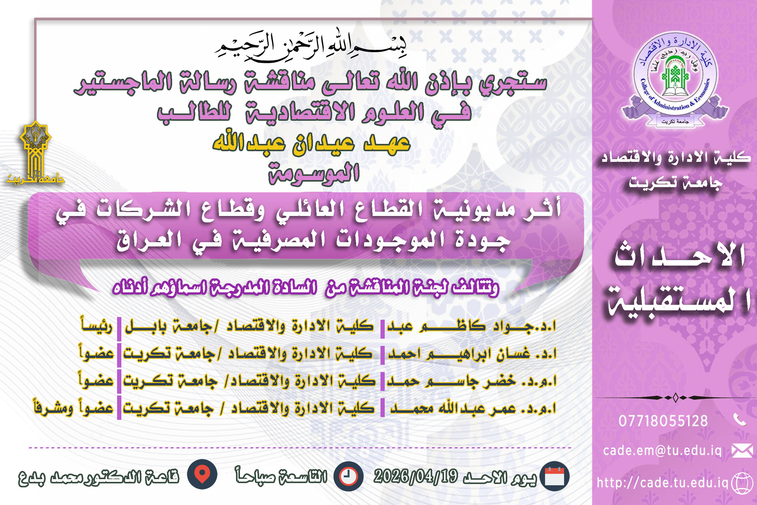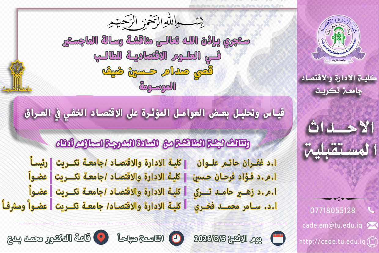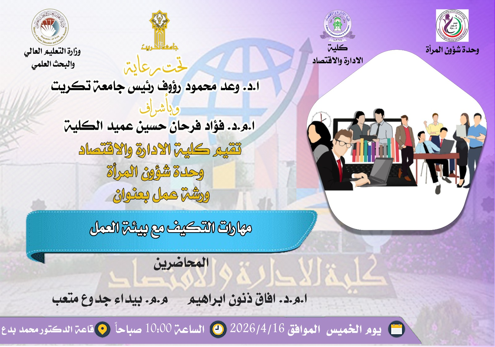 أسست كلية الإدارة والاقتصاد / جامعة تكريت في عام 2000 ، وقد ضمت الكلية في بداية تأسيسها على قسمين علميين فقط هما (قسم إدارة الإعمال , قسم الاقتصاد) وبلغ عدد الطلبة المقبولين في سنة التأسيس (388) طالبا وطالبة، وتضم حالياً ستة اقسام علمية للدراسات الأولية هي (قسم المحاسبة، قسم إدارة الاعمال، قسم الإدارة العامة، قسم المالية والمصرفية، قسم الاقتصاد وقسم إدارة التسويق) وتسعة برامج للدراسات العليا هي (دكتوراه محاسبة، دكتوراه إدارة الاعمال، دكتوراه اقتصاد، ماجستير محاسبة، ماجستير إدارة الاعمال، ماجستير مالية ومصرفية، ماجستير اقتصاد، دبلوم عالي في التخطيط الاستراتيجي معادل للماجستير/ امدة سنتان، دبلوم عالي في التخطيط الاستراتيجي/ سنة واحدة).s