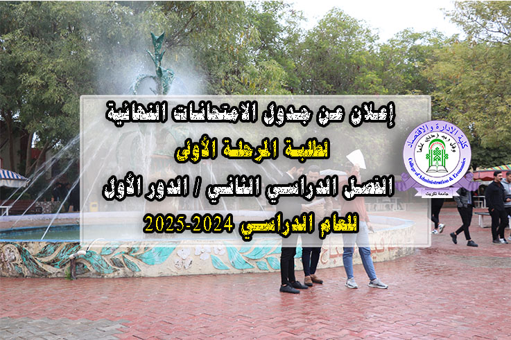 تعلن عمادة كلية الإدارة والاقتصاد عن نشر جدول الامتحانات النهائية لطلبة المرحلة الأولى في الدراسات الأولية (الصباحية والمسائية) للفصل الدراسي الثاني / الدور الأول من العام الدراسي 2024-2025.