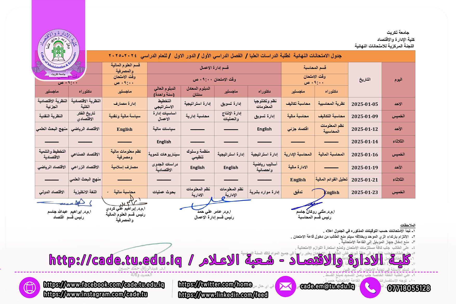 كلية الإدارة والاقتصاد بجامعة تكريت تعلن عن نشر جدول الامتحانات النهائية للفصل الدراسي الثاني / الدور الأول للعام الدراسي 2024-2025