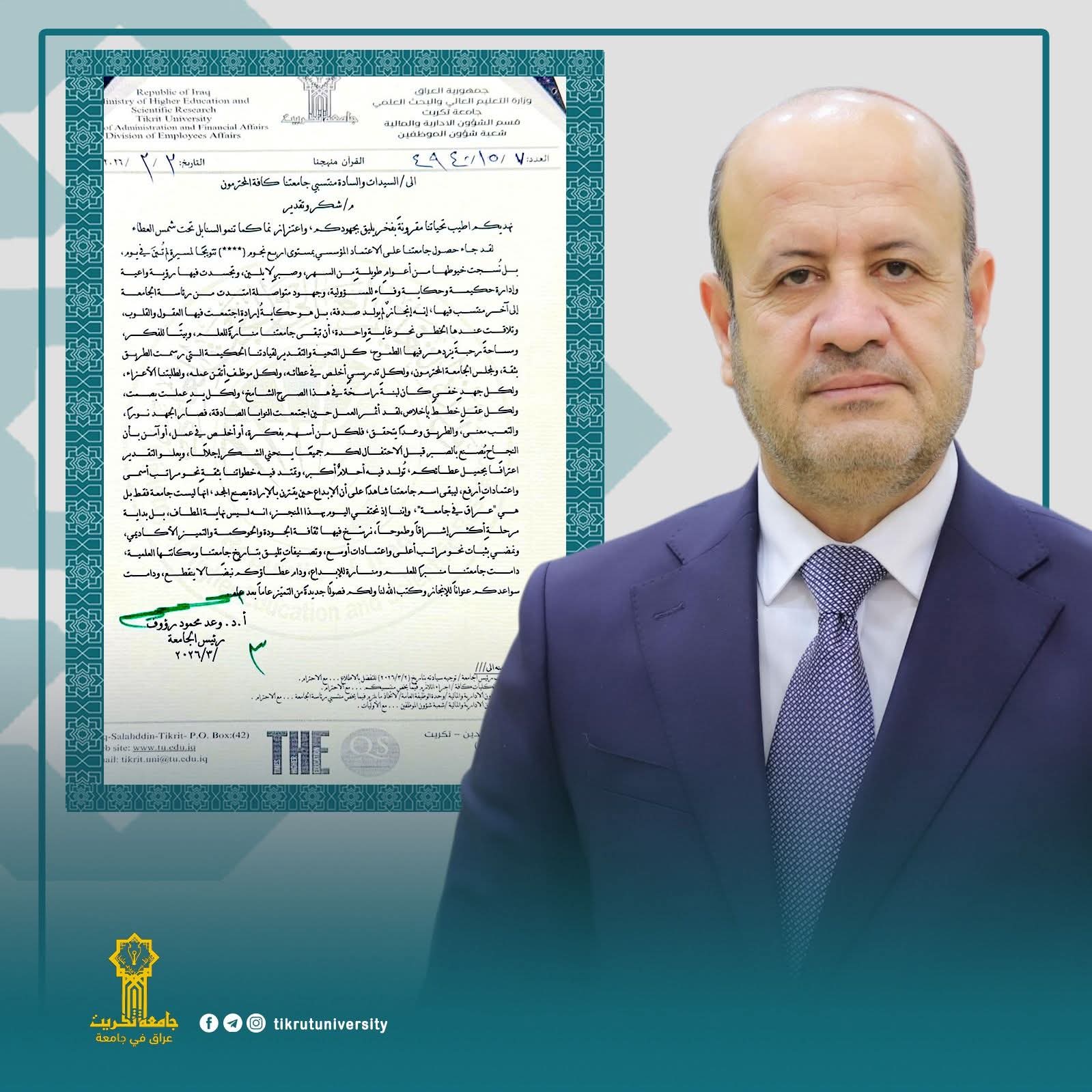 جامعة تكريت في الصدارة... وتحصد أربع نجوم في الاعتماد المؤسسي