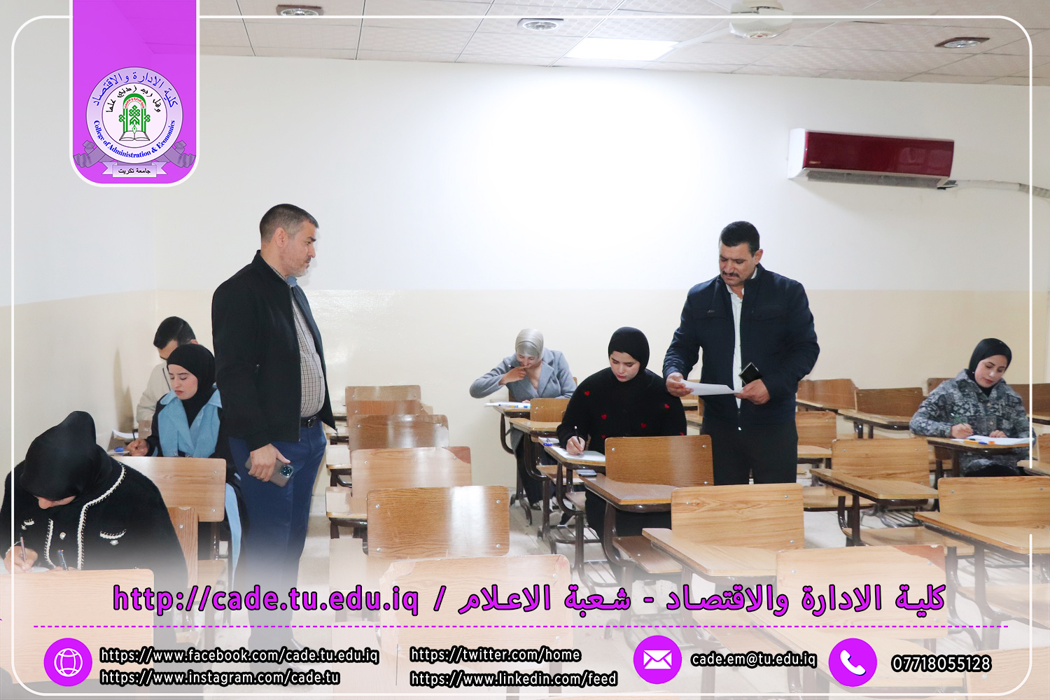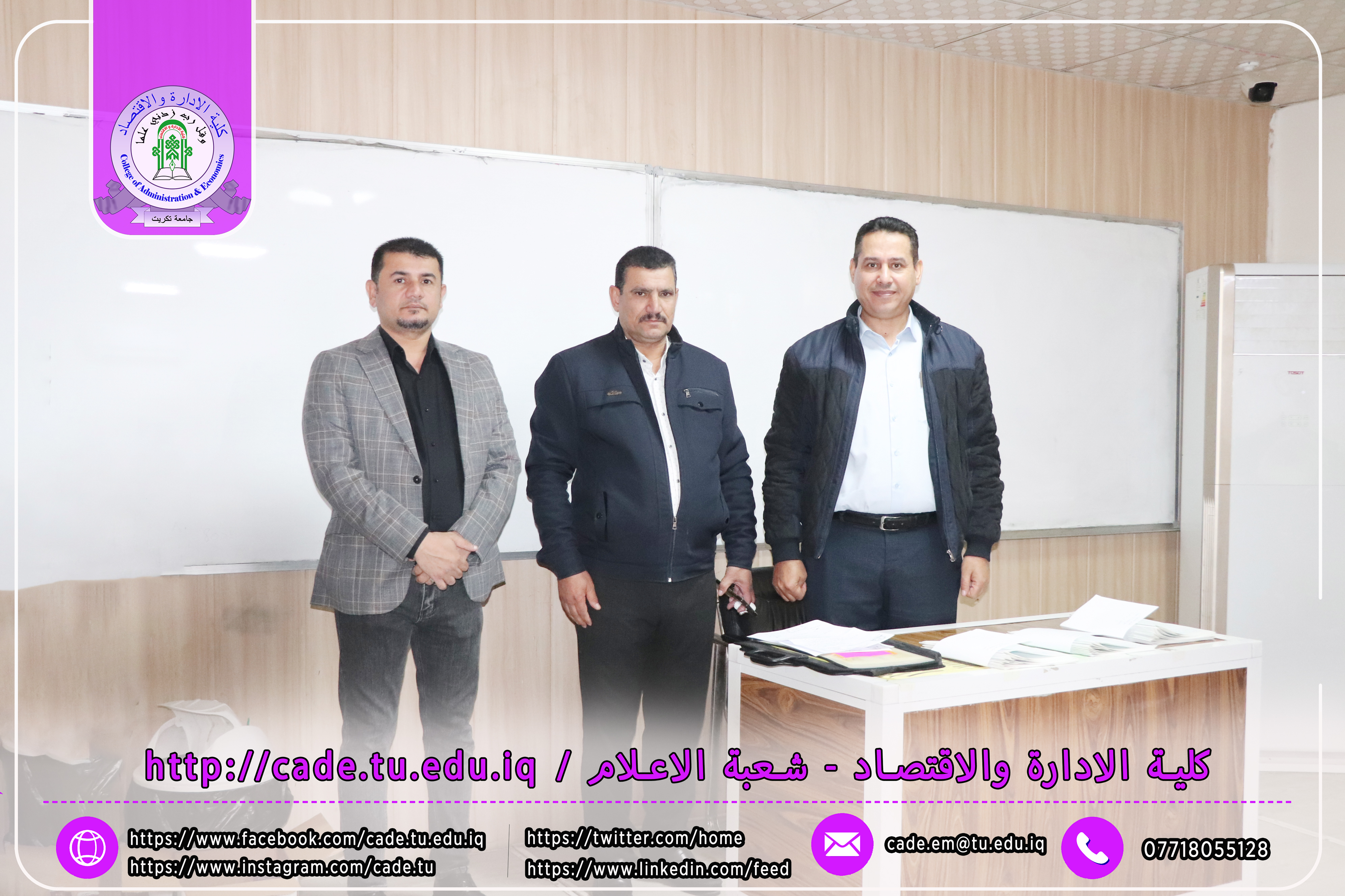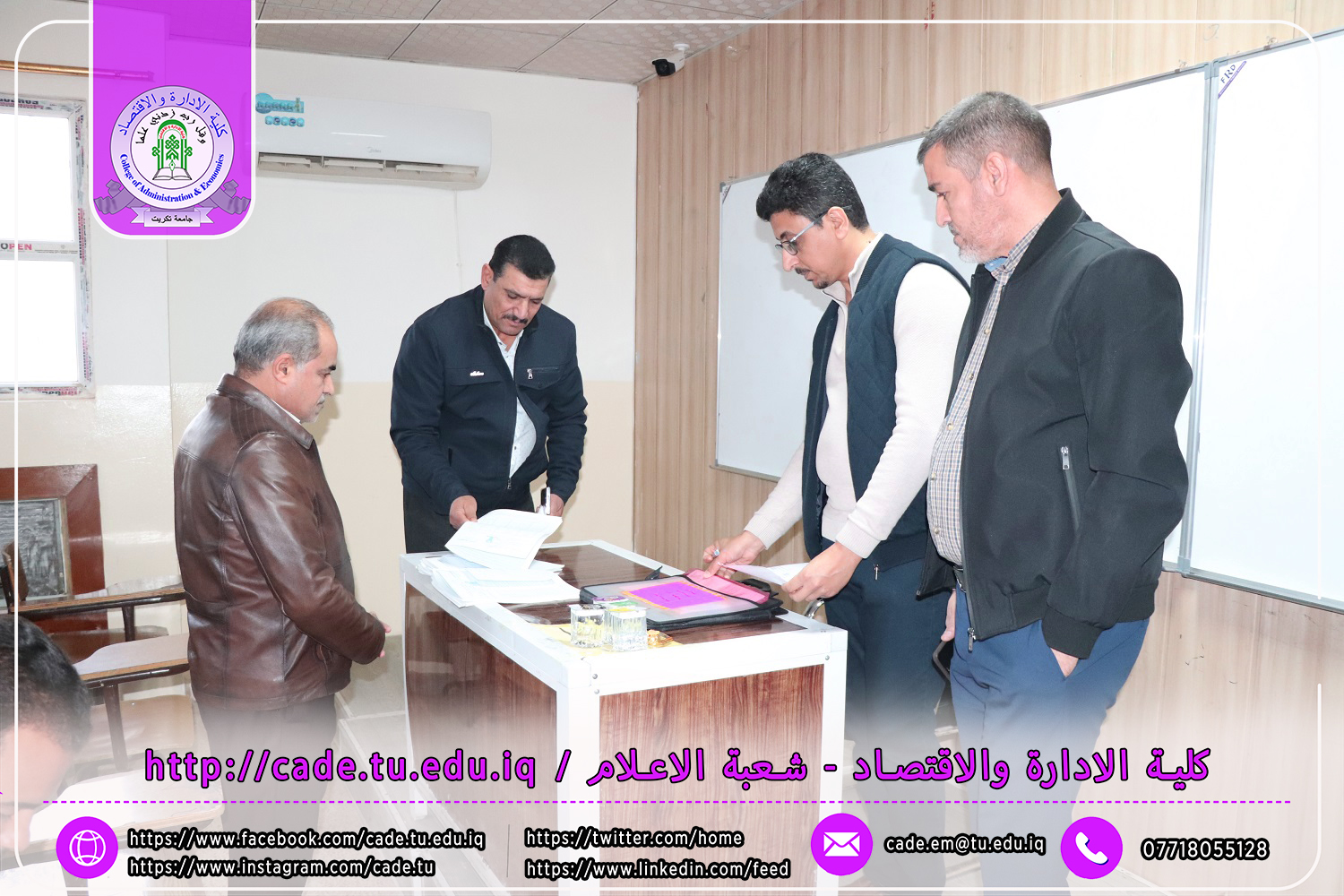 استقبل الأستاذ الدكتور عبدالرزاق حمد حسين، عميد كلية الإدارة والاقتصاد، وبرفقة المدرس المساعد أحمد عايد مخلف، معاون العميد للشؤون الإدارية، اللجنة المركزية الخاصة بمتابعة سير الامتحانات النهائية للفصل الدراسي الأول/ الدور الأول، برئاسة الأستاذ المساعد الدكتور قادر عبد الله شناك، احد اعضاء اللجنة المركزية من رئاسة جامعة تكريت، وذلك يوم السبت الموافق 2024/12/28.