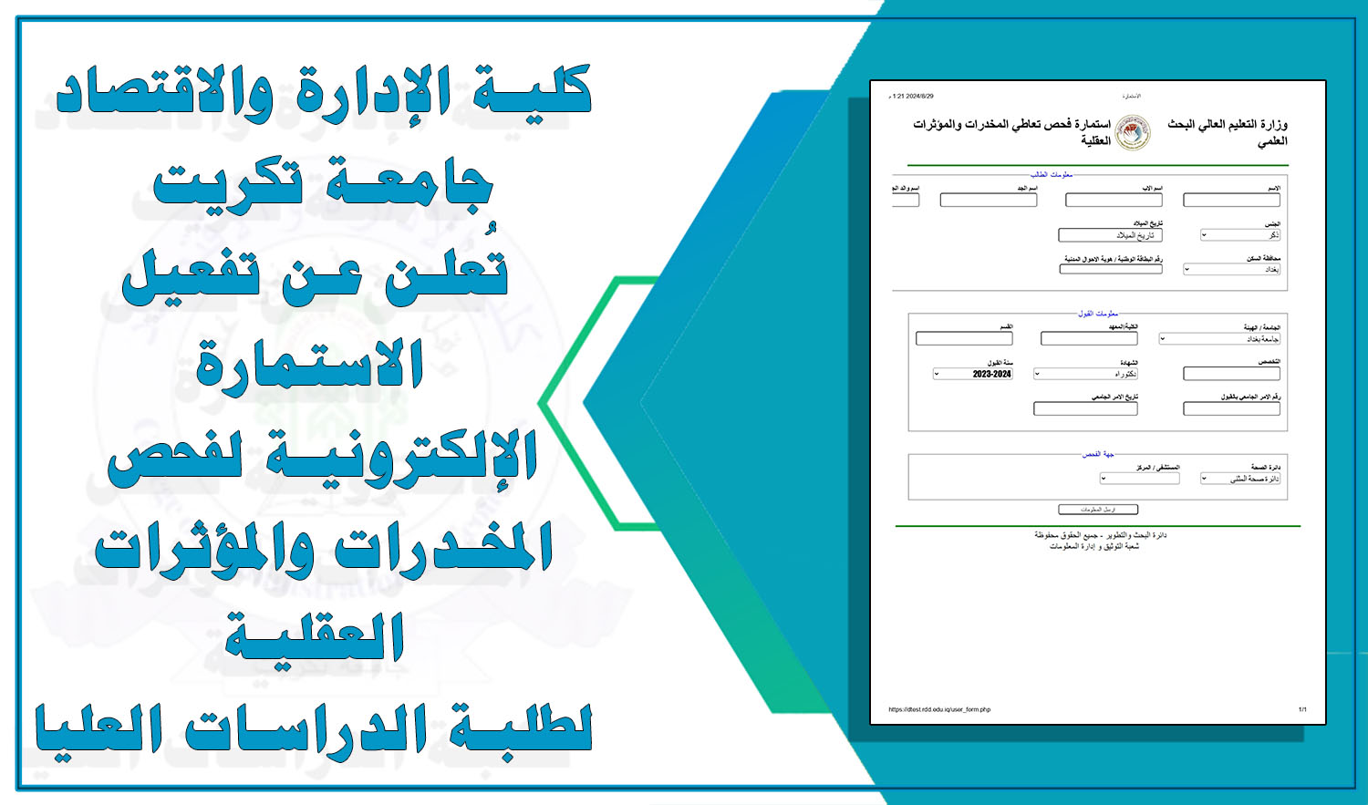 في إطار تنفيذ توجيهات وزارة التعليم العالي والبحث العلمي، تعلن عمادة كلية الإدارة والاقتصاد /جامعة تكريت عن تفعيل الاستمارة الإلكترونية الخاصة بفحص المخدرات والمؤثرات العقلية. يشمل هذا الفحص جميع الطلبة المقبولين في برامج الدراسات العليا للعام الدراسي 2024-2025.