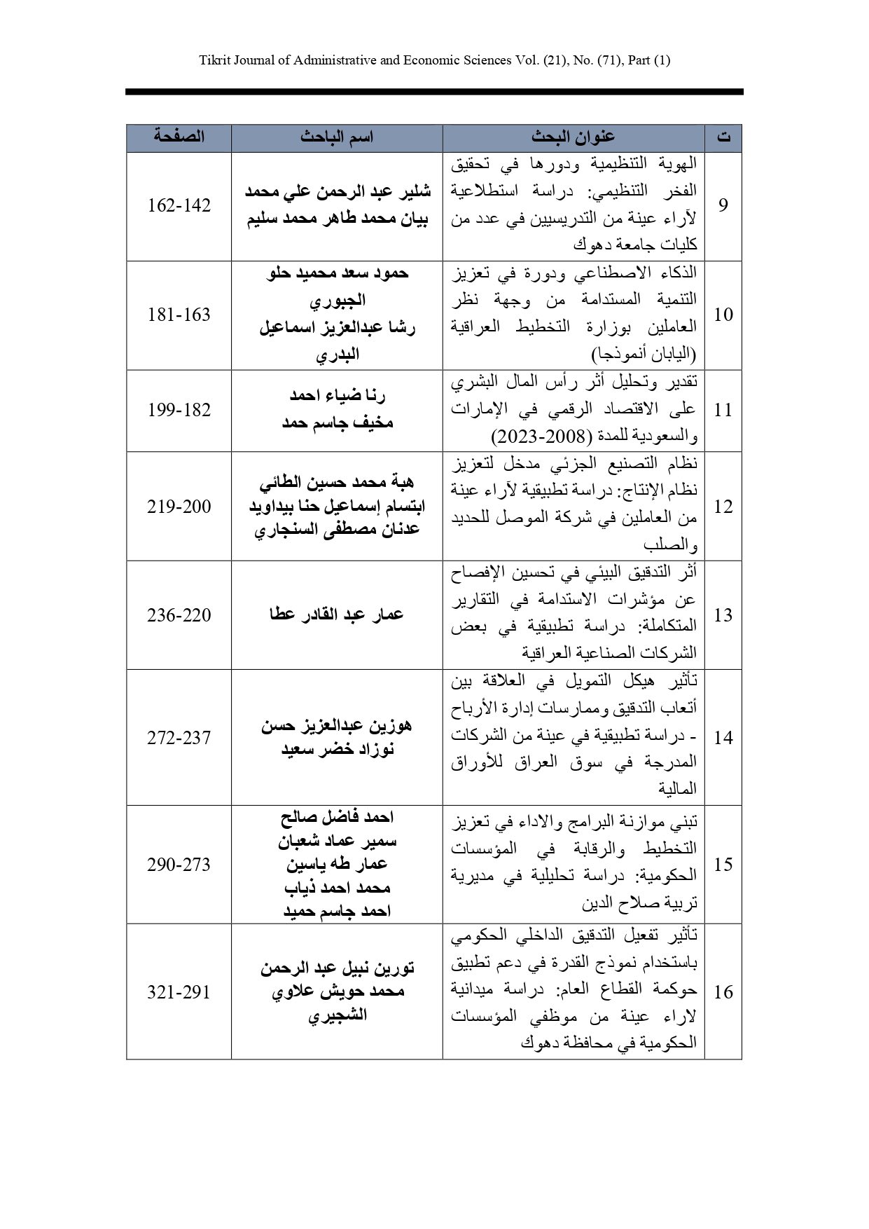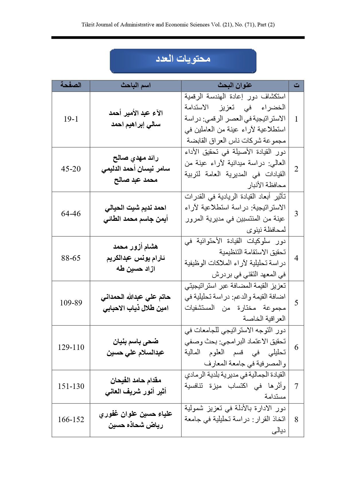 وقد تضمن الجزء الأول من هذا العدد (28) بحثاً علمياً محكّماً تناولت موضوعات متنوعة في المجالات الإدارية والاقتصادية والمالية، أما الجزء الثاني، فقد اشتمل أيضاً على (28) بحثاً وقد أسهمت هذه البحوث في تعزيز المحتوى الأكاديمي وتوسيع آفاق البحث العلمي المتخصص.