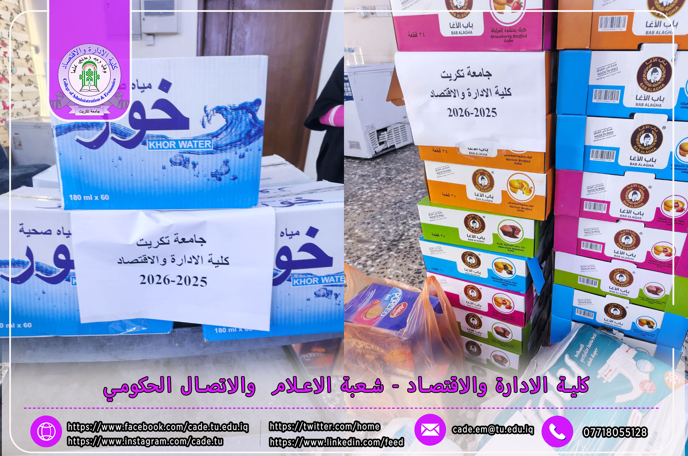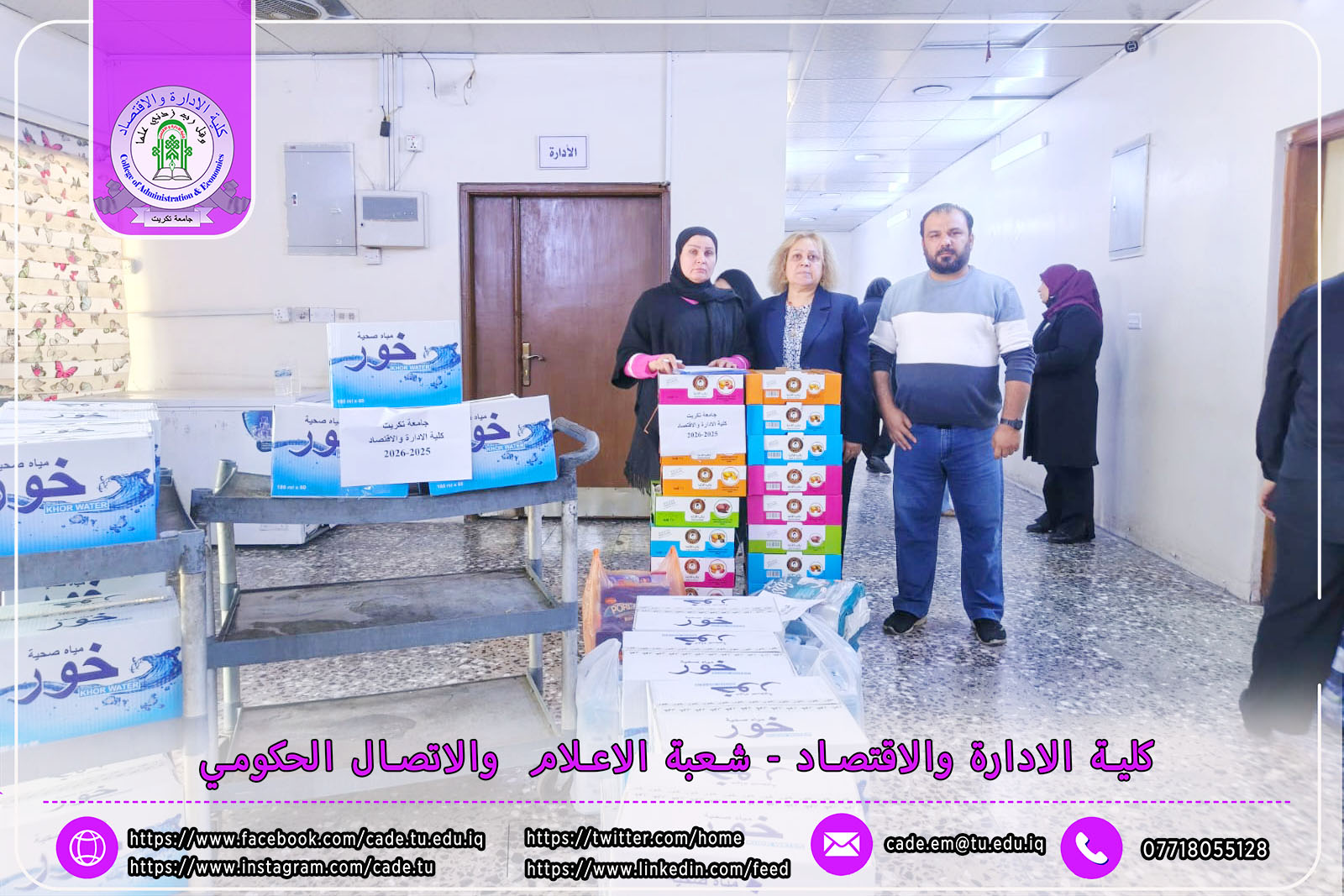 برعاية الأستاذ الدكتور وعد محمود رؤوف رئيس جامعة تكريت، وبإشراف الأستاذ المساعد الدكتور فؤاد فرحان حسين عميد كلية الإدارة والاقتصاد، ودعم عدد من السادة التدريسين كلية الإدارة والاقتصاد في جامعة تكريت ممثلاً عنهم أ. مي حمودي عبدالله، ومن جانب تعزيز إطار روح التكافل الإنساني والمسؤولية المجتمعية، تمت زيارة تطوعية إلى دار الحنان لشديدي العوق وذلك يوم الاحد 23 تشرين الثاني 2025، للاطلاع على أوضاع النزلاء والوقوف على أهم احتياجاتهم الصحية والإنسانية والمعيشية.