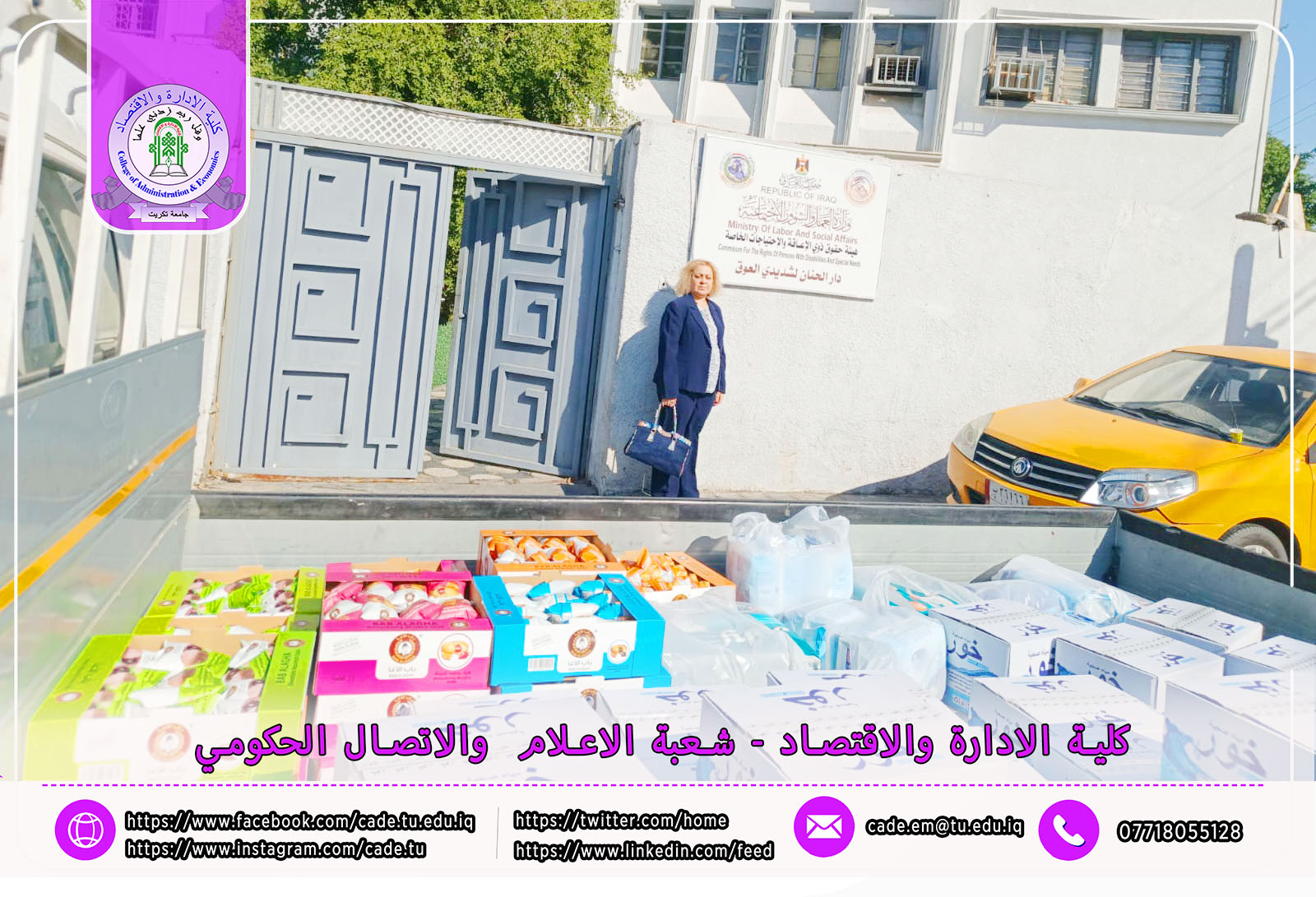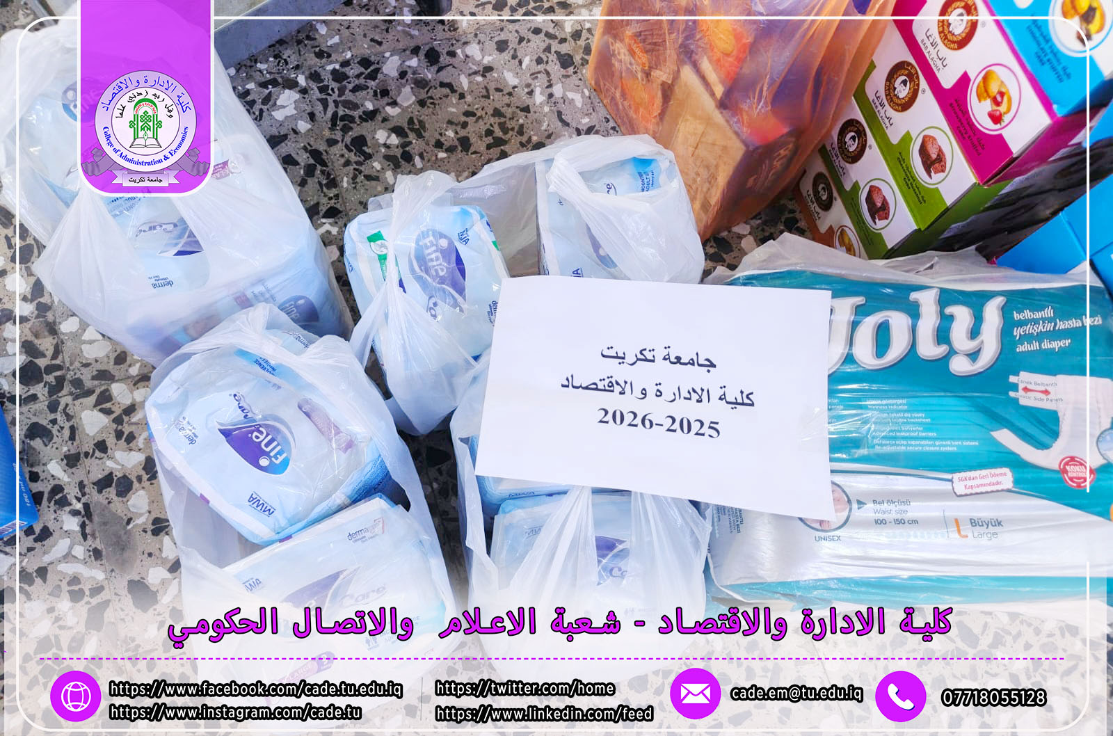 وجاءت هذه المبادرة الإنسانية بإشراف الأستاذة مي حمودي عبدالله، التدريسية في قسم إدارة التسويق، التي تبنّت حملة تبرعات تهدف إلى دعم هذه الشريحة المهمة من المجتمع، والتي تضم كبار السن وذوي الإعاقات المختلفة من الرجال والنساء، ممن لا يمتلكون مأوى أو ممن فقدوا الرعاية الأسرية.