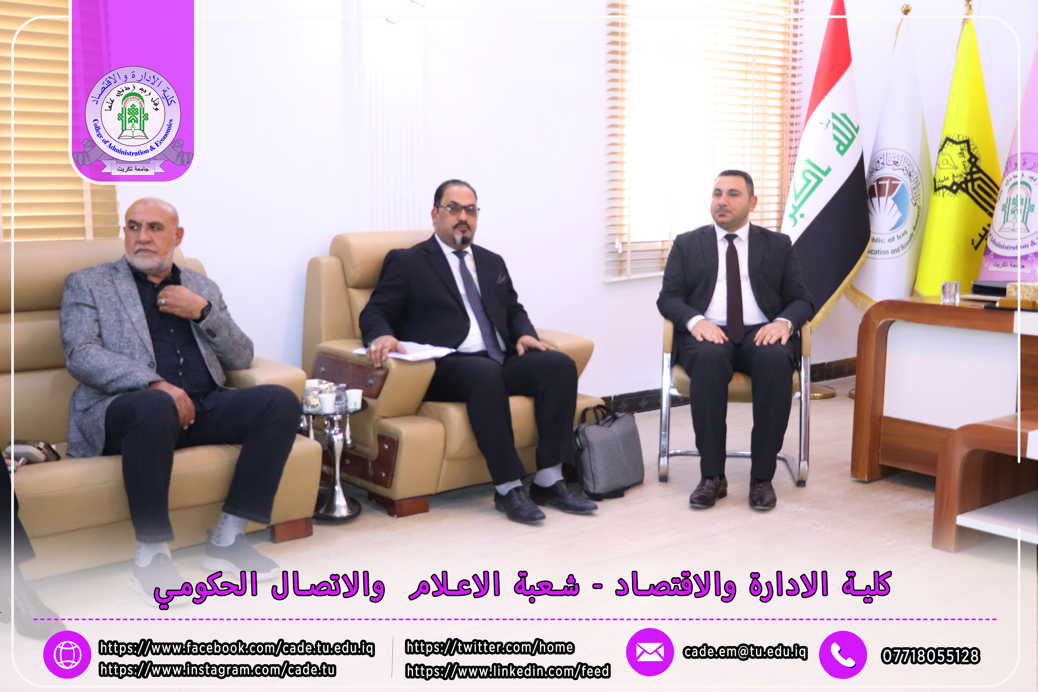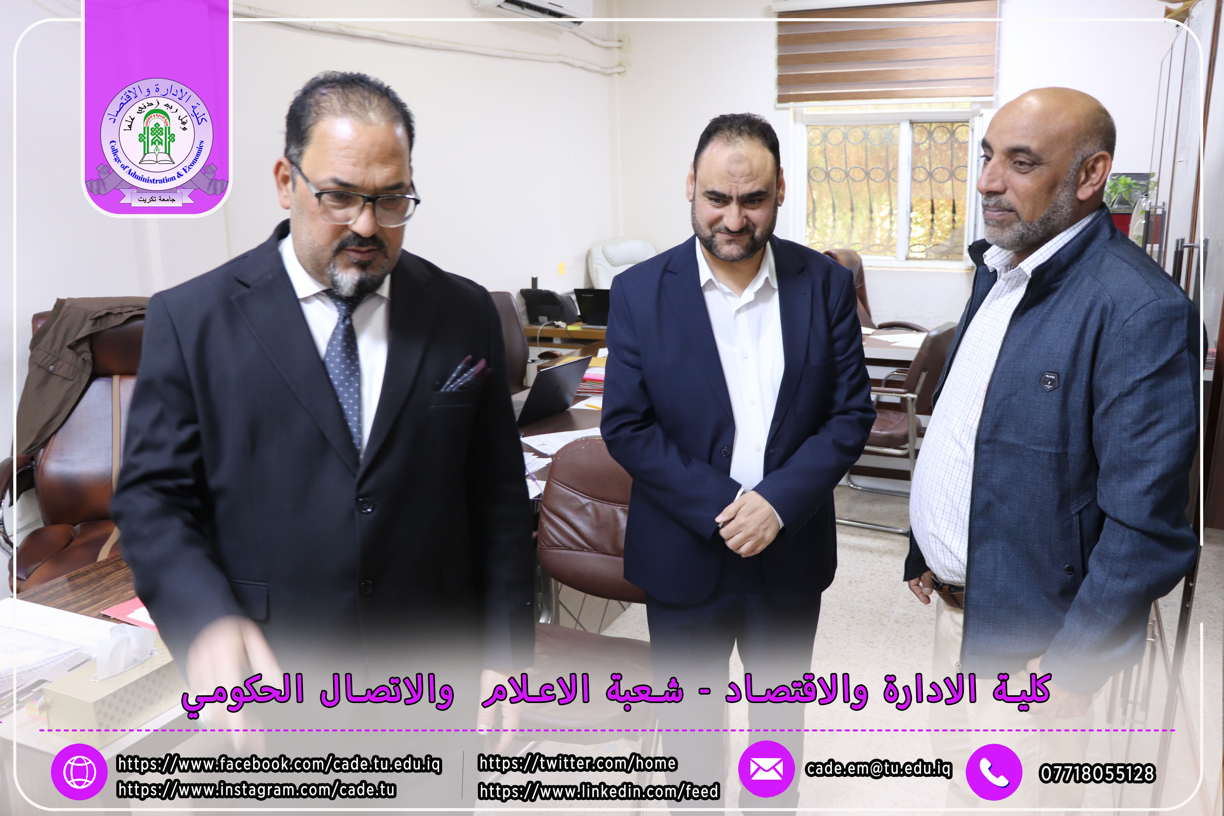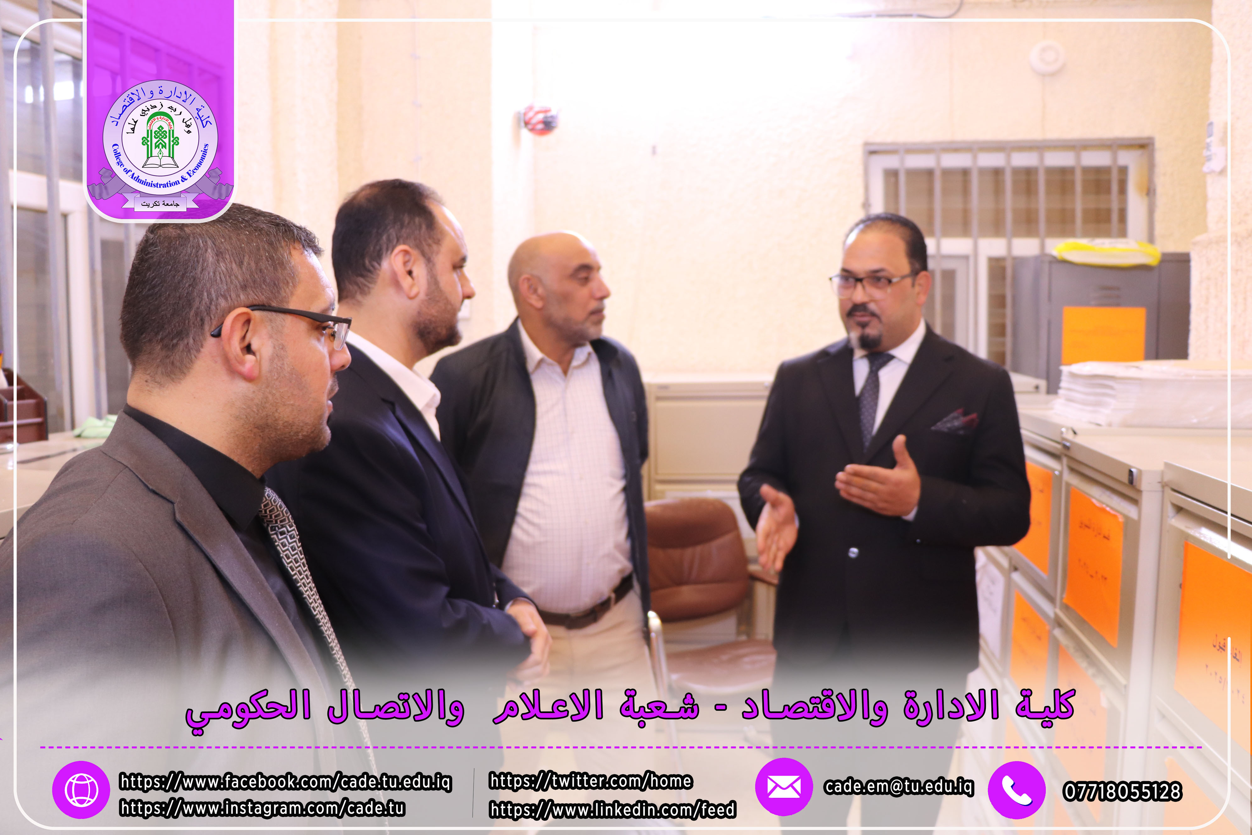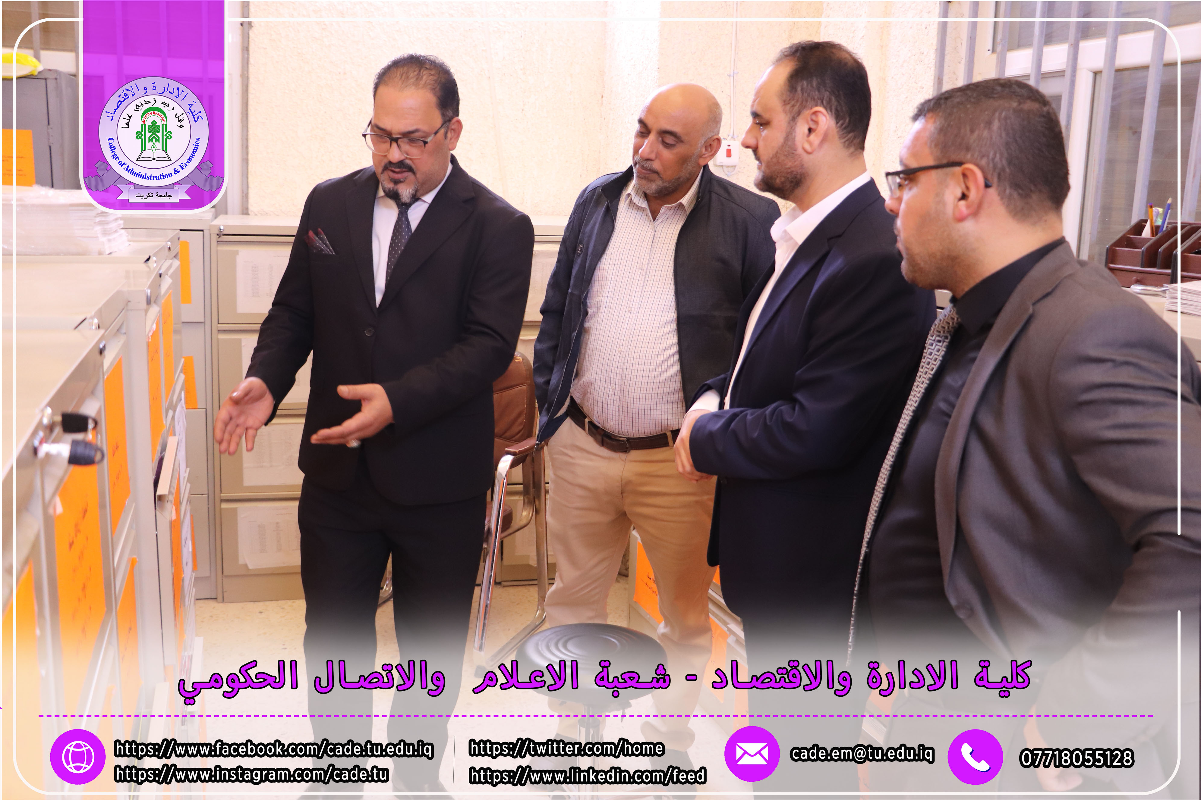 وكان في استقبال اللجنة كلٌّ من الأستاذ المساعد الدكتور فؤاد فرحان حسين عميد كلية الإدارة والاقتصاد، والأستاذ المساعد الدكتور خطاب عمران صالح معاون العميد للشؤون العلمية، إلى جانب عدد السادة التدريسيين ومسؤولي الشعب والوحدات الإدارية.