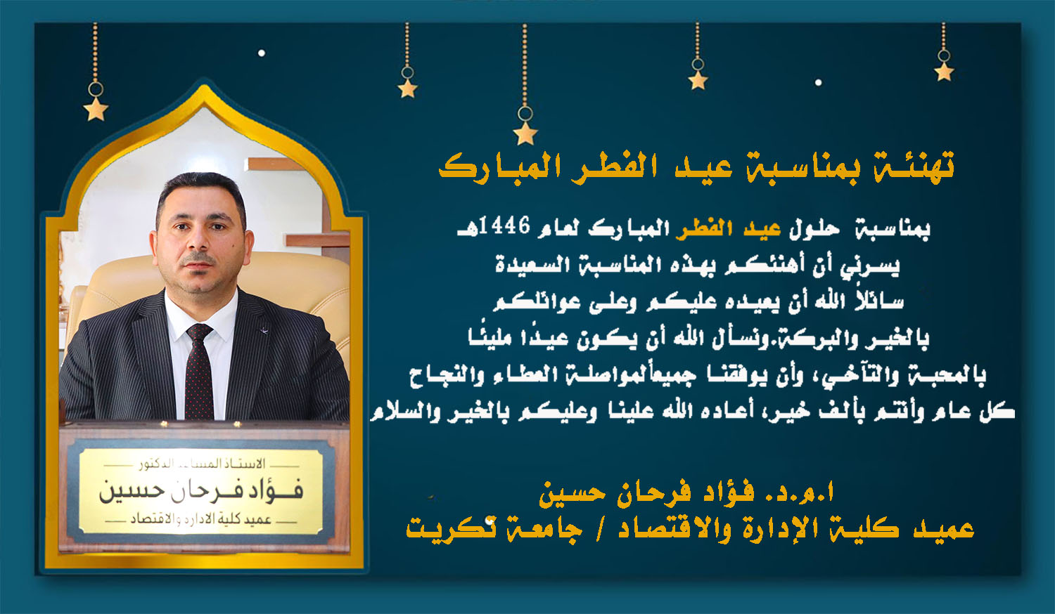 تهنئة عميد كلية الإدارة والاقتصاد / جامعة تكريت بمناسبة عيد الفطر المبارك