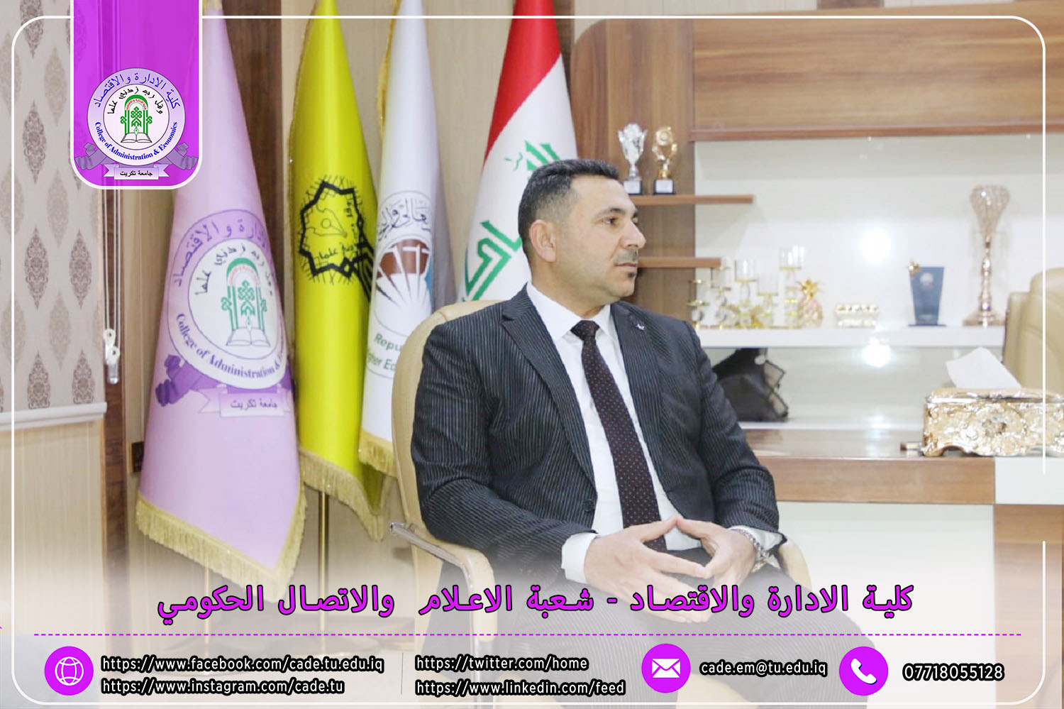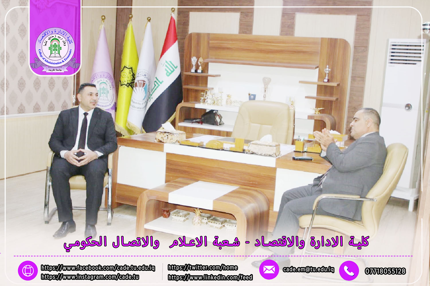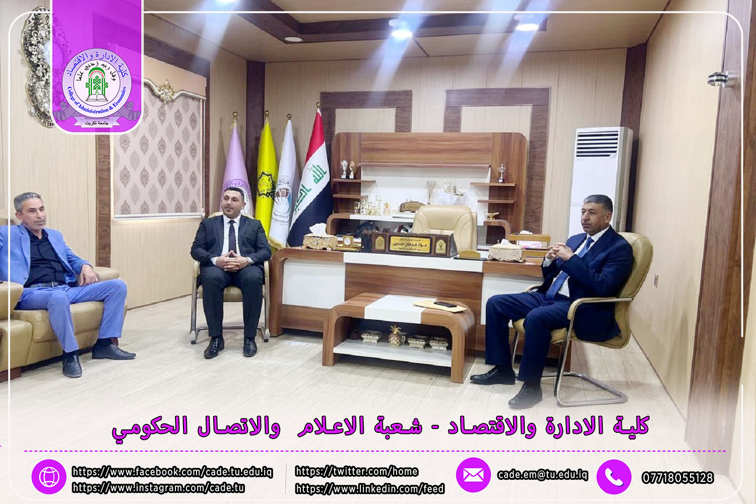 حيث زار السيد الأستاذ الدكتور حسن حسين إبراهيم، مساعد رئيس الجامعة للشؤون العلمية، والأستاذ الدكتور حامد محمد صالح، عميد كلية التربية الأساسية في الشرقاط، والأستاذ الدكتور نجلاء عبد الحسين عليوي، عميدة كلية التربية للبنات، عمادة كلية الإدارة والاقتصاد في جامعة تكريت لتقديم التهاني والتبريكات للسيد العميد أ.م.د. فؤاد فرحان حسين بمناسبة توليه منصبه الجديد.