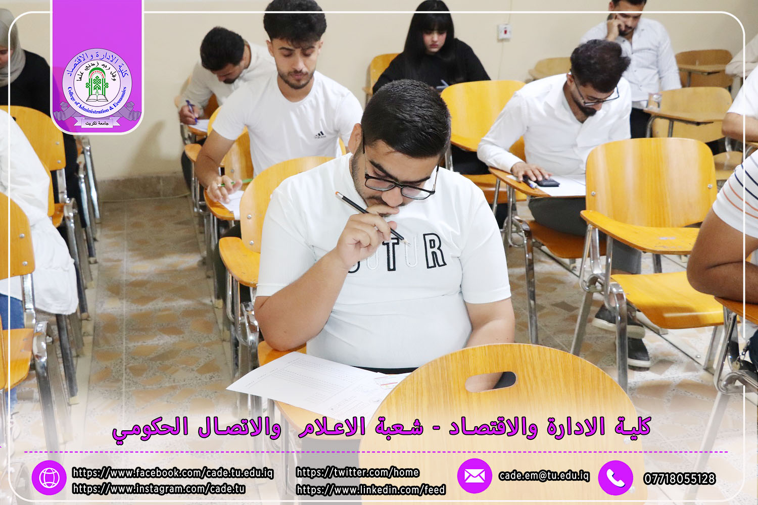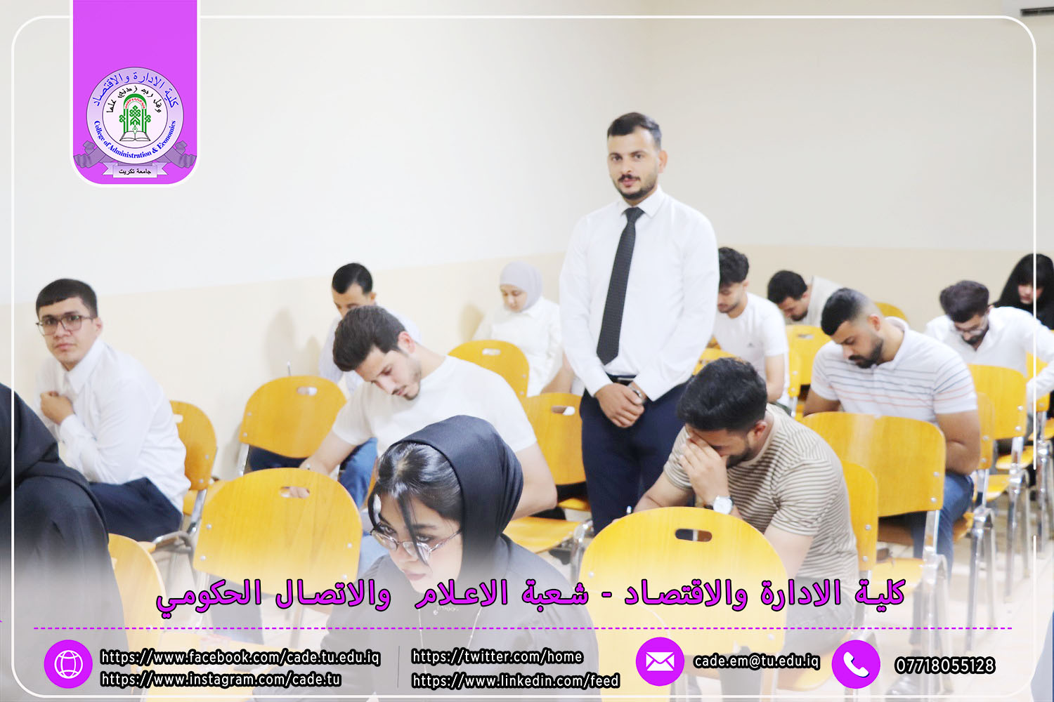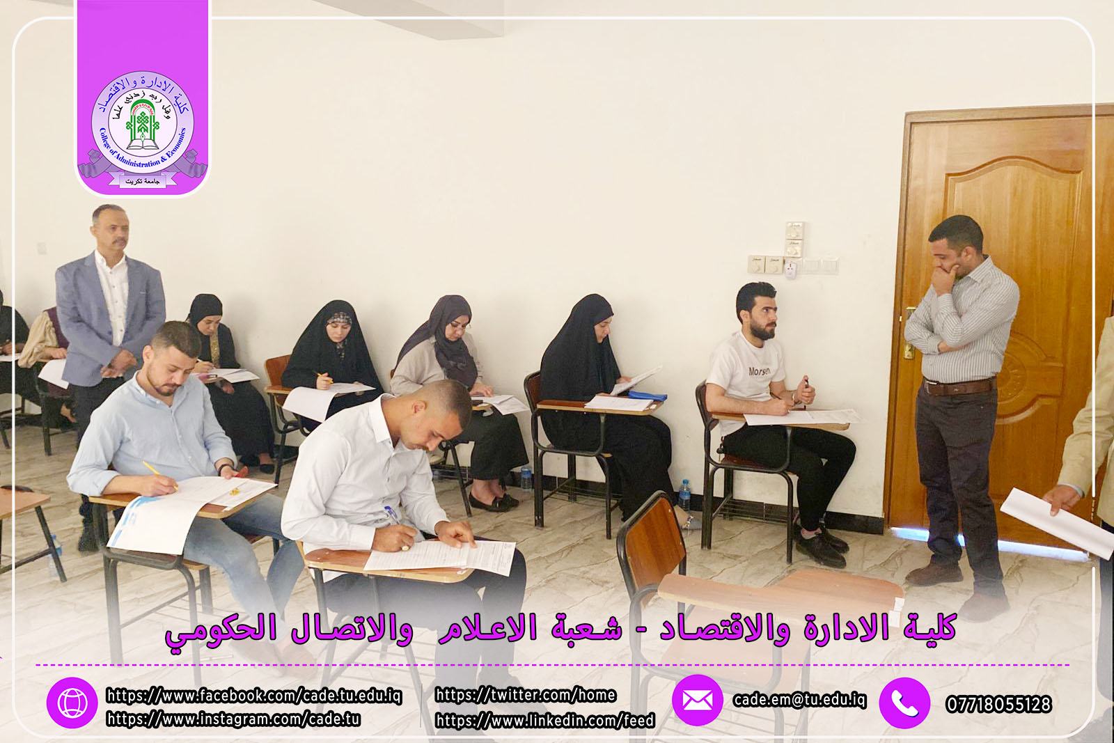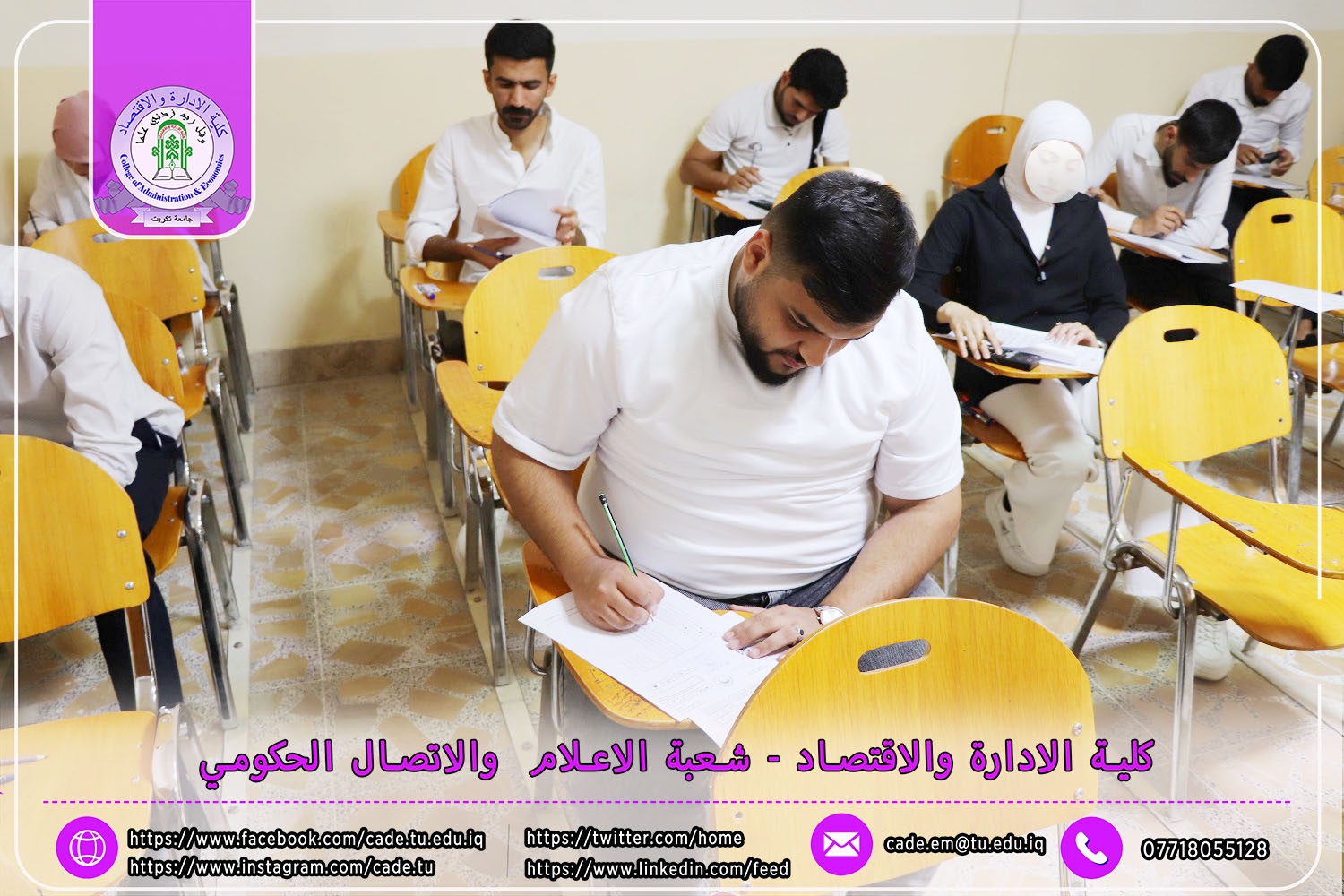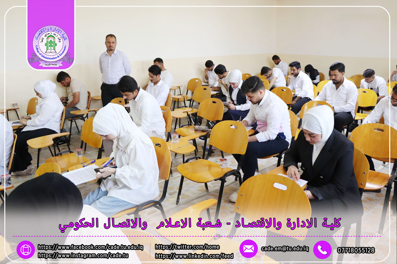شهدت كلية الإدارة والاقتصاد في جامعة تكريت، يوم السبت الموافق 10 /5/ 2025، انطلاق الامتحان التقويمي (الوزاري) لطلبة المرحلتين الثالثة والرابعة في الدراستين الصباحية والمسائية لقسمي إدارة الأعمال والمحاسبة، للفصل الدراسي الثاني / الدور الاول للعام الدراسي 2024-2025، وذلك تنفيذًا لتوجيهات وزارة التعليم العالي والبحث العلمي بشأن تطبيق الامتحانات التقويمية المركزية.