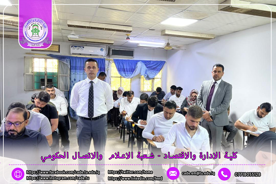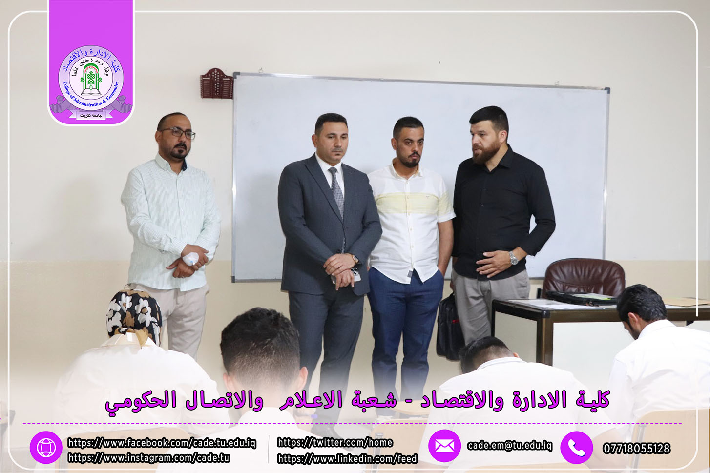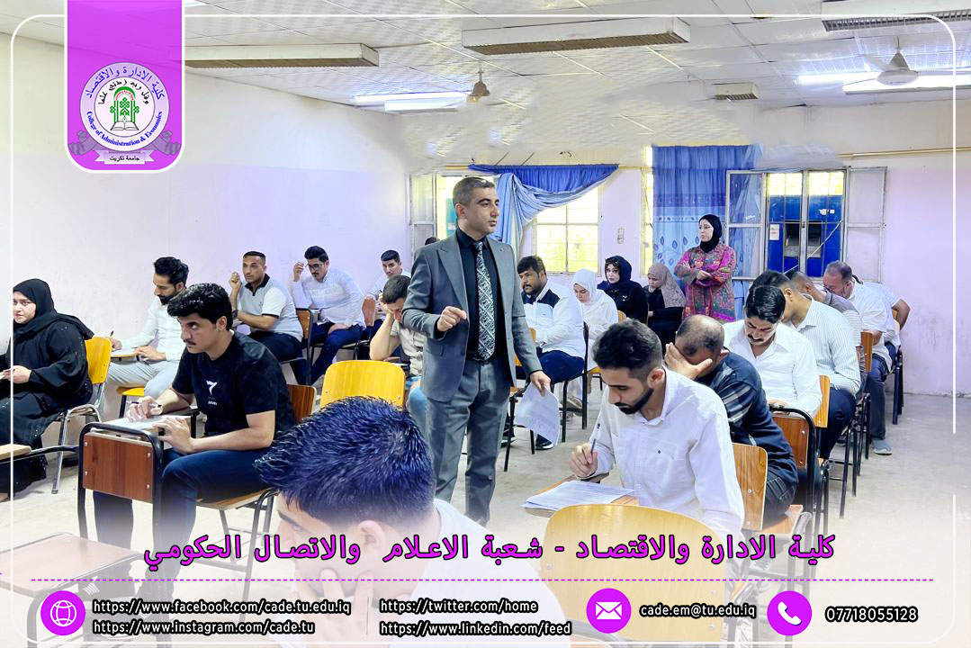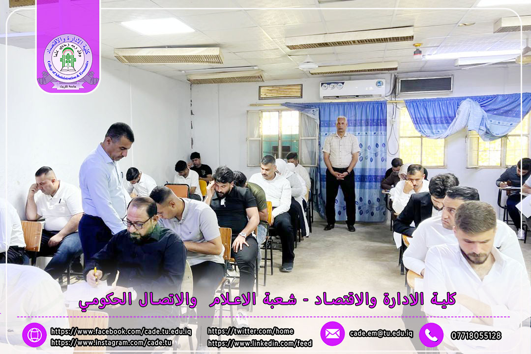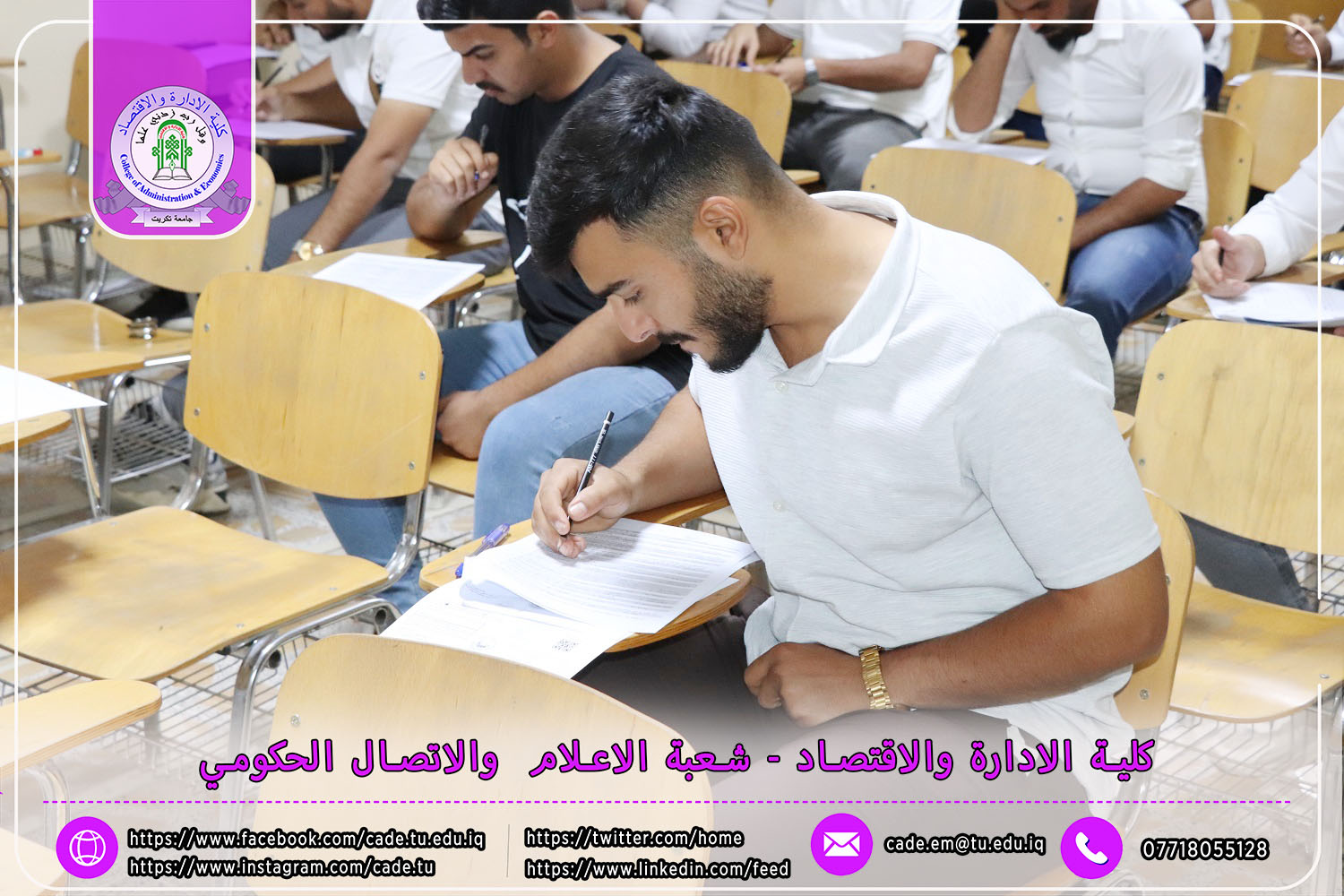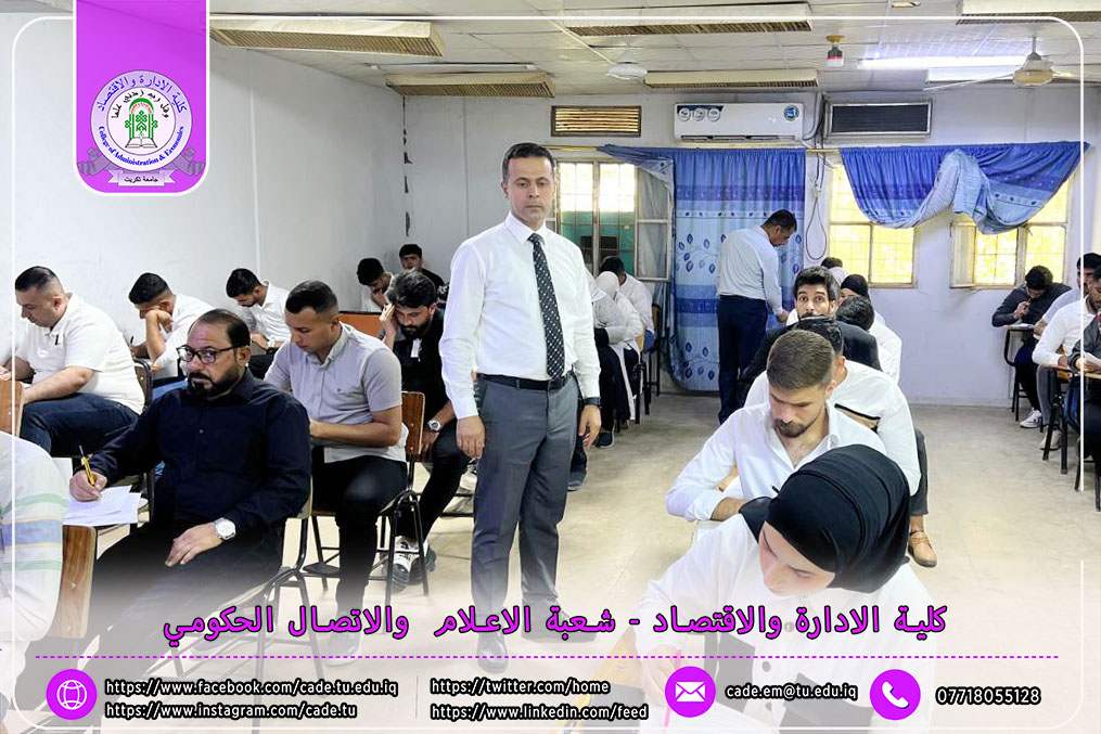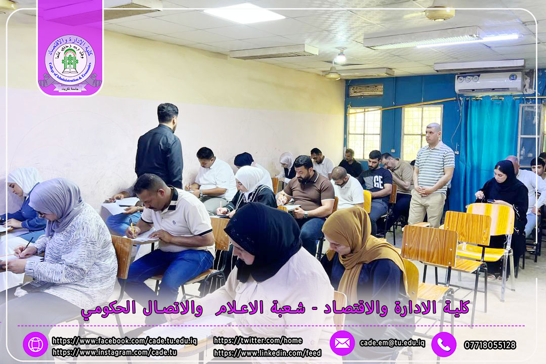 شهدت كلية الإدارة والاقتصاد في جامعة تكريت، يوم السبت الموافق 10 /5/ 2025، انطلاق الامتحان التقويمي (الوزاري) لطلبة المرحلتين الثالثة والرابعة في الدراستين الصباحية والمسائية لقسمي إدارة الأعمال والمحاسبة، للفصل الدراسي الثاني / الدور الاول للعام الدراسي 2024-2025، وذلك تنفيذًا لتوجيهات وزارة التعليم العالي والبحث العلمي بشأن تطبيق الامتحانات التقويمية المركزية.