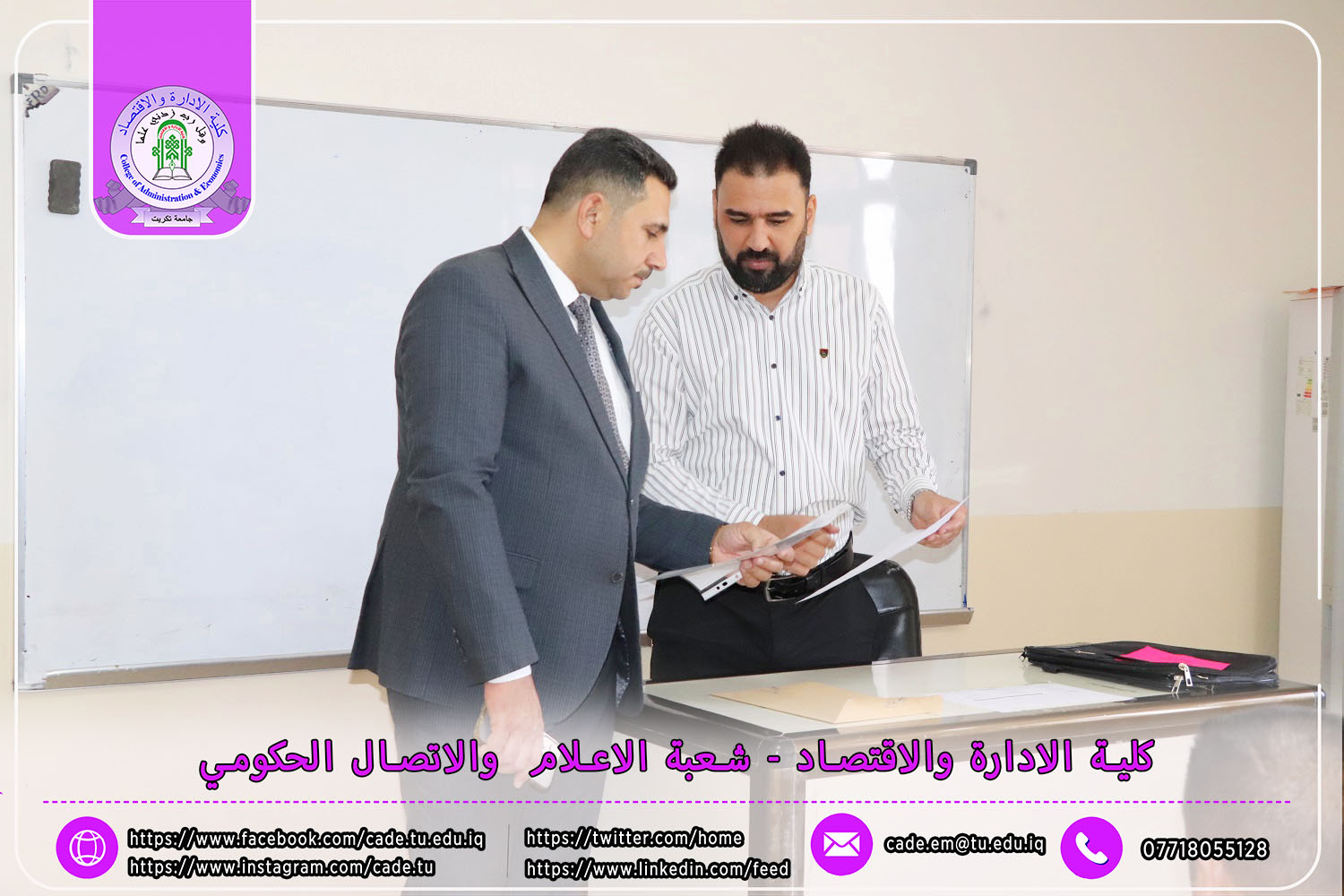 وفي هذا السياق، أجرى السيد عميد الكلية، الأستاذ المساعد الدكتور فؤاد فرحان حسين، يرافقه معاون العميد للشؤون الإدارية والمالية، المدرس أحمد عايد مخلف، جولة تفقدية شملت عددًا من القاعات الامتحانية للاطلاع على مجريات الامتحان، ومدى التزام الطلبة بالتعليمات والضوابط الامتحانية المعتمدة. وقد أثنى السيد العميد على جهود الكوادر التدريسية والفنية التي ساهمت في تنظيم الامتحان وتهيئة بيئة مناسبة لأدائه بسلاسة وانتظام.