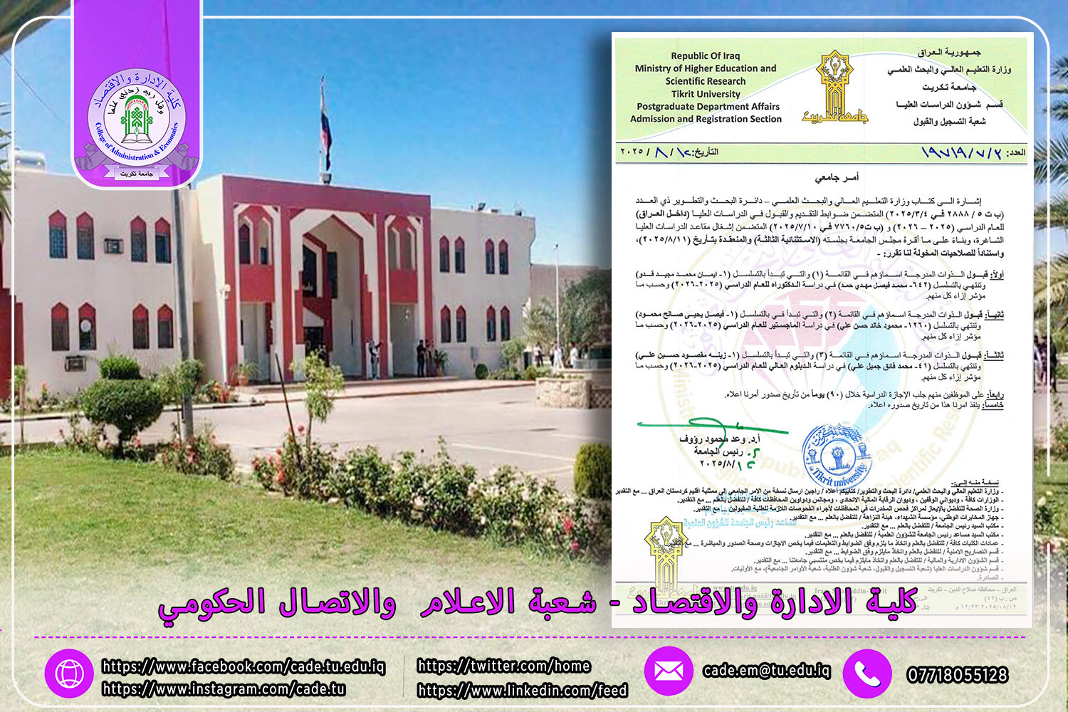 وتدعو عمادة كلية الإدارة والاقتصاد جميع الطلبة المقبولين الواردة أسماؤهم في الأمر الجامعي، إلى مراجعة شعبة الدراسات العليا اعتبارًا من يوم غدٍ الأربعاء الموافق 13/8/2025، لتسليم ملفاتهم الورقية الأصلية واستلام نسخ من الأمر الجامعي والإداري الخاص بقبولهم، إضافةً إلى إكمال إجراءات الإجازة الدراسية للموظفين منهم. وتأكد شعبة الدراسات العليا أن الموظفين المرشحين وفق تعليمات الإجازات الدراسية رقم (165 لسنة 2011) ملزمون بجلب الإجازة الدراسية خلال (90) يومًا من تاريخ إصدار الأوامر الجامعية، وبخلاف ذلك تُنهى علاقتهم بالدراسة، وذلك استنادًا إلى الفقرة (رابعًا/7) من ضوابط القبول.
