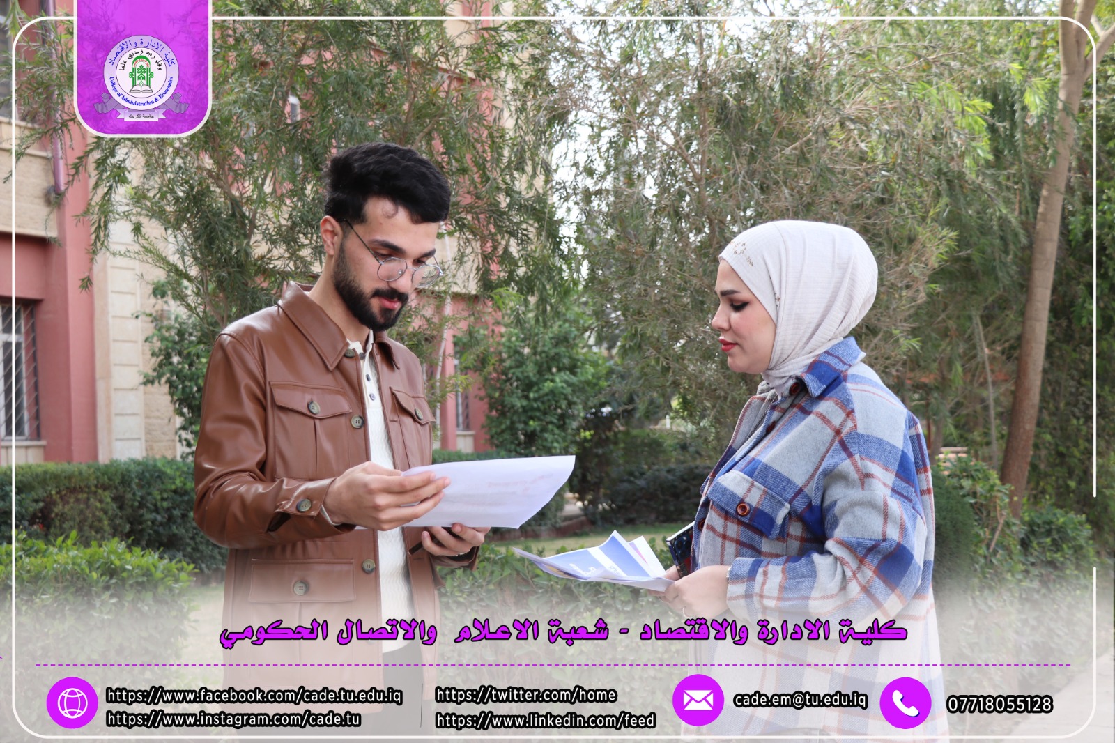 ضمن فعاليات الأسبوع العالمي لريادة الأعمال، نظّمت شعبة الشؤون العلمية في كلية الإدارة والاقتصاد وبالتعاون مع شعبة الإعلام والاتصال الحكومي حملة توعوية داخل أروقة الكلية، تمثّلت في نشر وتوزيع بوسترات تعريفية وتثقيفية بين الطلبة تهدف إلى تعزيز ثقافة ريادة الأعمال وتشجيع المبادرات الطلابية الإبداعية.