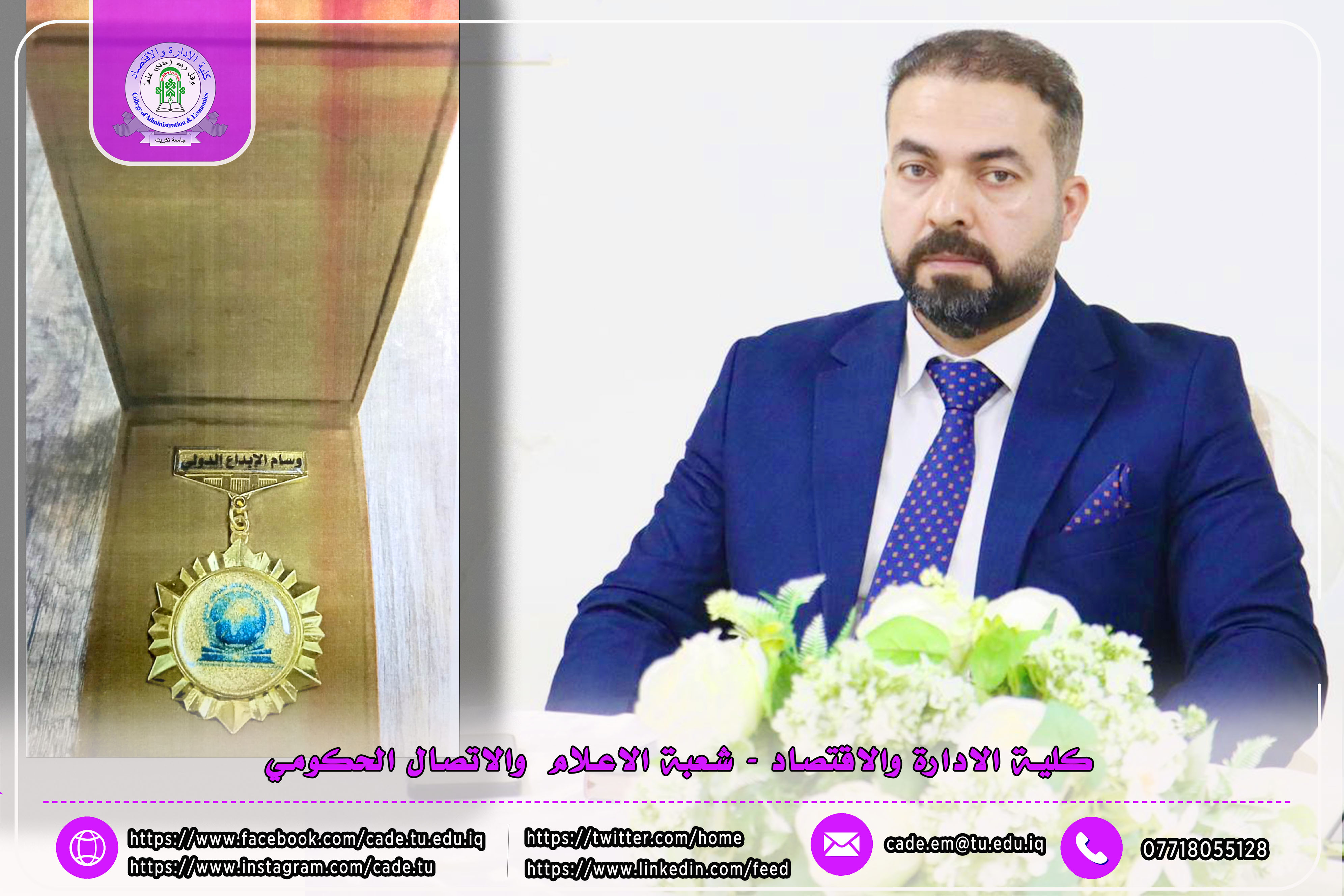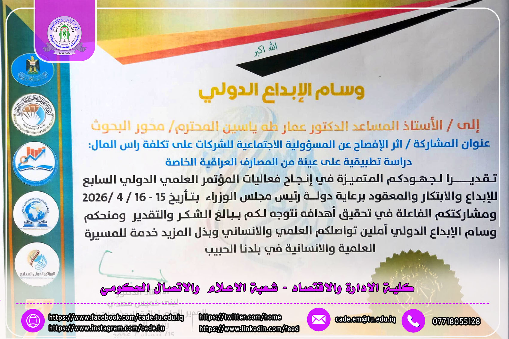 حصل الأستاذ المساعد الدكتور عمار طه ياسين، أحد تدريسيي كلية الإدارة والاقتصاد / جامعة تكريت، على وسام الإبداع الدولي، تقديراً لجهوده العلمية المتميزة ومشاركته الفاعلة في إنجاح أعمال المؤتمر العلمي الدولي السابع للإبداع والابتكار، الذي عُقد في العاصمة بغداد للفترة من 15–16 نيسان 2026، برعاية دولة رئيس مجلس الوزراء.
