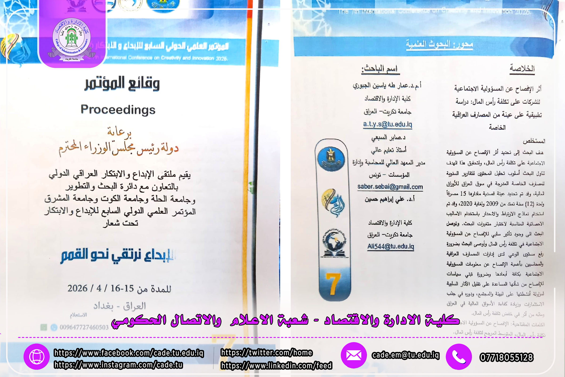ويُعد هذا الإنجاز إضافة نوعية إلى رصيد كلية الإدارة والاقتصاد / جامعة تكريت، ويعكس المكانة العلمية المتميزة لتدريسيها في المحافل الأكاديمية الدولية، فضلاً عن إسهامهم الفاعل في دعم مسيرة البحث العلمي وخدمة قضايا التنمية في العراق.