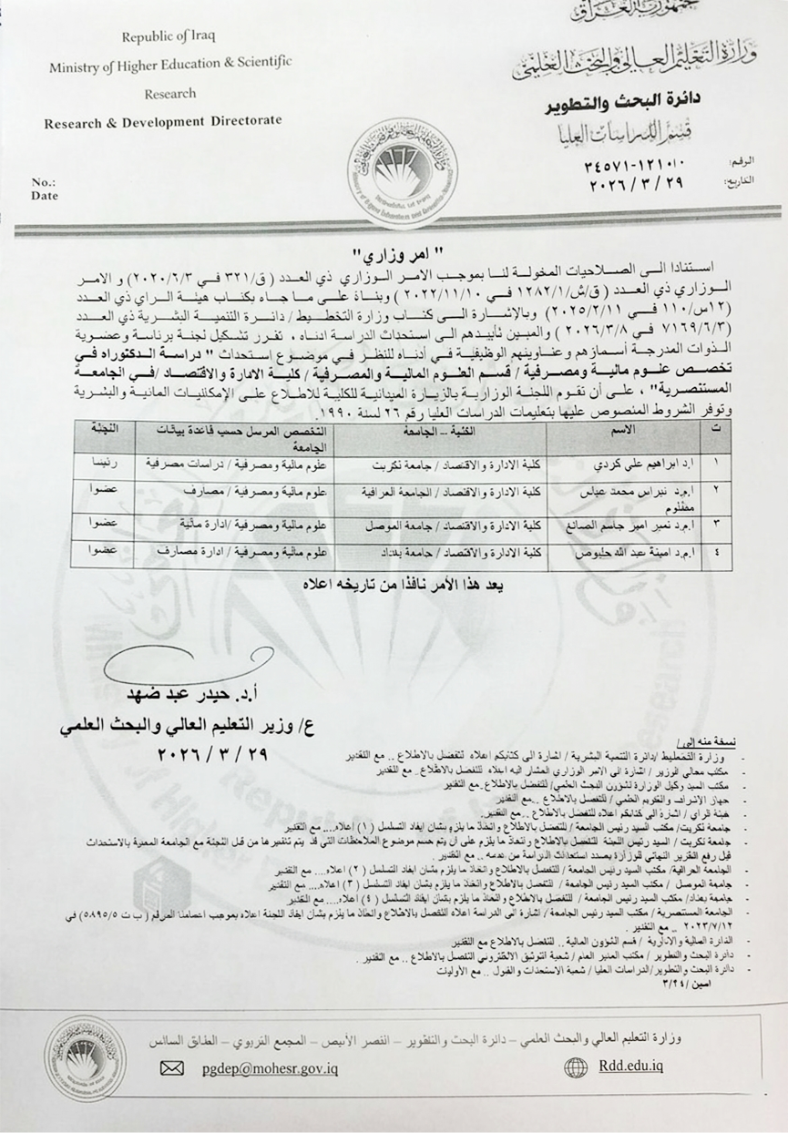في إطار سعي وزارة التعليم العالي والبحث العلمي إلى تطوير برامج الدراسات العليا وتعزيز التخصصات الأكاديمية بما يواكب متطلبات سوق العمل والتطورات الاقتصادية، ترأس الأستاذ الدكتور إبراهيم علي كردي، رئيس قسم العلوم المالية والمصرفية في كلية الإدارة والاقتصاد / جامعة تكريت، لجنة وزارية مختصة لاستحداث برنامج الدكتوراه في تخصص العلوم المالية والمصرفية في كلية الإدارة والاقتصاد / الجامعة المستنصرية.