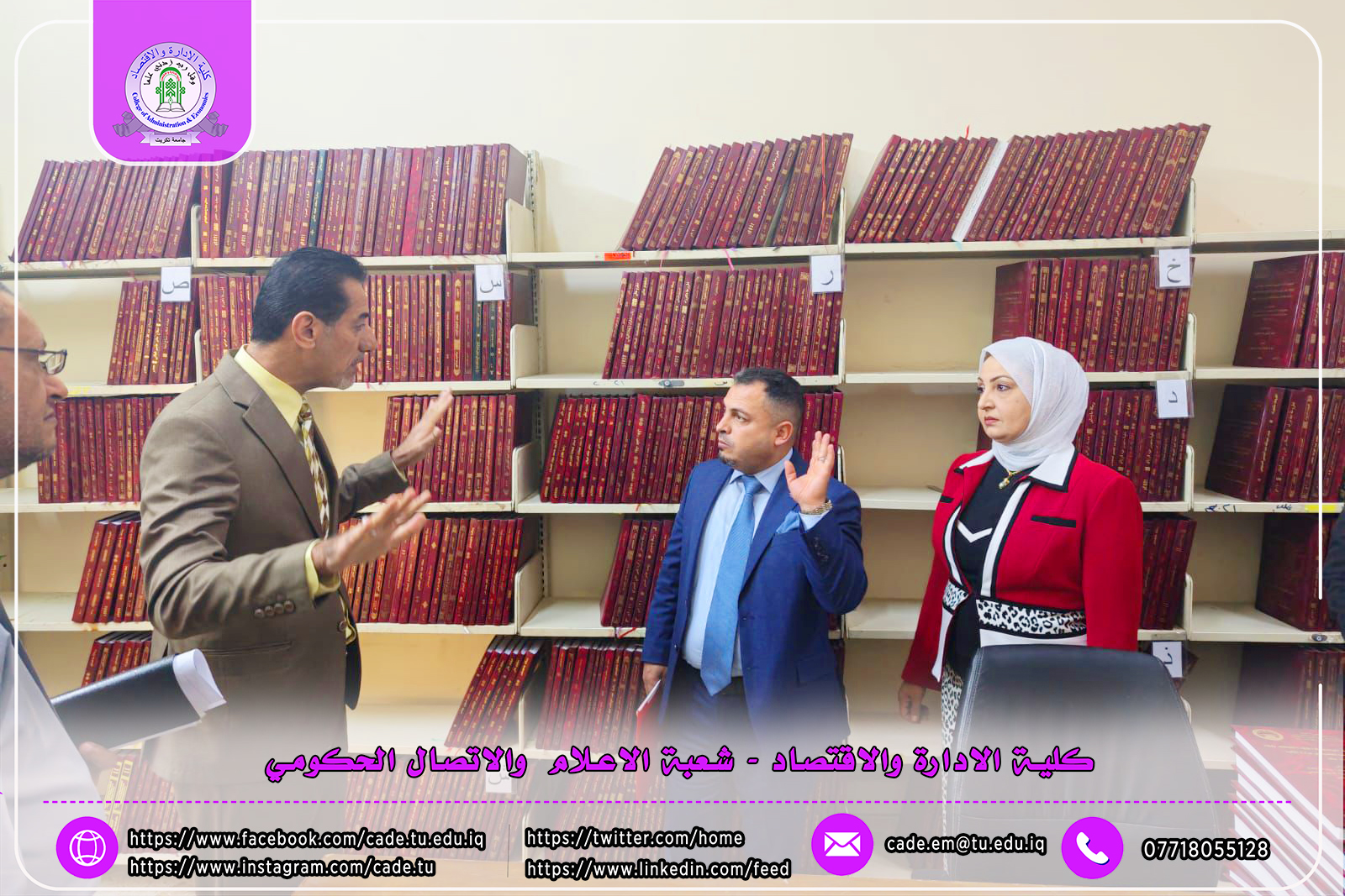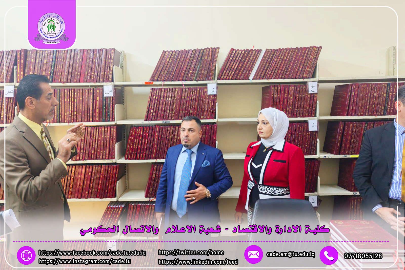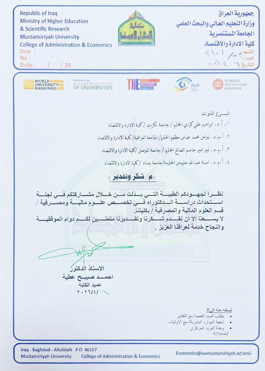 ومن جهة أخرى، وحرصاً على دعم الجهود العلمية المتميزة، منح عميد كلية الإدارة والاقتصاد الأستاذ الدكتور أحمد صبيح عطية كتاب شكر وتقدير لأعضاء اللجنة، تثميناً لجهودهم الفاعلة ومشاركتهم في لجنة استحداث برنامج الدكتوراه، ودورهم في تعزيز المسيرة الأكاديمية وتطوير برامج الدراسات العليا بما ينسجم مع متطلبات الجودة والاعتماد الأكاديمي.