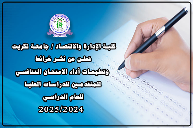 تعلن كلية الإدارة والاقتصاد في جامعة تكريت عن نشر خرائط الامتحان التنافسي وتعليمات أداء الامتحان التنافسي للمتقدمين للدراسات العليا للعام الدراسي 2024-2025. وقد تم تحديد موعد الامتحان يوم الثلاثاء الموافق 9 /7/ 2024 في تمام الساعة 9:00 صباحاً، وسيُجرى الامتحان في قاعات قسم إدارة الأعمال.
