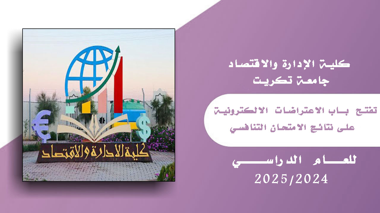 تعلن كلية الإدارة والاقتصاد عن فتح باب الاعتراضات الإلكترونية على النتائج الأولية للامتحان التنافسي للمتقدمين للدراسات العليا للعام الدراسي 2024-2025. حيث سيتم تقديم الاعتراضات عبر استخدام منظومة القبول للدراسات العليا من خلال الحساب الشخصي للمتقدمين على المنظومة الإلكترونية للقبول، وذلك من خلال تسجيل الدخول الى حساب المتقدم والفقرة الثانية بالضغط على خيار "الاعتراض على النتائج".