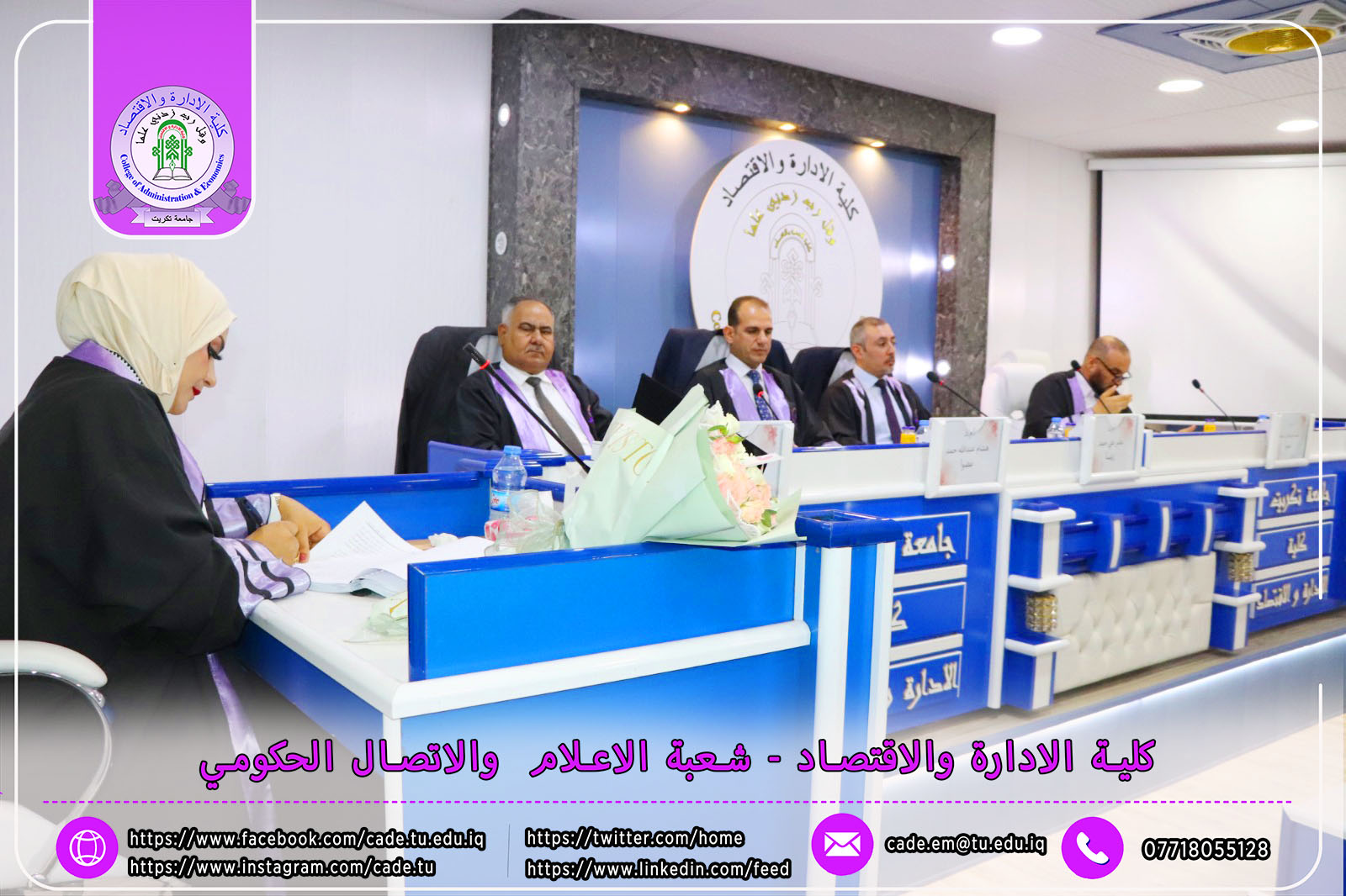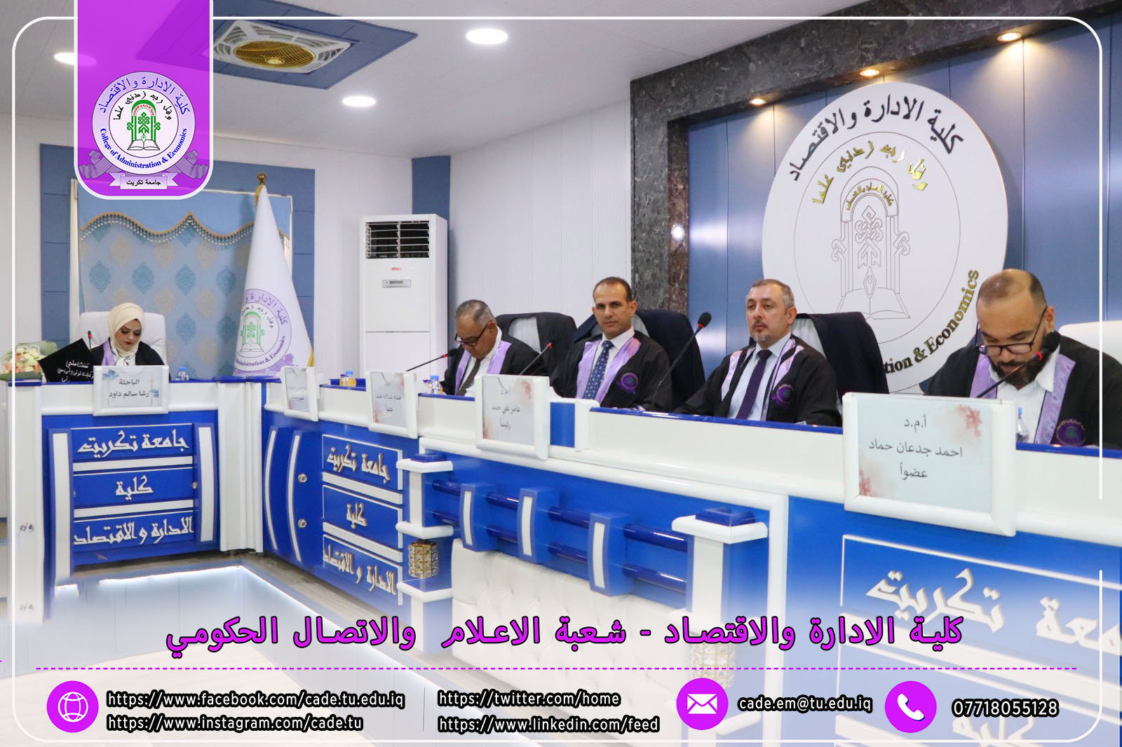 نوقشـت في كليـة الإدارة والاقتصاد رسالة الماجستير في العلوم الإدارية للطالــبة رشا سالم داود الموسـومة (دور الثقافة التنظيمية في تحقيق التفوق الاستراتيجي من خلال الممارسات الخضراء لإدارة الموارد البشرية: دراسة استطلاعية لآراء عينة من العاملين في شركة مابين النهرين العامة للبذور) بأشــراف ا.م. كفاح عباس محيميد.