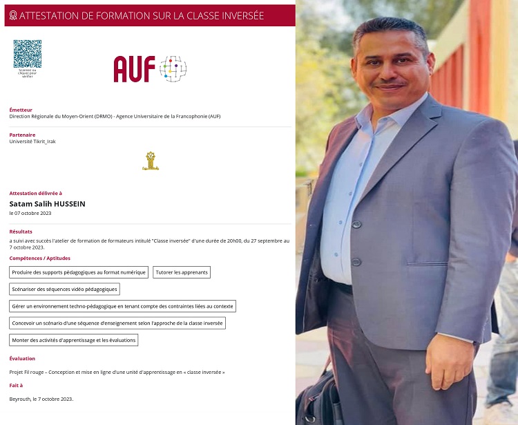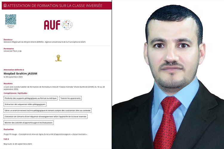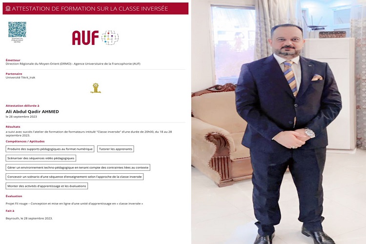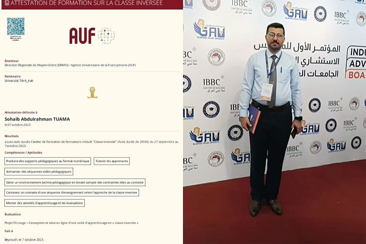 في إطار المنهاج الوزاري الذي أعدته وزارة التعليم العالي والبحث العلمي لتسريع التحول الرقمي في الجامعات العراقية، وبالتعاون مع الوكالة الجامعية الفرانكفونية الفرنسية (AUF) للتحويل الرقمي للتعليم العالي في الشرق الأوسط، حقق مجموعة من التدريسيين في كلية الإدارة والاقتصاد / جامعة تكريت إنجازاً مميزاً بحصولهم على شهادة متدرب دولية في موضوع "الصف المعكوس". التدريسيون الذين حصلوا على الشهادة هم كل من السادة: