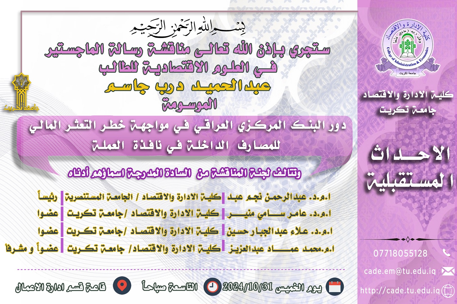 ستجري بإذن الله تعالـى مناقشة رسالة الماجستير فــي العلوم الاقتصادية للطالب عبدالحميد درب جاسم