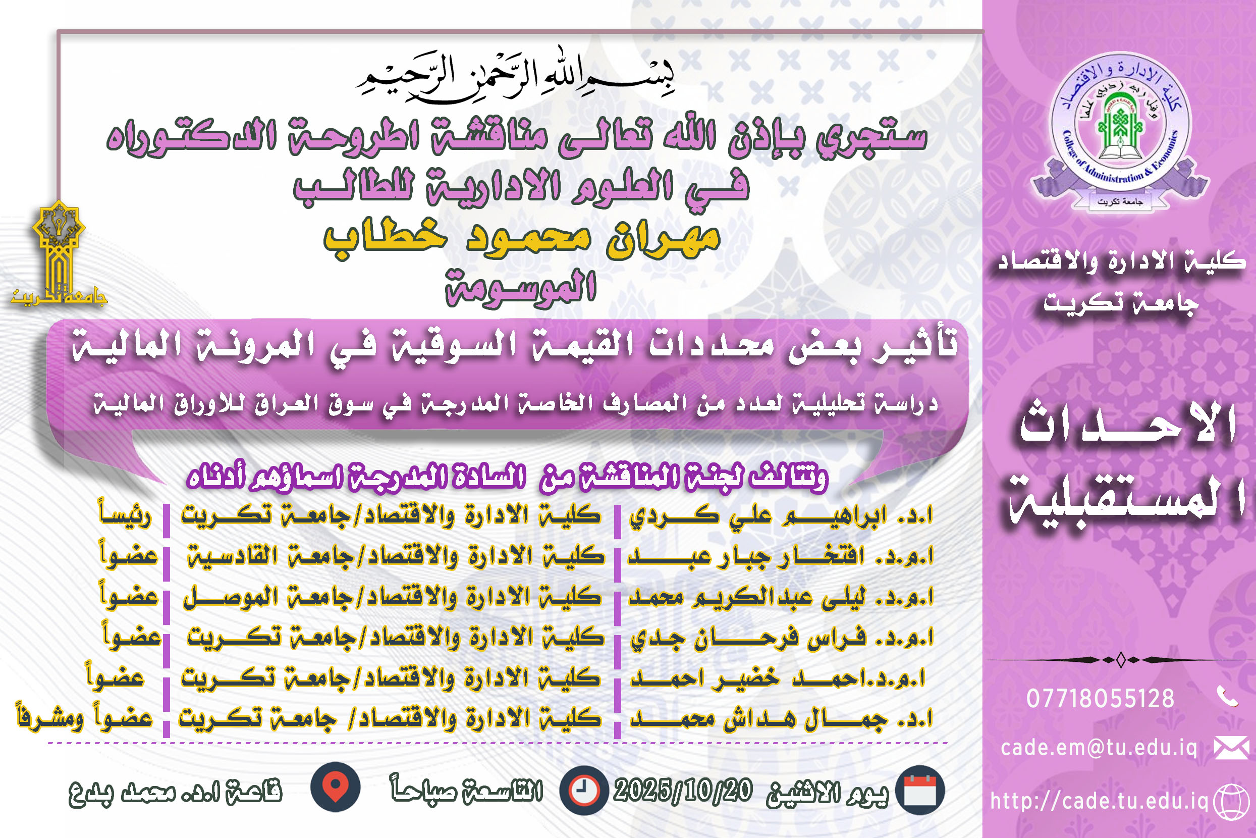 ستجري بإذن الله تعالـى مناقشة اطروحة الدكتوراه فــي العلوم الادارية للطالــب مهران محمود خطاب