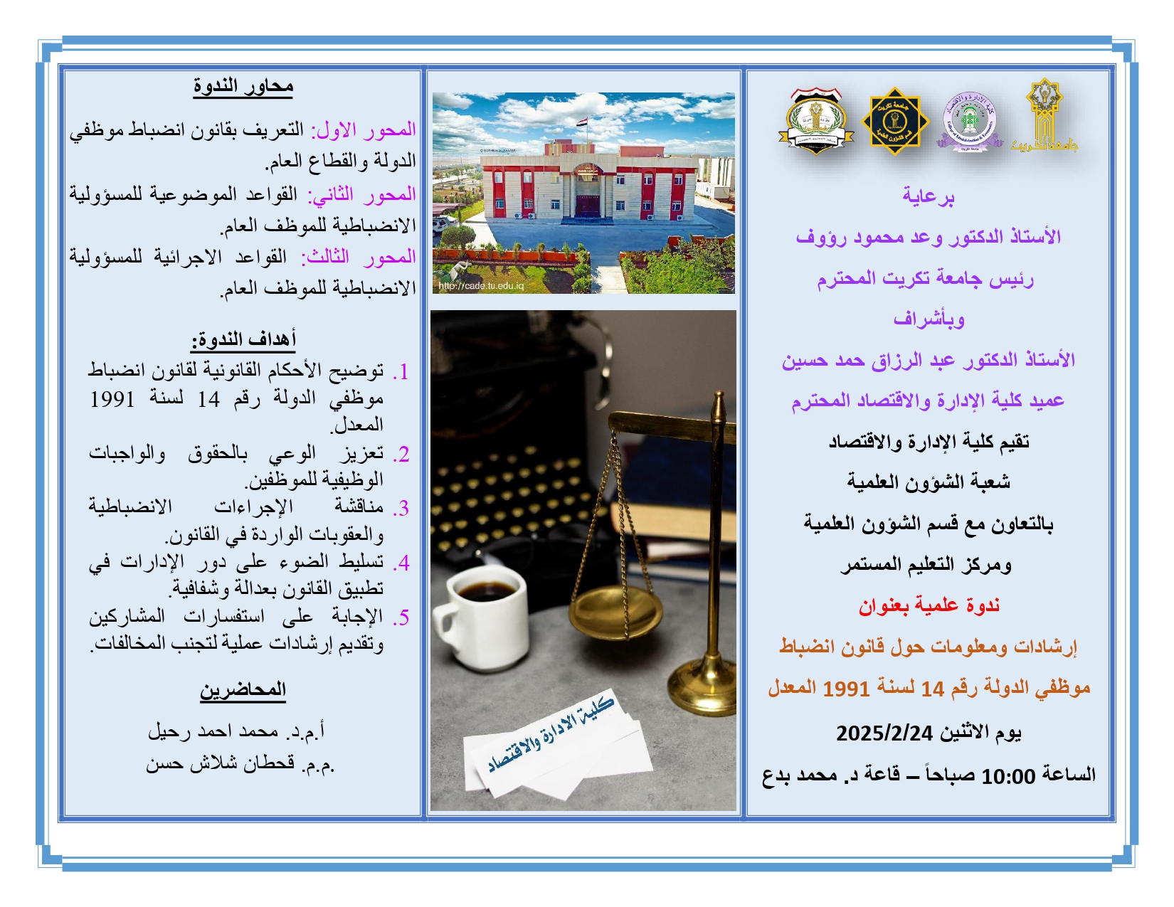 ندوة علمية بعنوان إرشادات ومعلومات حول قانون انضباط موظفي الدولة رقم 14 لسنة 1991 المعدل