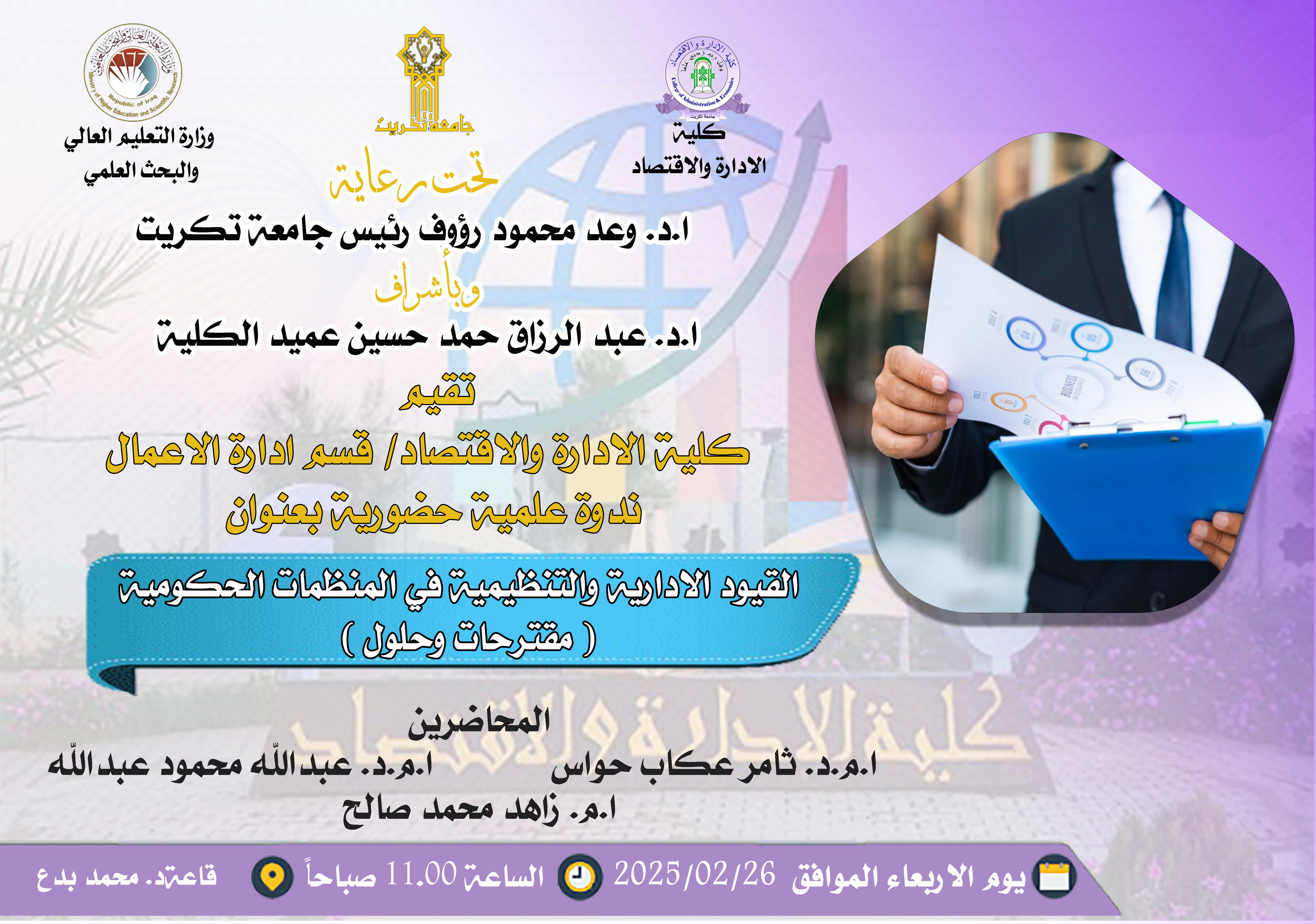 ندوة علمية حضورية بعنوان القيود الإدارية والتنظيمية في المنظمات الحكومية ( مقترحات وحلول )