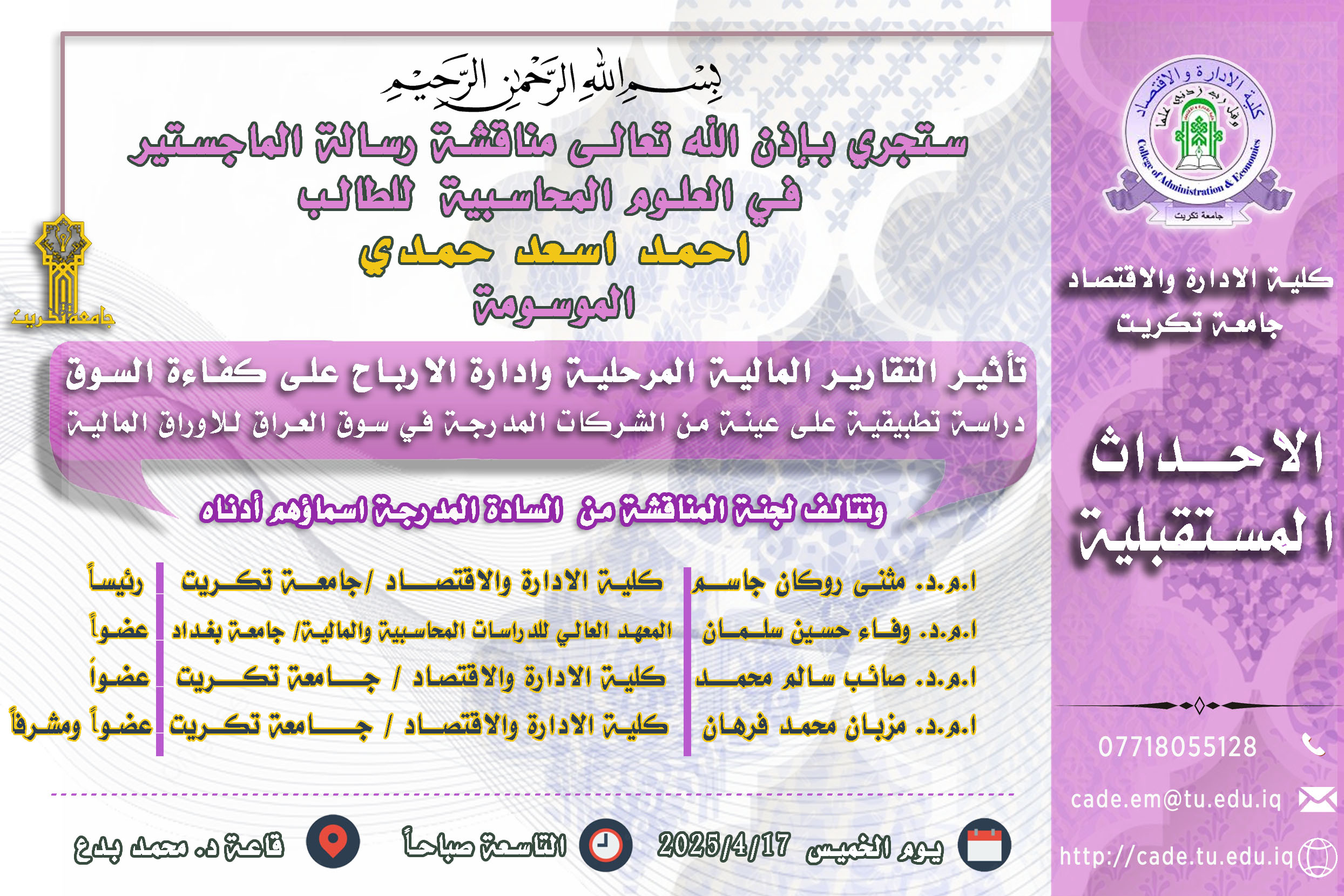 ستجري بإذن الله تعالـى مناقشة رسالة الماجستير في العلوم المحاسبية للطالب احمد اسعد حمدي