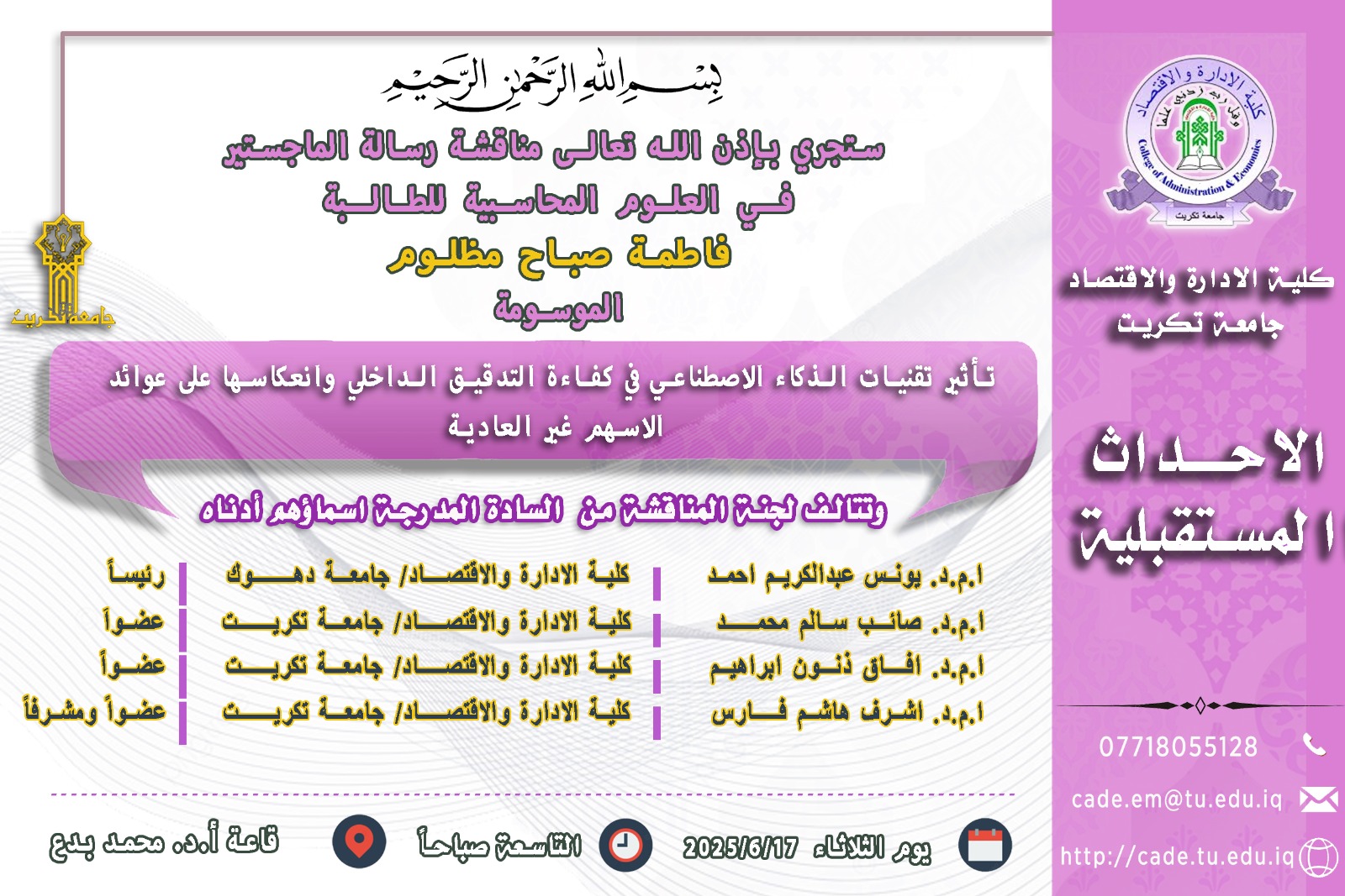 ستجري بإذن الله تعالـى مناقشة رسالة الماجستير فــي العلوم المحاسبية للطالــبة فاطمة صباح مظلوم