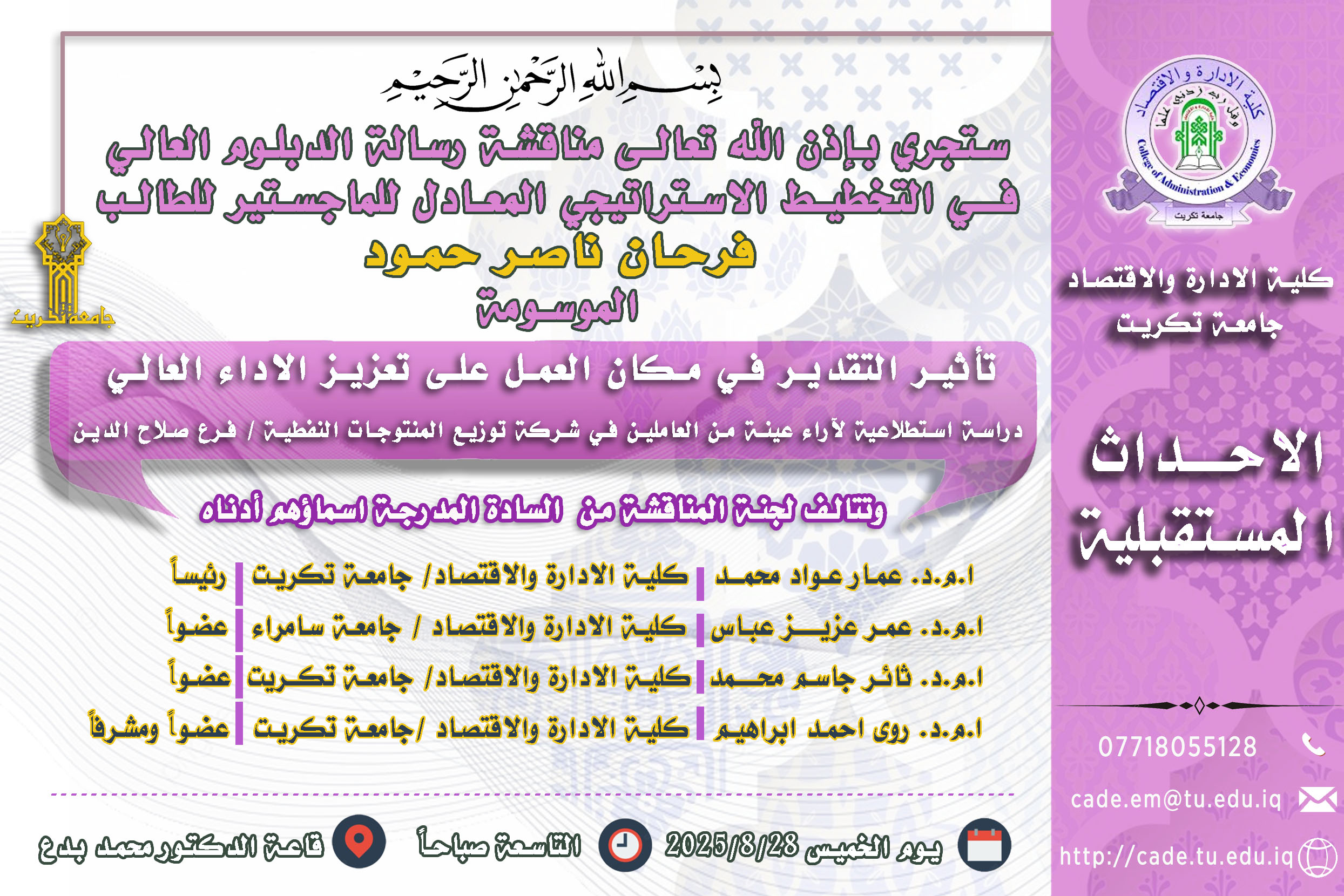 ستجري بإذن الله تعالـى مناقشة رسالة الدبلوم العالي فــي التخطيط الاستراتيجي المعادل للماجستير للطالب فرحان ناصر حمود
