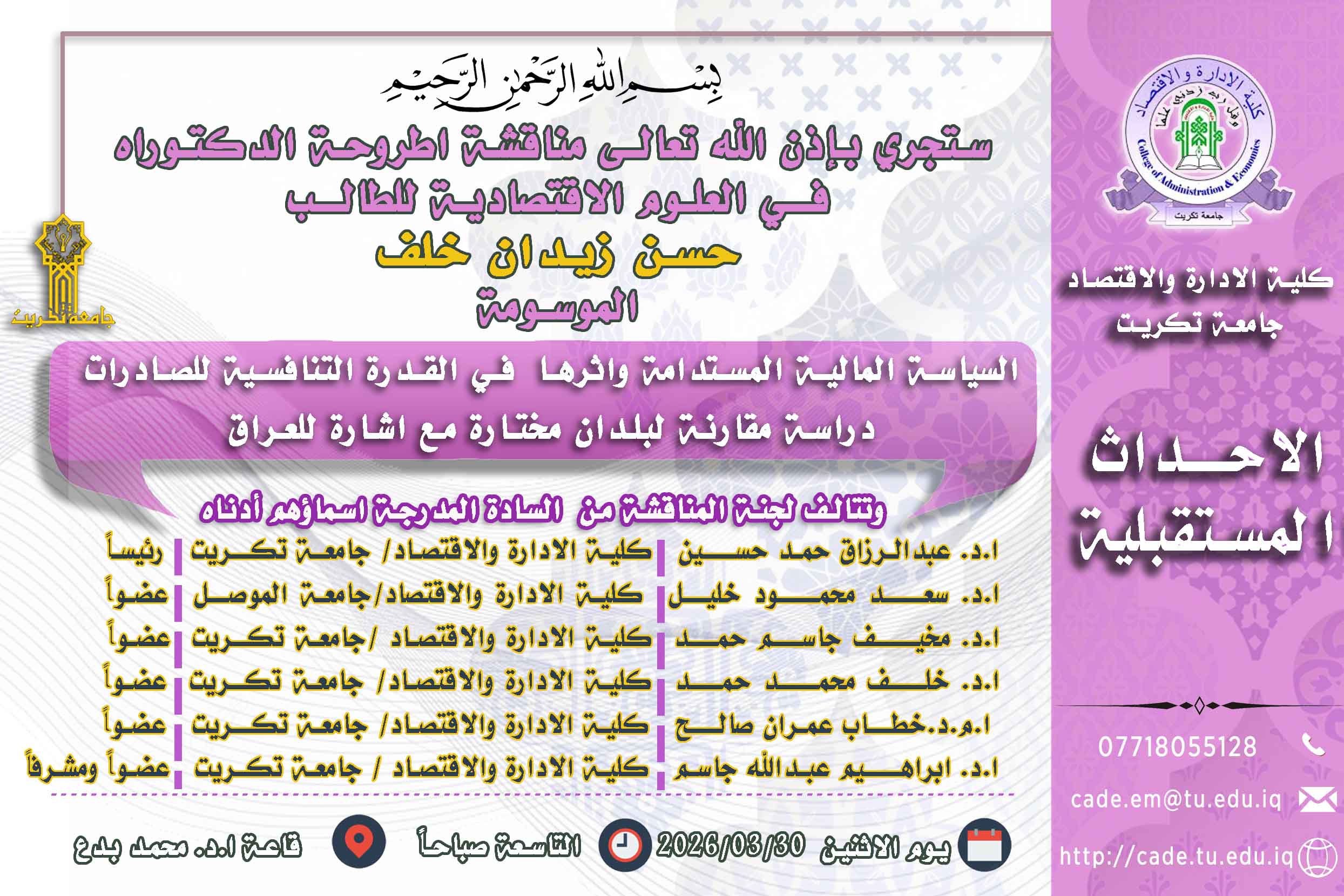 ستجري بإذن الله تعالـى مناقشة اطروحة الدكتوراه فــي العلوم الاقتصادية للطالــب حسن زيدان خلف
