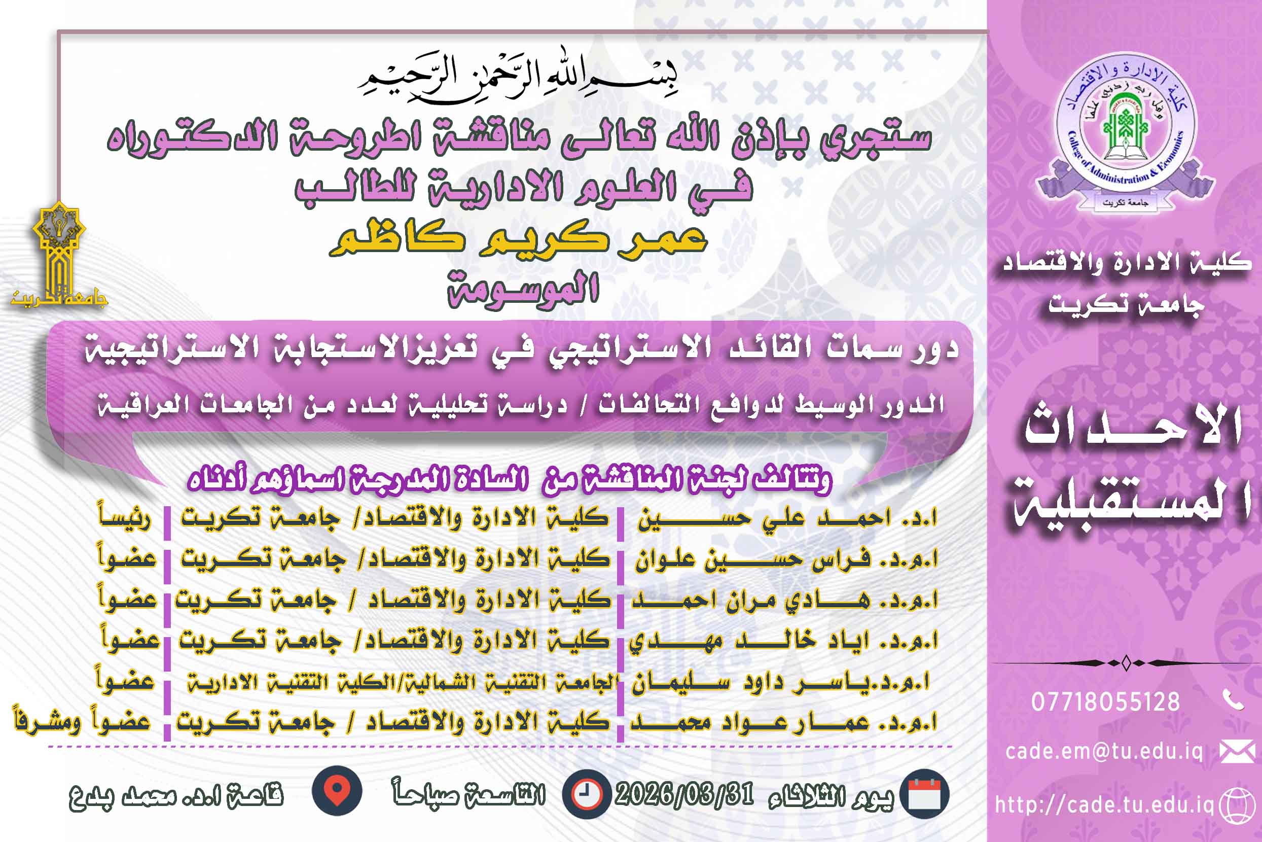 ستجري بإذن الله تعالـى مناقشة اطروحة الدكتوراه فــي العلوم الادارية للطالــب عمر كريم كاظم