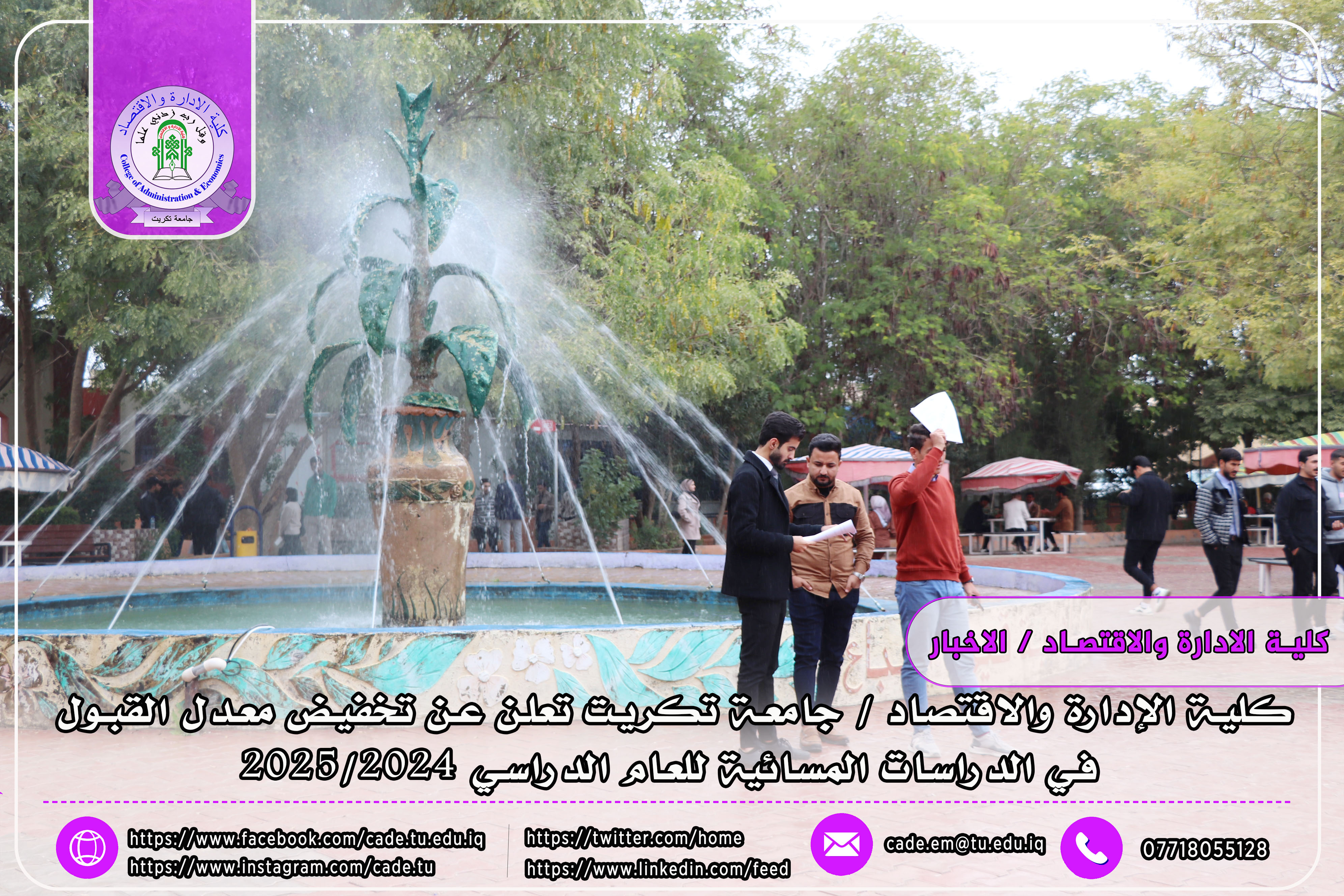 استناداً إلى ما جاء بدليل إجراءات شؤون الطلبة وضوابط القبول في الدراسات الأولية الصادر عن وزارة التعليم العالي والبحث العلمي/ دائرة الدراسات والتخطيط والمتابعة للعام الدراسي 2025/2024، وبناءً على ما ورد في الفصل الثالث، الفقرة (ج-1/4/ثانياً) من ضوابط وشروط التقديم للدراسة المسائية في الجامعات العراقية، والذي يخول مجالس الجامعات تخفيض الحدود الدنيا لمعدلات القبول بما لا يزيد عن (3) درجات. تعلن عمادة كلية الإدارة والاقتصاد / جامعة تكريت عن تخفيض معدل القبول في الدراسات المسائية إلى (57%) للعام الدراسي 2025/2024. علماً انه يبدأ التقديم للمشمولين بهذا التخفيض اعتباراً من يوم الأحد الموافق 2024/10/6 ويستمر حتى أسبوع بعد إعلان نتائج قبول الطلبة وفق قناة التعليم الحكومي الخاص الصباحي.