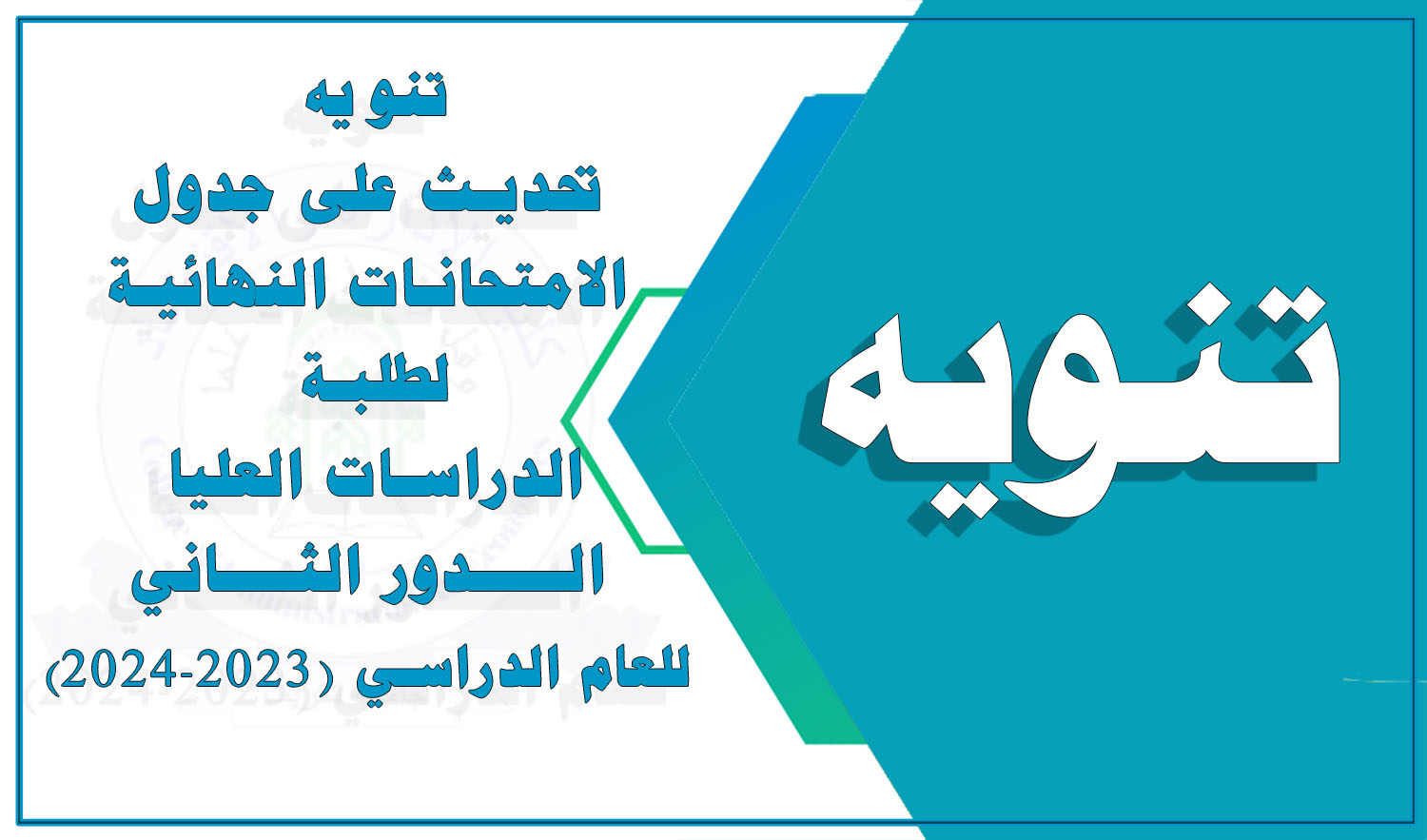 استناداً إلى توجيهات الأمانة العامة لمجلس الوزراء بشأن اعتبار يوم الأحد المقبل الموافق 15 /9/ 2024 عطلة رسمية وذلك بمناسبة المولد النبوي الشريف، تعلن عمادة الكلية/ شعبة الدراسات العليا عن تحديث على جدول الامتحانات النهائية لطلبة الدراسات العليا/ الدور الثاني للعام الدراسي (2023-2024).