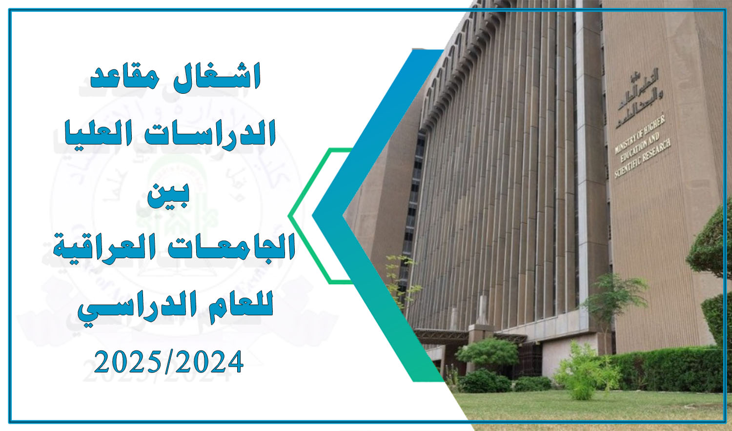 استنادًا إلى موافقة معالي وزير التعليم العالي والبحث العلمي بتاريخ 2024/9/15، وإشارةً إلى كتاب وزارة التعليم العالي والبحث العلمي / دائرة البحث والتطوير / قسم الدراسات العليا ذي العدد ب ت 5 / 8889 في 2024/9/12، والمتضمن إشغال مقاعد الدراسات العليا بين الجامعات العراقية للعام الدراسي 2025/2024.