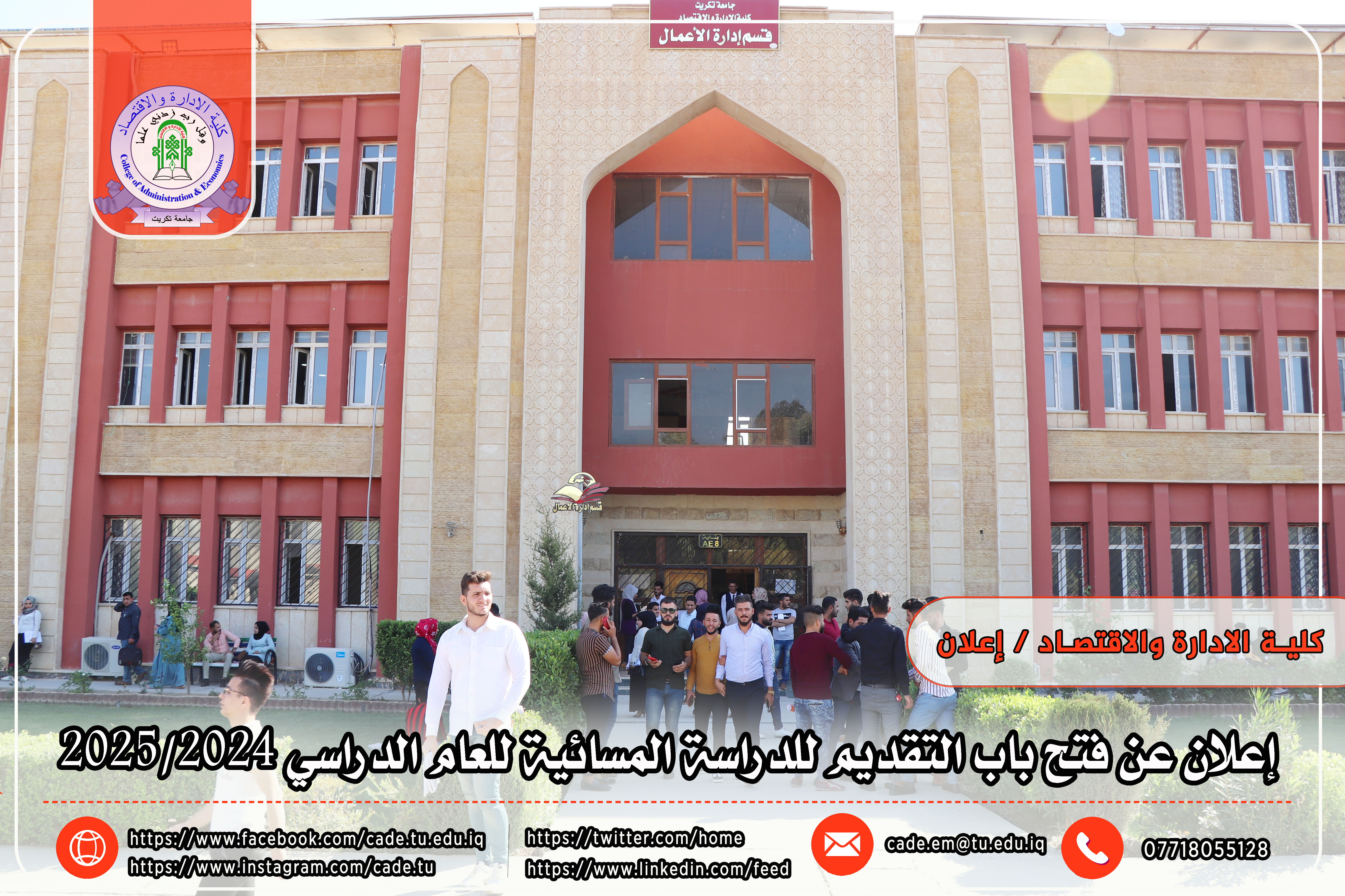 استناداً الى ما جاء بكتاب وزارة التعليم العالي والبحث العلمي / دائرة الدراسات والتخطيط والمتابعة / القبول المركزي ذي العدد ت م 5 / م / 9961 في 2024/9/22، والمتضمن فتح التقديم للدراسات المسائية، تعلن عمادة كلية الإدارة والاقتصاد / جامعة تكريت عن فتح استمارة التقديم للدراسة المسائية للعام الدراسي 2025/2024.