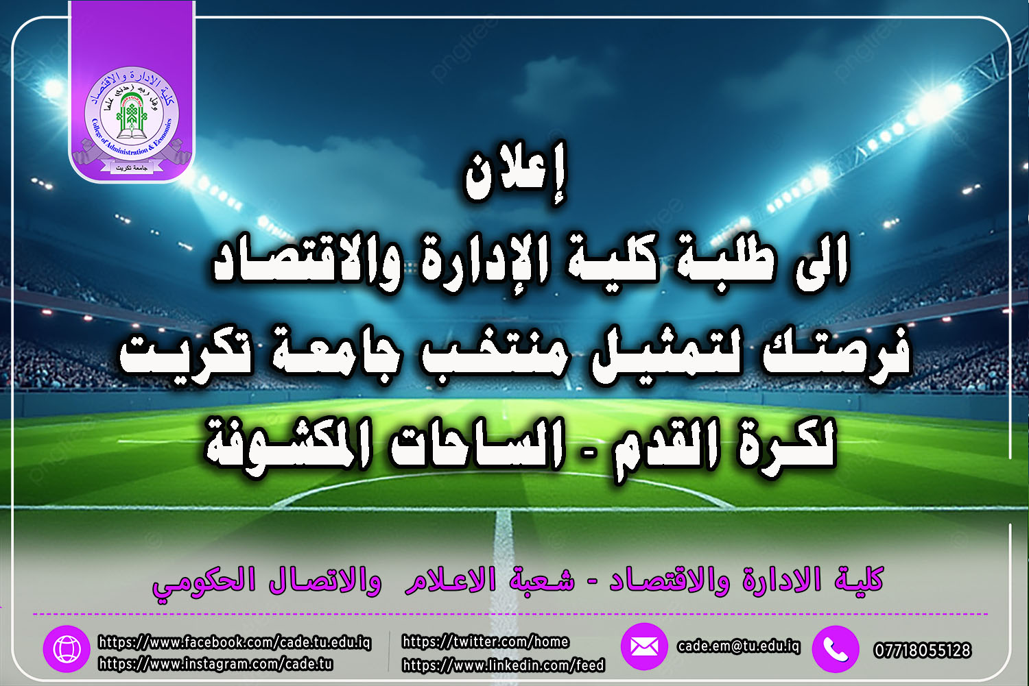 تُعلن شعبة النشاطات الطلابية في كلية الإدارة والاقتصاد / جامعة تكريت عن فتح باب المشاركة أمام طلبة الكلية الراغبين والمتميزين في رياضة كرة القدم – الساحات المكشوفة، للانضمام إلى منتخب جامعة تكريت، وذلك ضمن إطار دعم الجامعة للمواهب الرياضية وتشجيع النشاطات الطلابية.
