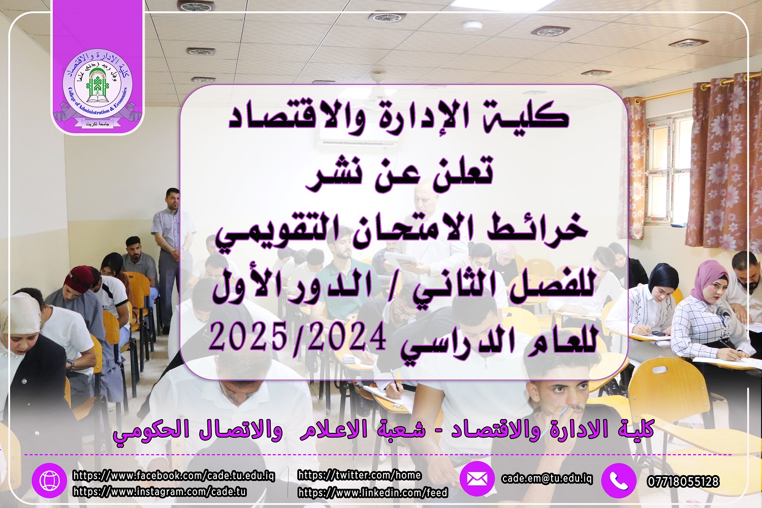 تعلن كلية الإدارة والاقتصاد / جامعة تكريت عن نشر خرائط الامتحان التقويمي (الوزاري) لطلبة المرحلتين الثالثة والرابعة في قسمي إدارة الأعمال والمحاسبة، للدراستين الصباحية والمسائية، للفصل الدراسي الثاني / الدور الأول من العام الدراسي 2024-2025. علما أنه تبدأ الامتحانات في تمام الساعة 9:00 صباحًا.