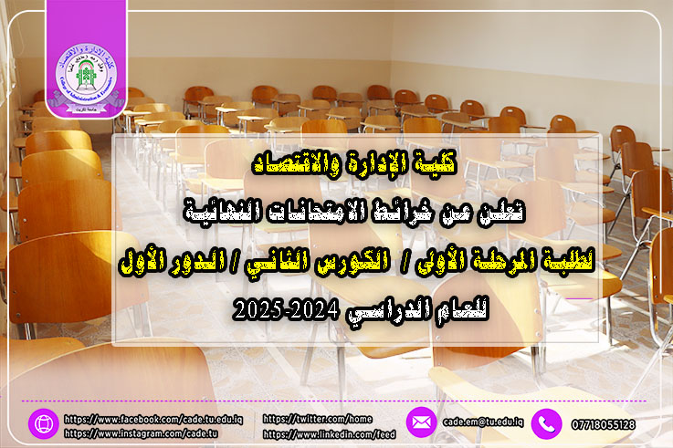 تُعلن عمادة كلية الإدارة والاقتصاد في جامعة تكريت عن نشر خرائط الامتحانات النهائية الخاصة بطلبة المرحلة الأولى، للفصل الدراسي الثاني / الدور الأول للعام الدراسي 2024-2025.