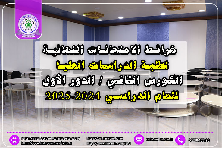 تُعلن عمادة كلية الإدارة والاقتصاد في جامعة تكريت عن نشر خرائط الامتحانات النهائية الخاصة بطلبة الدراسات العليا، للفصل الدراسي الثاني / الدور الأول من العام الدراسي 2024-2025.