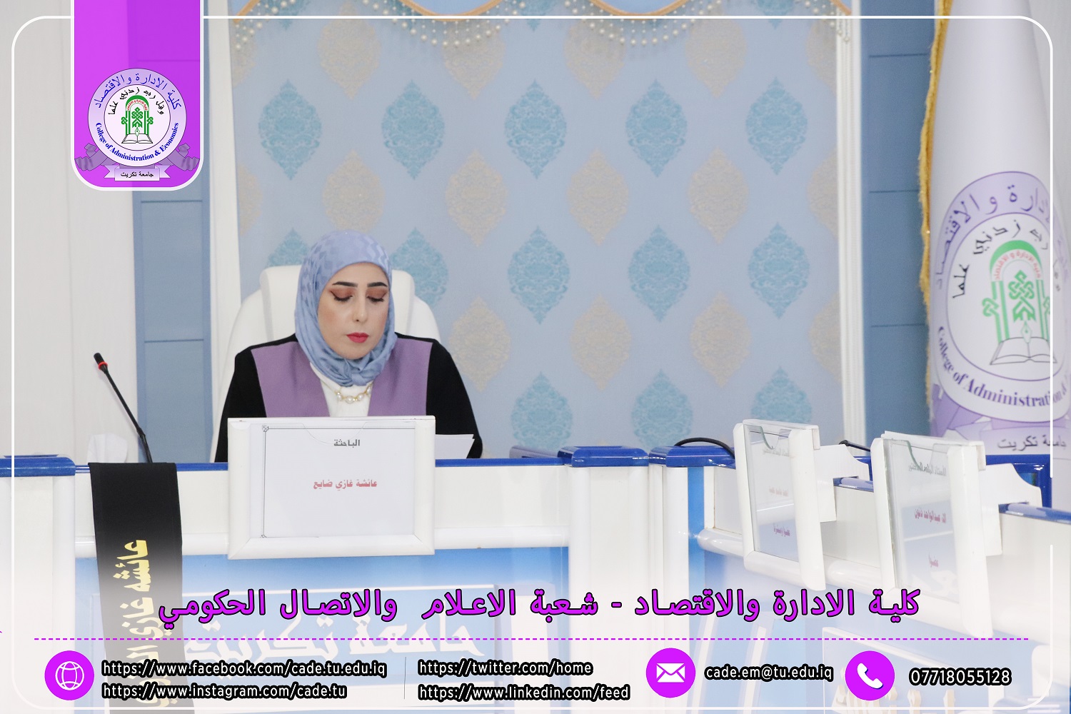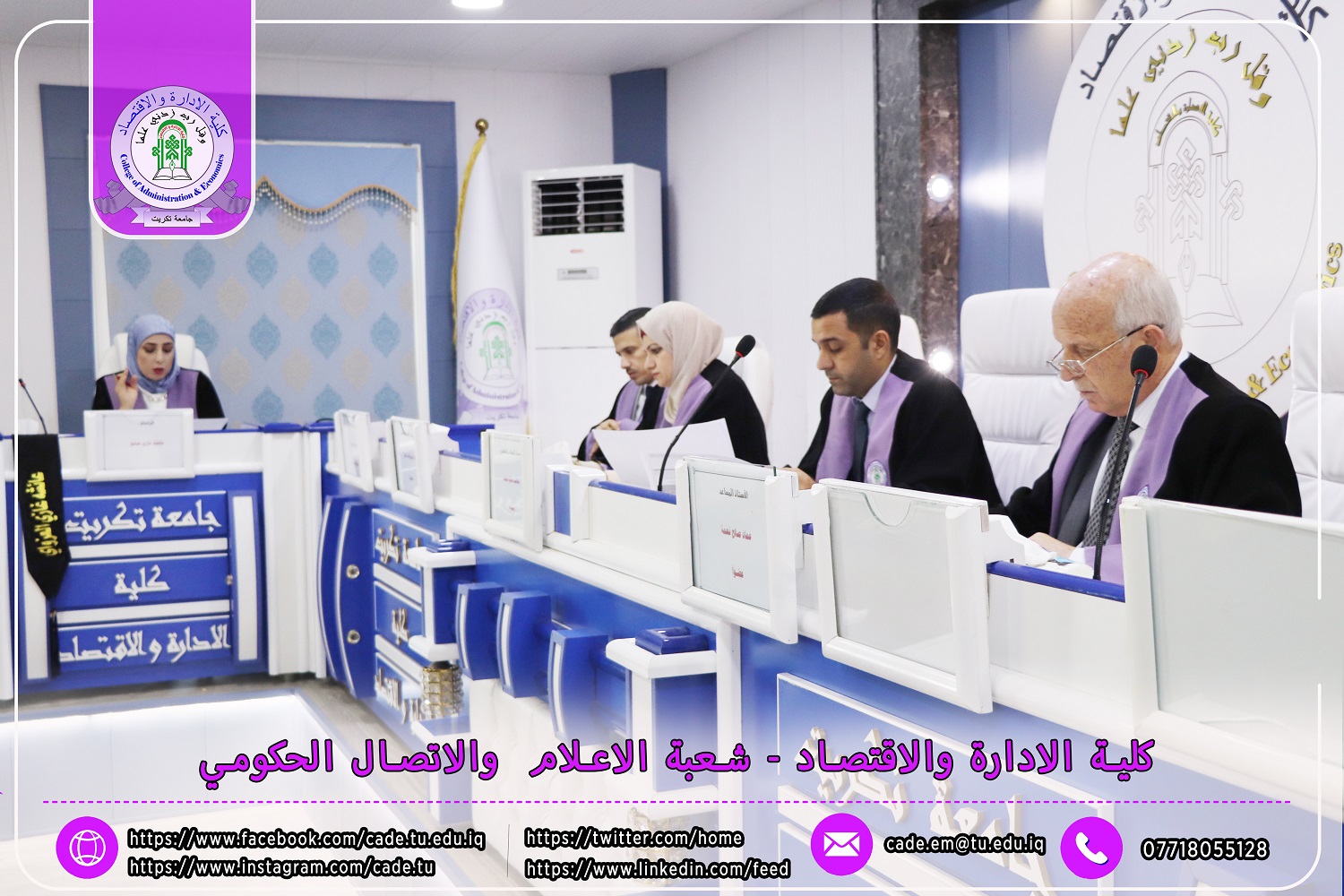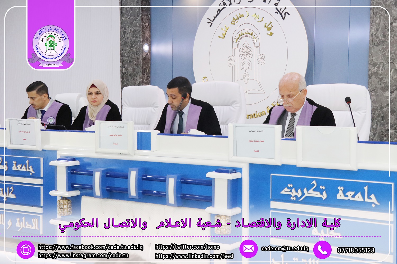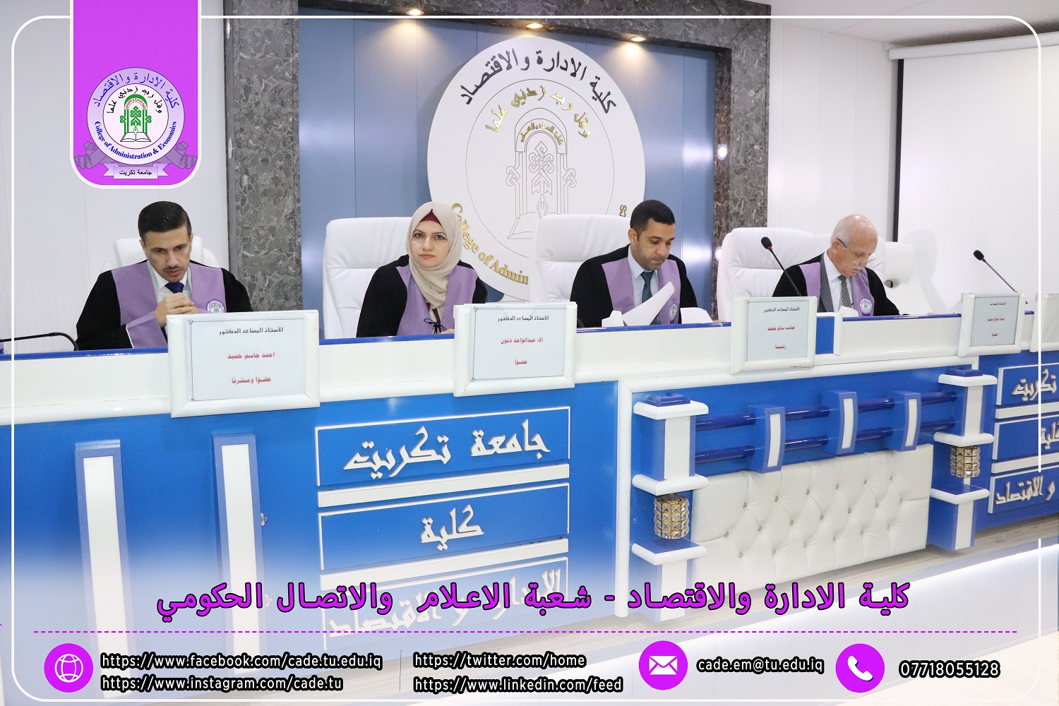 نوقشت في كلية الإدارة والاقتصاد / قسم ادارة الاعمال / رسالة الماجستير في العلوم الإدارية للطالــبة عائشة غازي ضايع الموسومة ((تأثير الخبرة المالية في التحفظ المحاسبي وانعكاسها على قيمة الشركة "دراسة تطبيقية في عينة من المصارف المدرجة في سوق العراق للأوراق المالية)) بأشراف ا.م.د. احمد جاسم حميد.