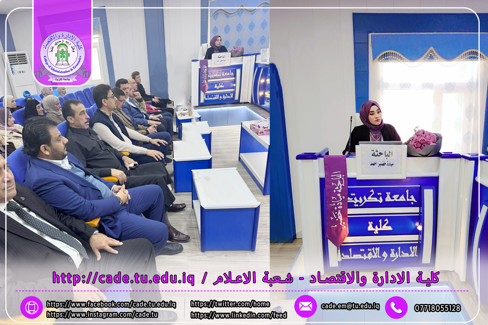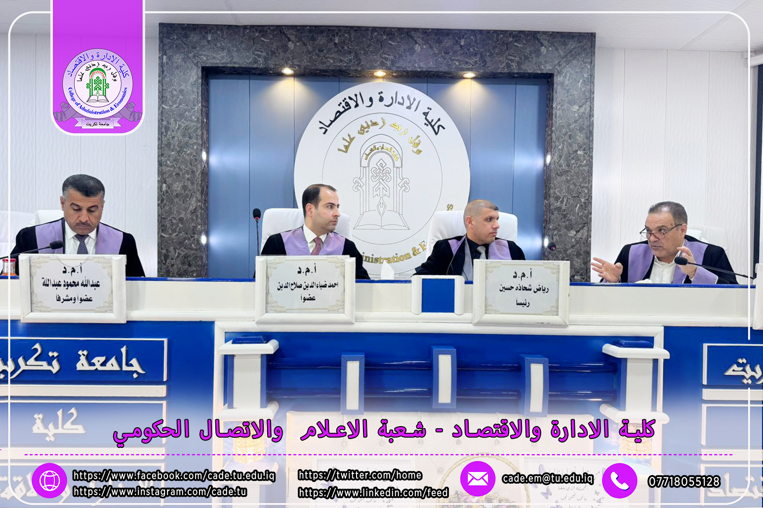 نوقشت في كلية الإدارة والاقتصاد / قسم ادارة الاعمال / رسالة الماجستير في العلوم الإدارية للطالــبة ميادة خضير احمد الموسومة ( أثر أسبقيات البراعة التنظيمية في تسويق النتاجات الفكرية: الدور الوسيط لمجتمعات ممارسة المعرفة دراسة تحليلية في جامعة تكريت) بأشراف ا.م.د.عبدالله محمود عبدالله.