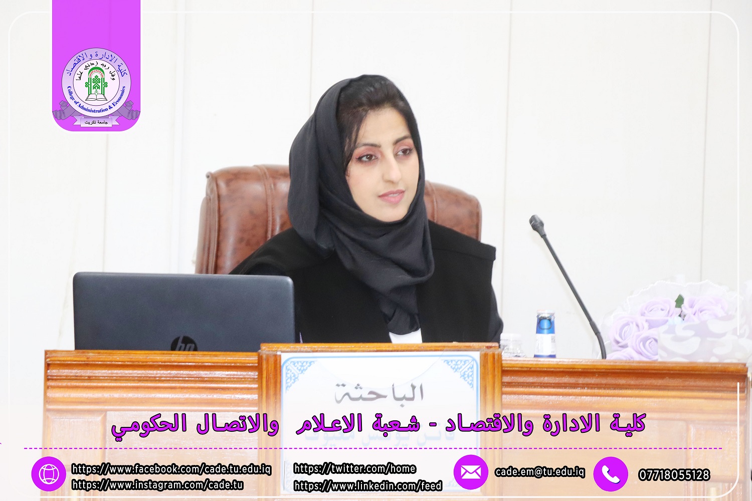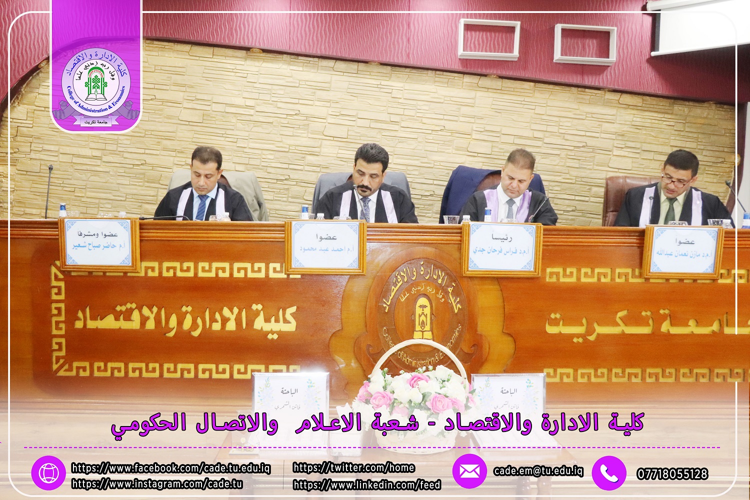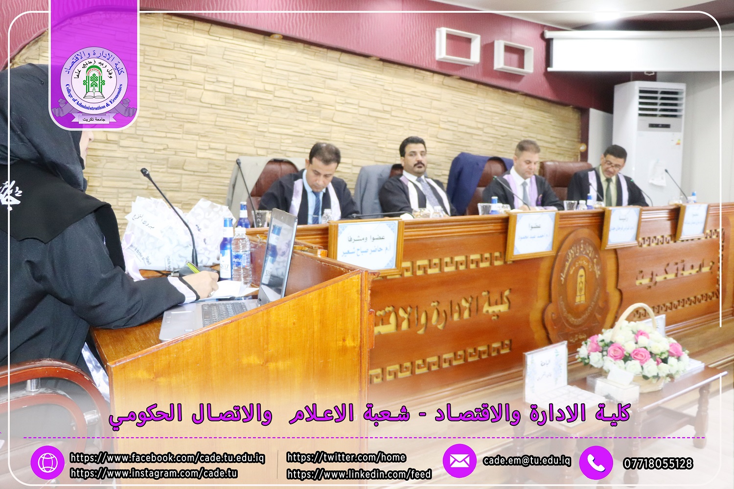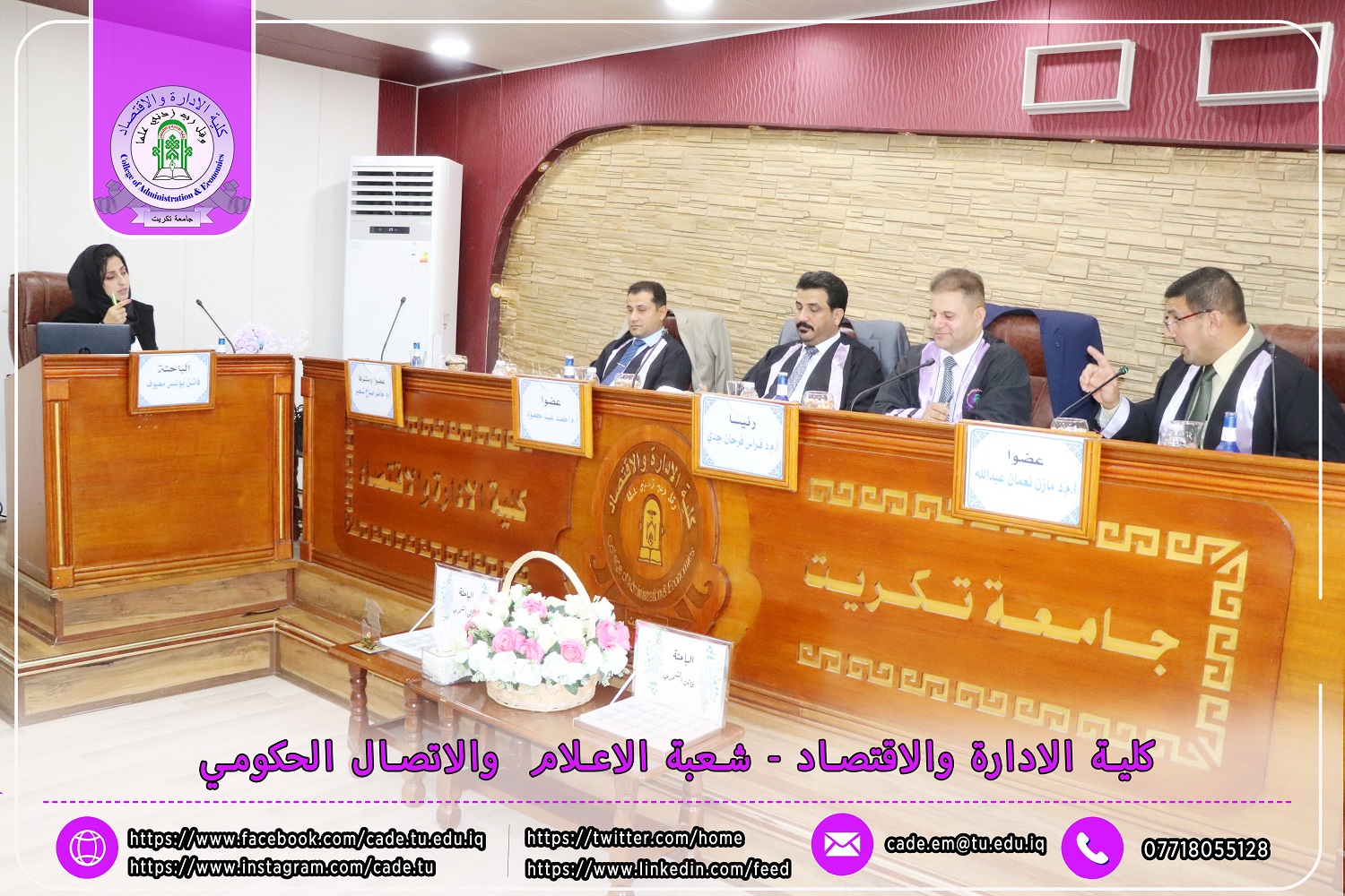 نوقشت في كلية الإدارة والاقتصاد رسالة الماجستير في العلوم المالية والمصرفية للطالــبة فاتن يونس معيوف الموسوم (دور مؤشرات السيولة في تحقيق التعافي المالي : دراسة لعدد من المصارف التجارية العراقية المختارة) بأشراف ا.د. حاضر صباح شعير.
