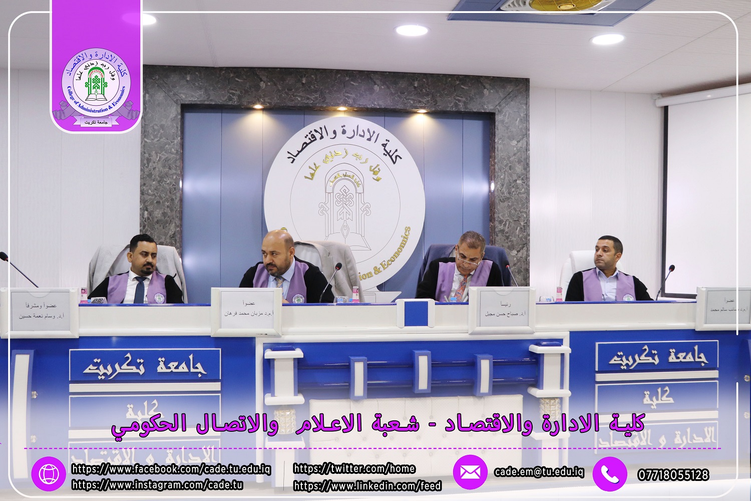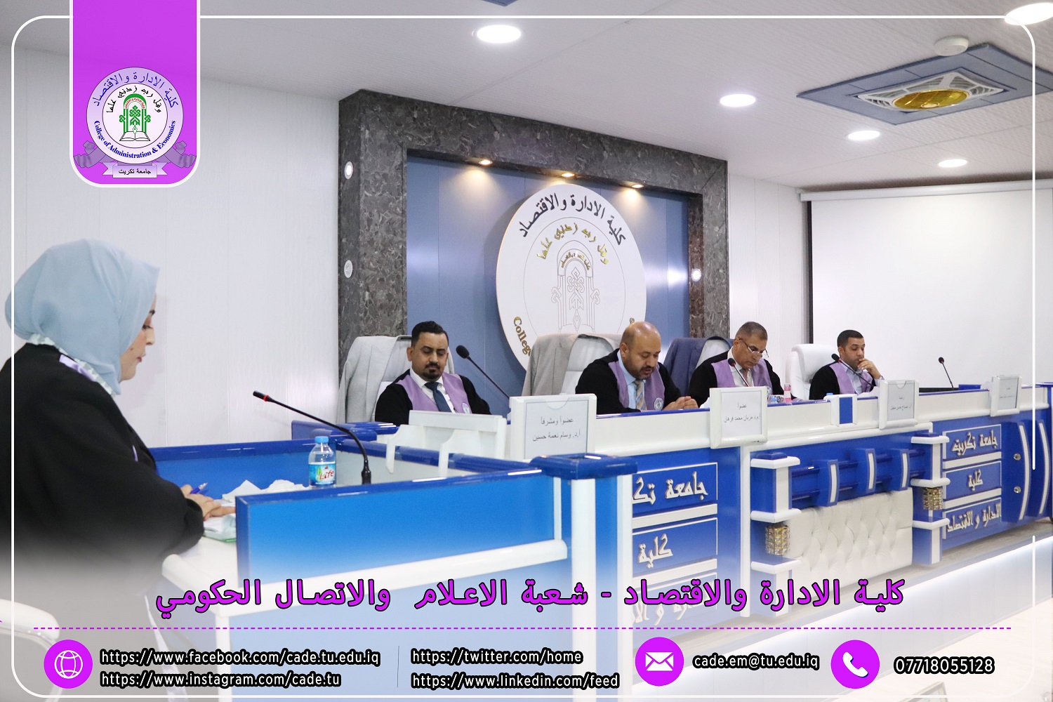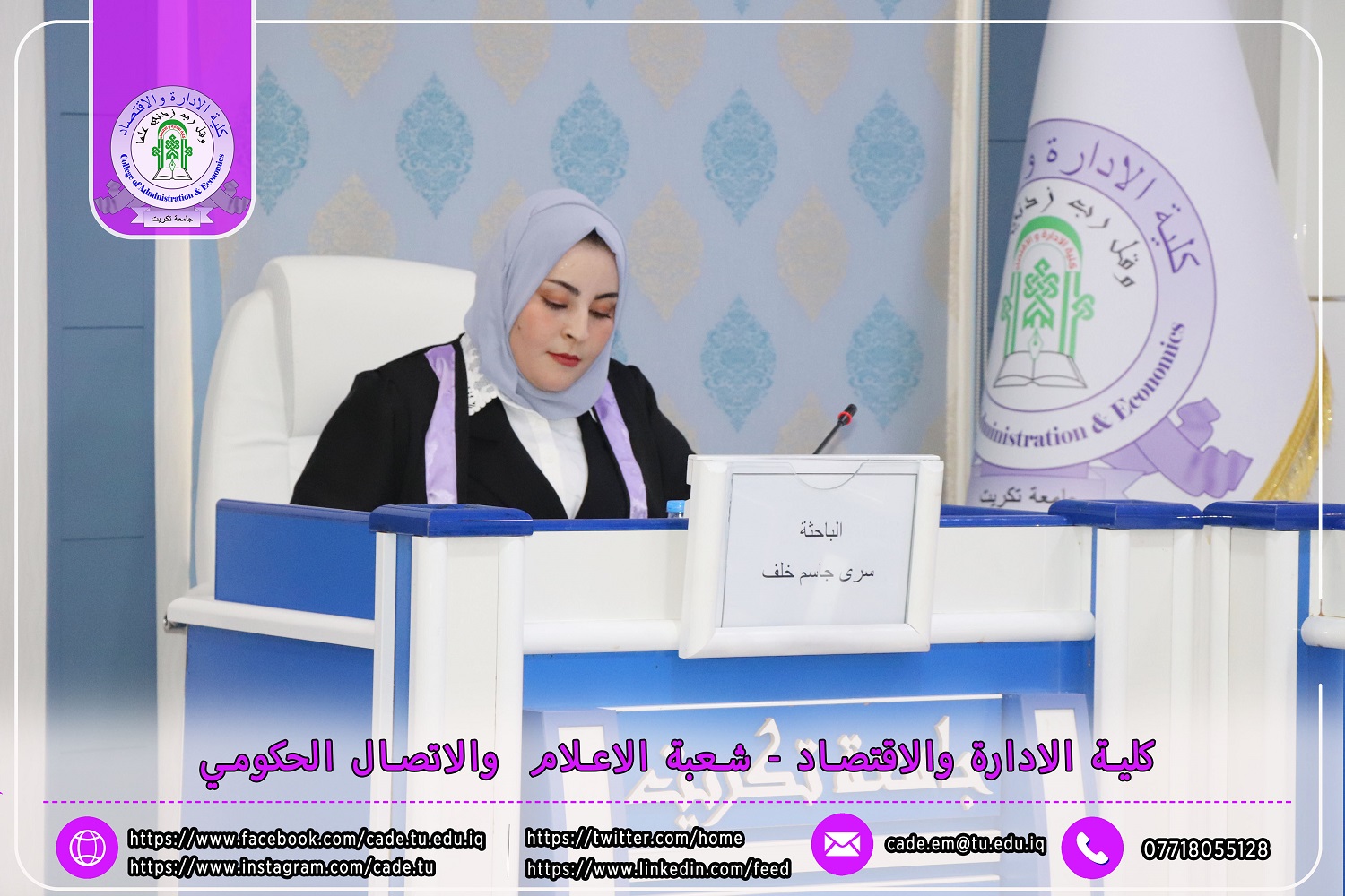 نوقشت في كلية الإدارة والاقتصاد / قسم المحاسبة / رسالة الماجستير في العلوم المحاسبية للطالــبة سرى جاسم خلف الموسومة ( تأثير لجان التدقيق في كفاءة التدقيق الداخلي وانعكاسه في مستوى الإفصاح عن معلومات تقارير الاستدامة / دراسة تطبيقية في عينة من المصارف المدرجة في سوق العراق للأوراق المالية ) بأشراف ا.د. وسام نعمة حسين.