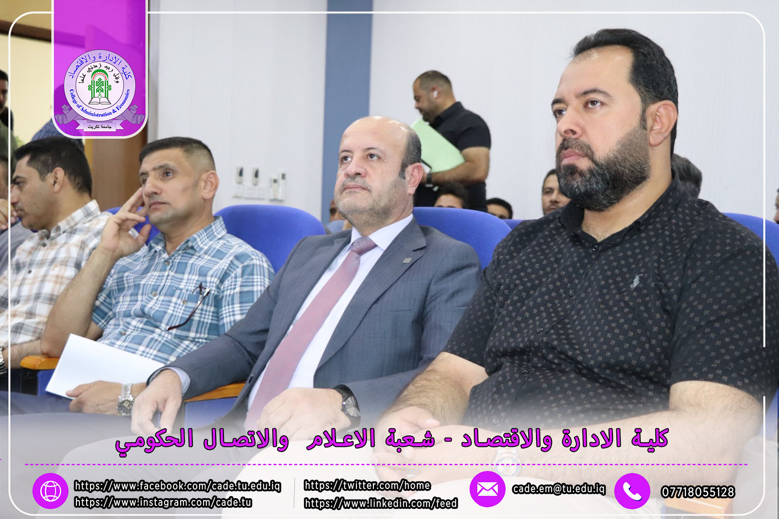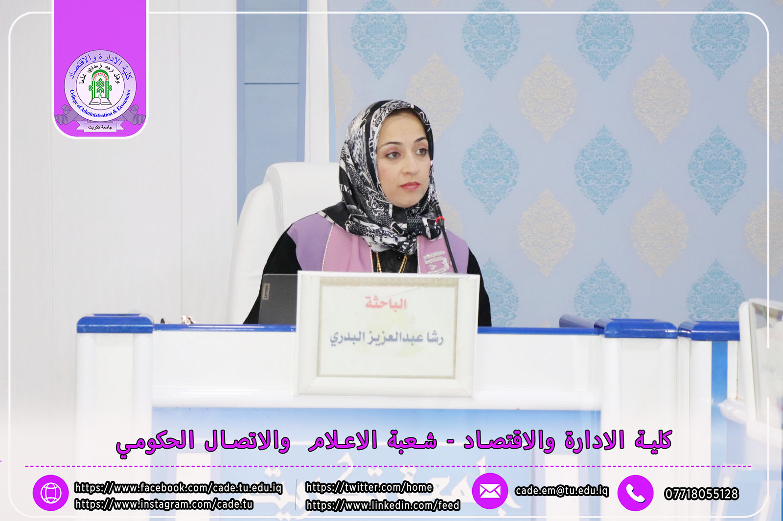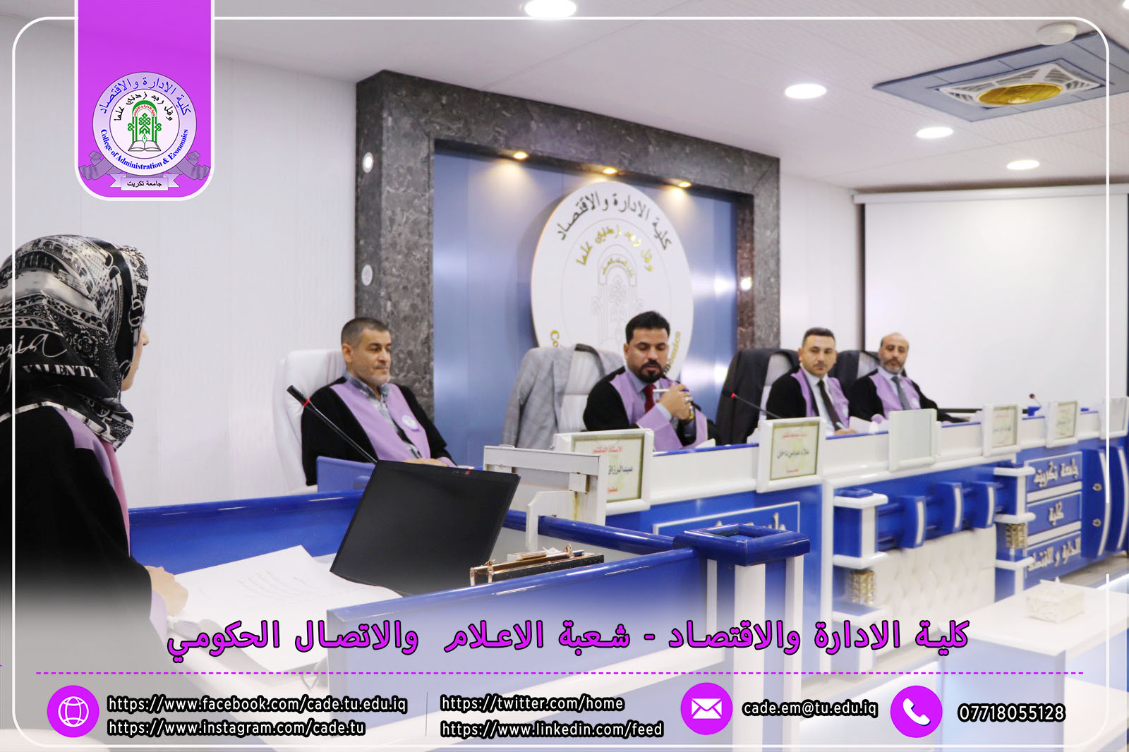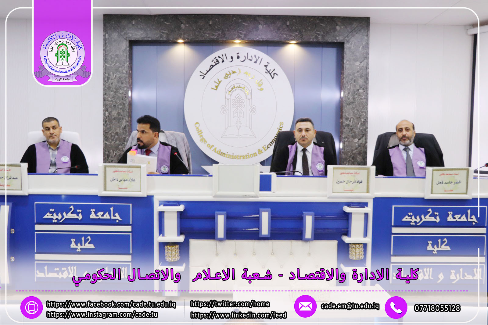 هذا وقد حضر المناقشة الأستاذ الدكتور وعد محمود رؤوف، رئيس جامعة تكريت، ومعاون العميد للشؤون الإدارية السيد أحمد عايد مخلف، إلى جانب عدد من السادة التدريسيين وطلبة الدراسات العليا.