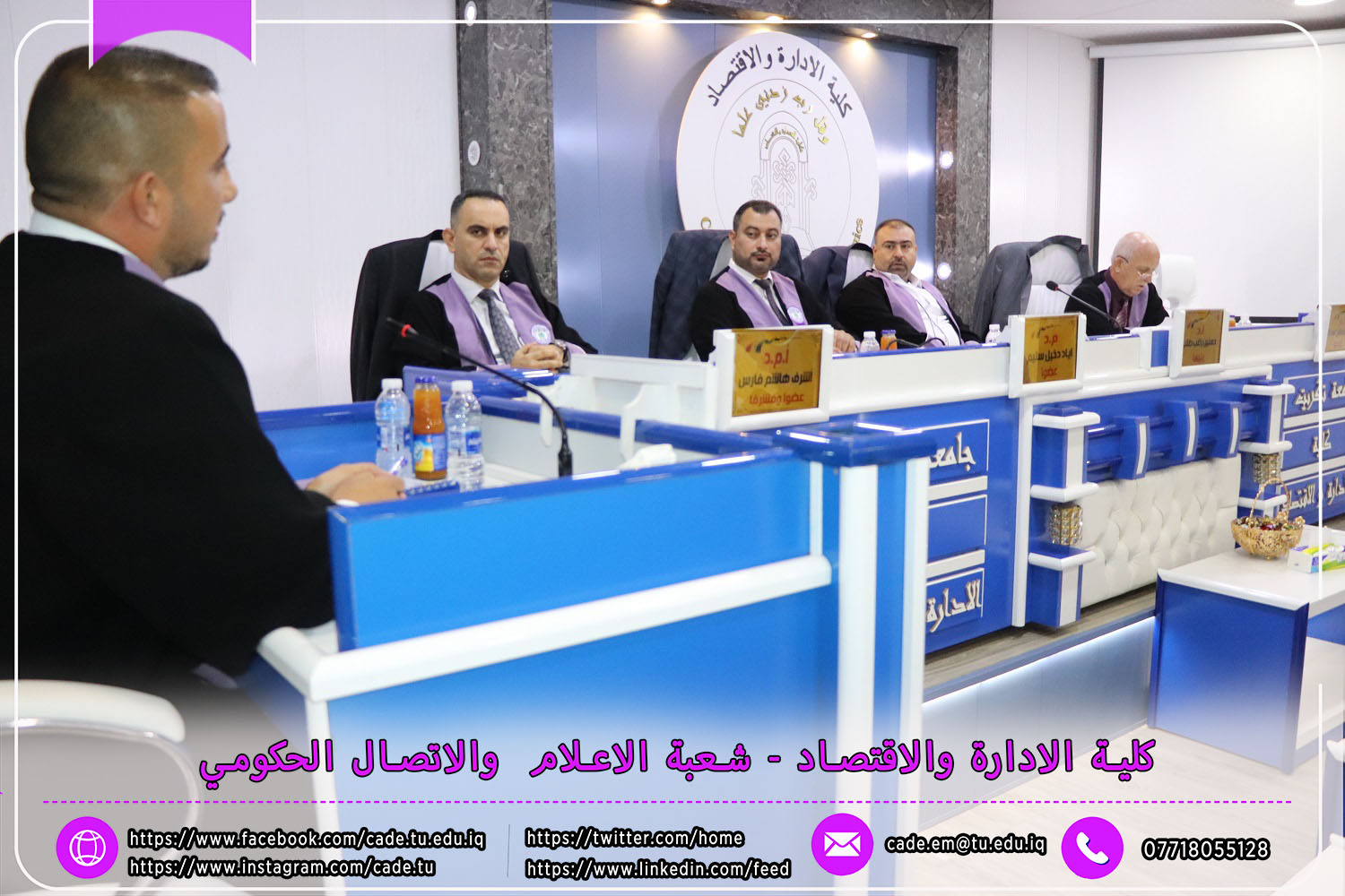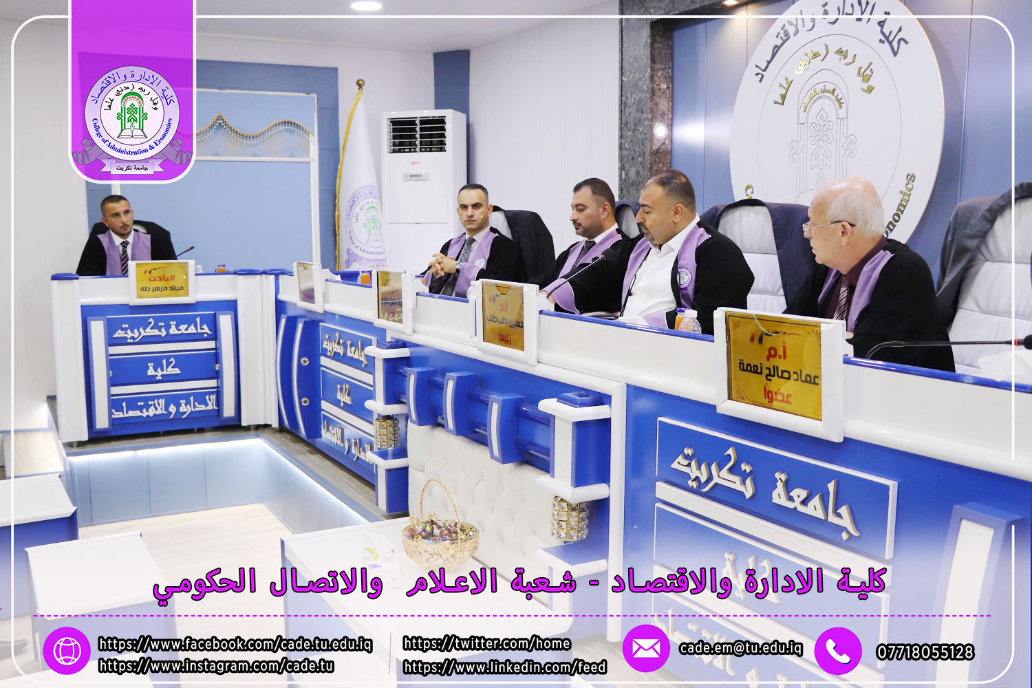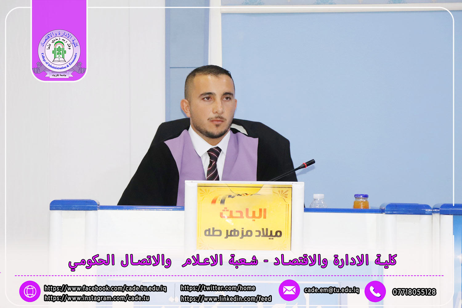 نوقشت في كلية الإدارة والاقتصاد رسالة الماجستير في العلوم المحاسبية للطالــب ميلاد مزهر طه الموسومة ((دور الرقابة الداخلية في الحد من المخاطر المصرفية وانعكاسها على جودة التقارير المالية / دراسة تطبيقية على عينة من المصارف العراقية )) بأشراف ا.م.د. اشرف هاشم فارس.