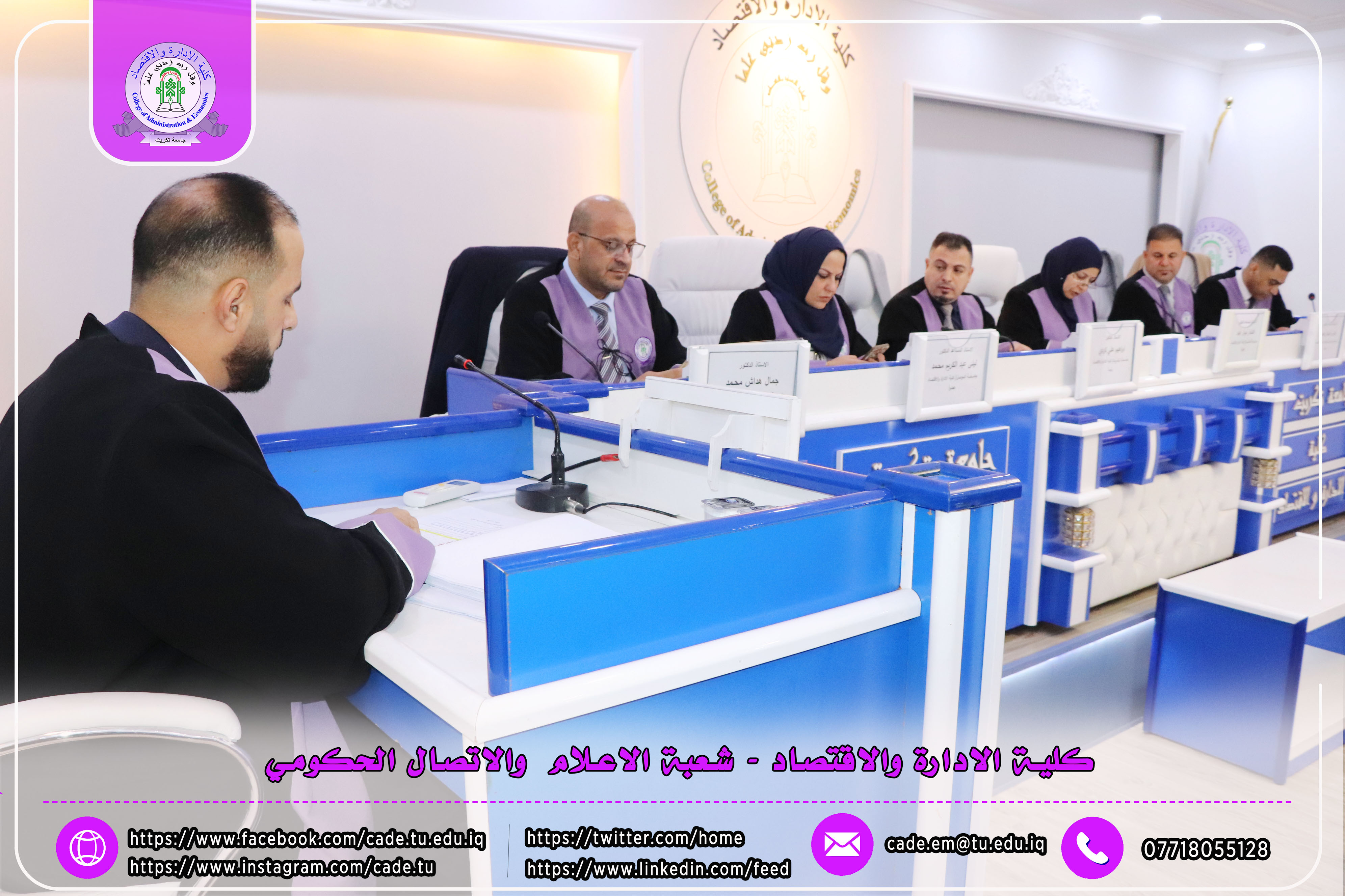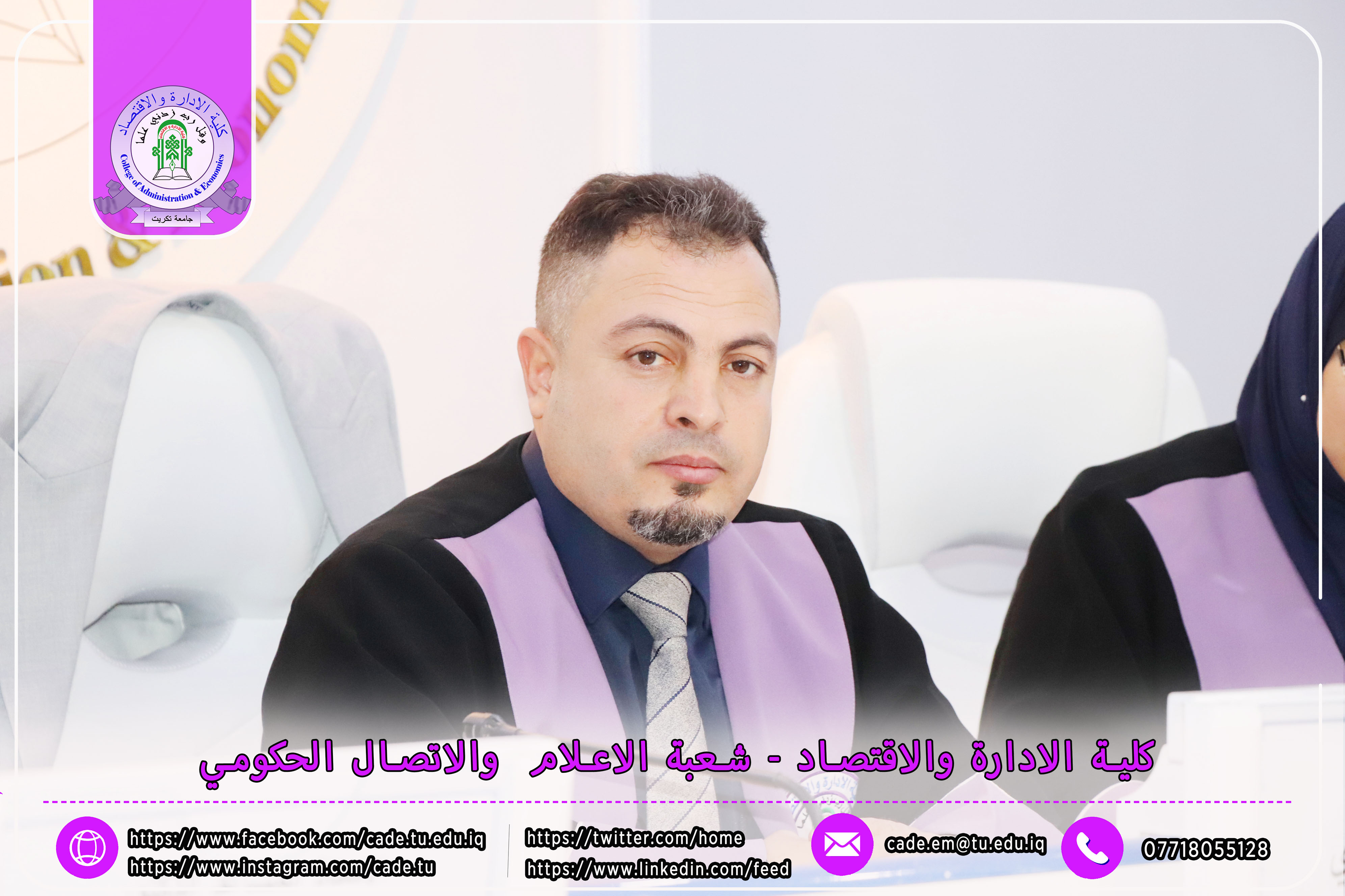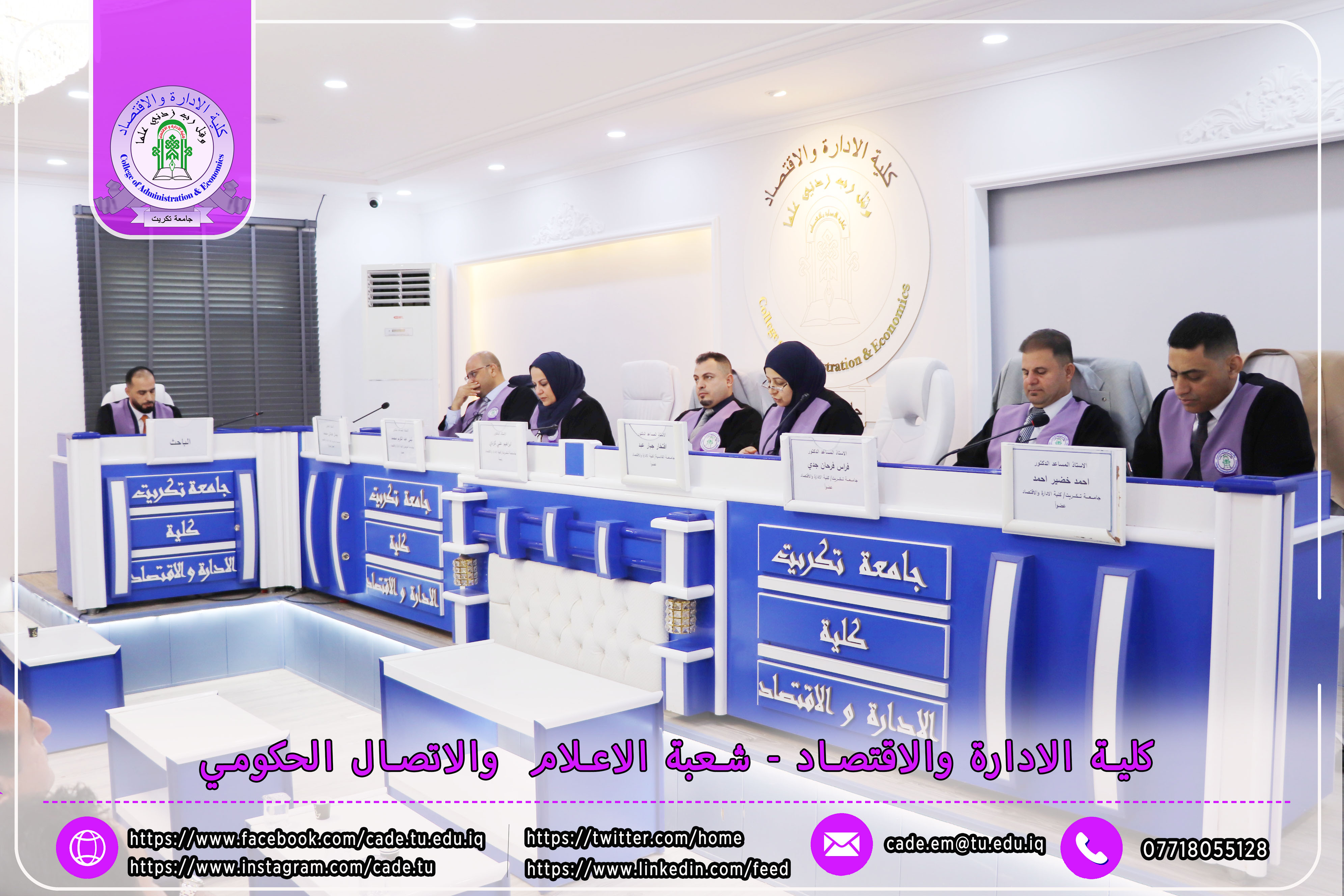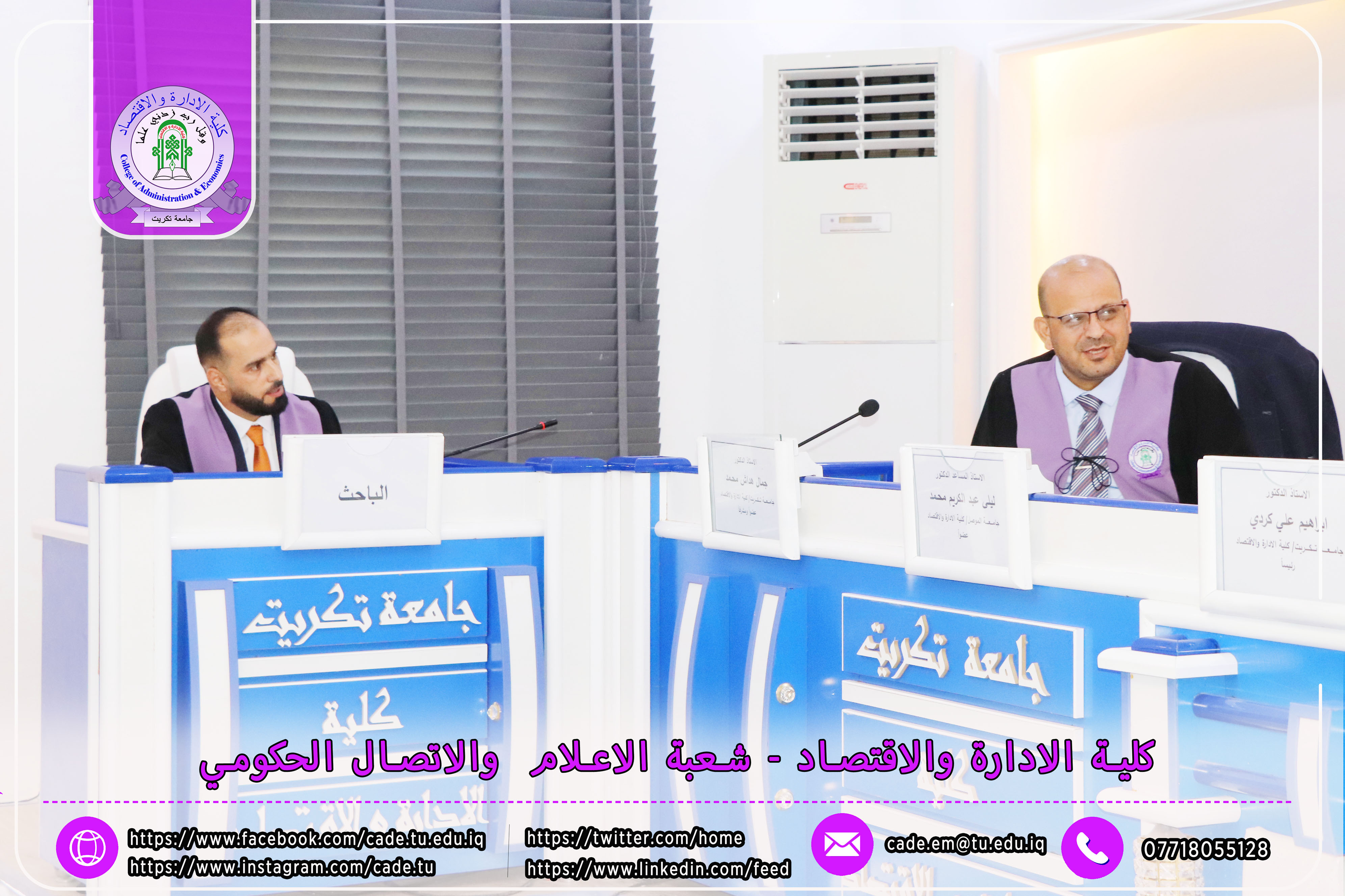 هذا وقد حضر المناقشة عميد كلية الادارة والاقتصاد أ.م.د. فؤاد فرحان حسين، ومعاون العميد للشؤون العلمية وا.م.د. خطاب عمران صالح، ومدير قسم الدراسات والتخطيط في جامعة تكريت ا.د. صالح حسن عبدالله وعدد من السادة التدريسيين وطلبة الدراسات العليا.