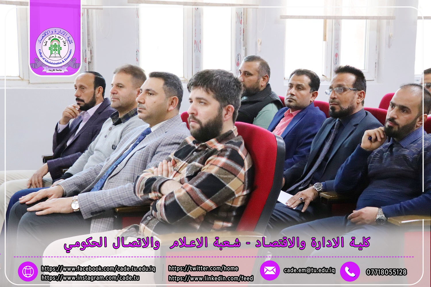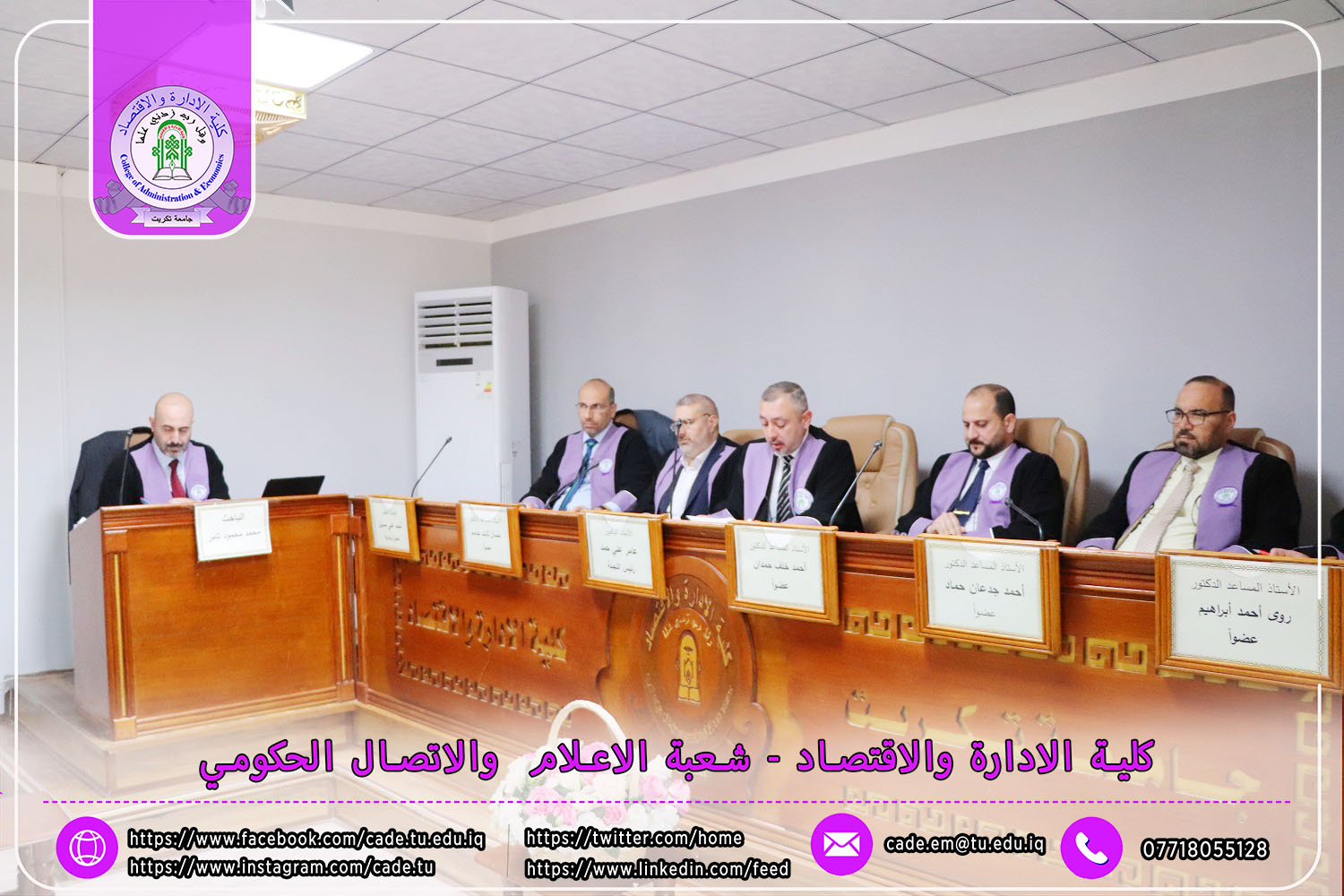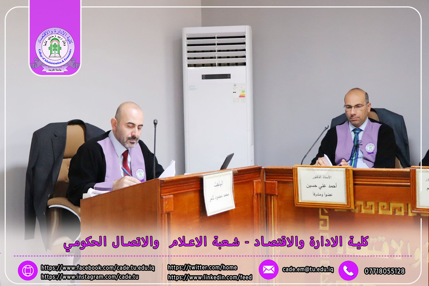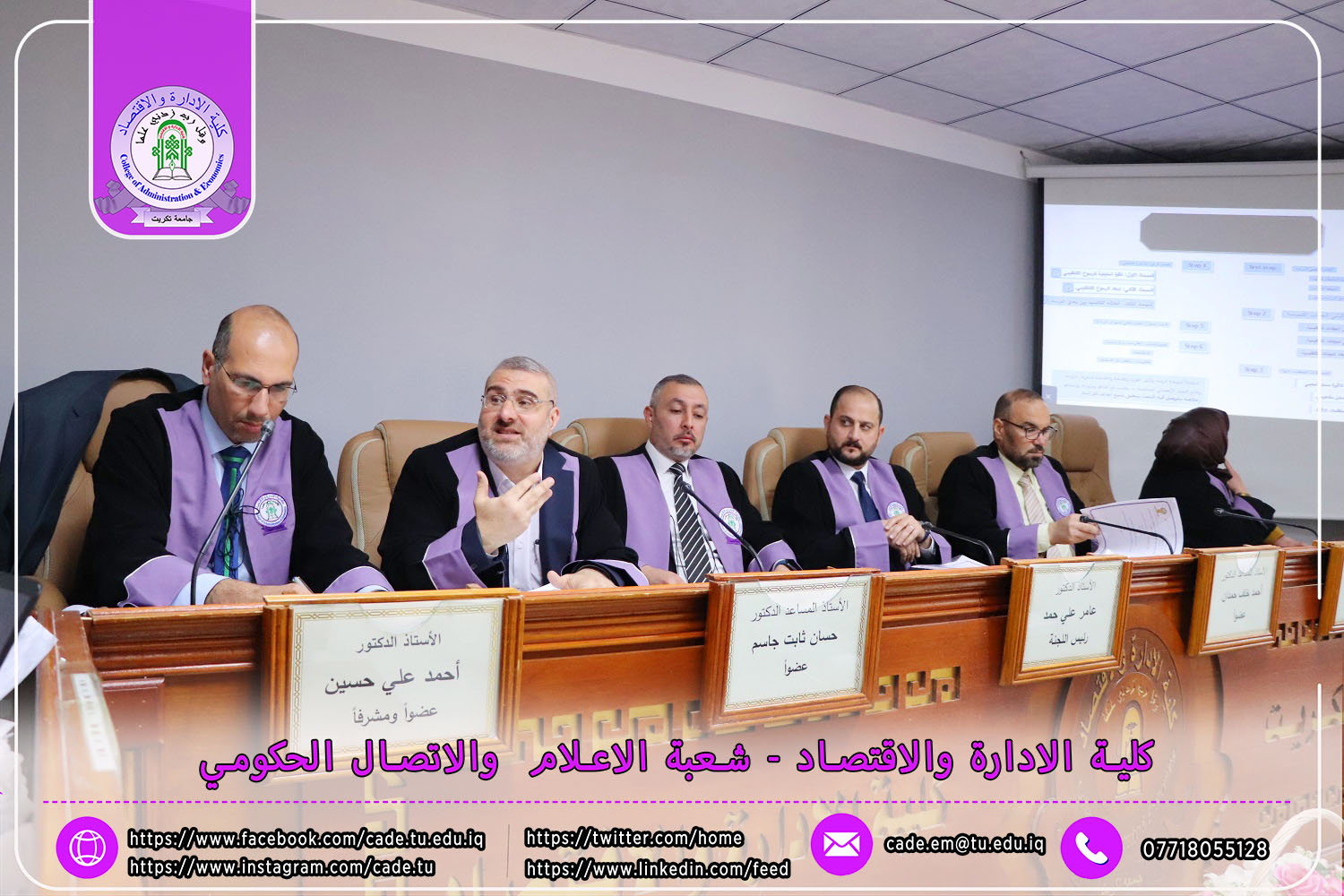 هذا وقد حضر المناقشة ا.م.د. فؤاد فرحان حسين عميد كلية الإدارة والاقتصاد وا.م.د. فراس فرحان جدي رئيس قسم ادارة التسويق ا.م.د. حاضر صباح شعير رئيس قسم الإدارة العامة وعدد من السادة التدريسين وطلبة الدراسات العليا.